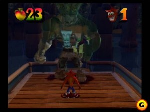 Co jeszcze platformówka musi posiadać? Walki z bossami. Szkoda natomiast, że o tych z Crash Bandicoot: The Wrath of Cortex (PS2) chciałbym najchętniej migiem zapomnieć. Bez polotu. Bez finezji. W dodatku mało w nich gry, a więcej wstrzeliwania się w odpowiedni „tor” ruchów. 4 pierwszych bossów to pojedynki z Crunchem, genetycznie zmodyfikowanym jamrajem na rozkazach Cortexa. Wiadomo, jamraj najlepiej pogonić drugim jamrajem. wspierany jedną z masek elementarnych. Maska ziemi zamienia go w skalną kulę i toczymy dziwną grę w cymbergaja, na arenie przypominającej dużą miskę. Maska wody zmusza nas do skakania po przeszkodach na wodzie…wiecie co? Tutaj się zatrzymam na chwilę. Użyłem słowa: „skakania”. Skok to chyba najważniejsza animacja każdej platformówki, a tutaj Crash porusza się ślamazarnie. Między wciśnięciem krzyżyka, a efektem na ekranie jest lag, jak jasna cholera. Z ciekawości sprawdziłem innego pada i zagrałem chwile w Crash Bandicoot 3: Warped (PS One) – na PS1 działa to o niebo lepiej. Niewybaczalne.