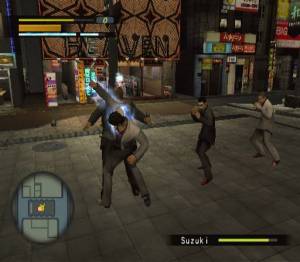 Kolejnym, stanowiącym dowód na połączenie Yakuzy z JRPG, są random encounters…no może nie tak całkiem random, ale w stylu znanym z serii „Tales of…” – przeciwnicy pokazują się na mapie i gdy przechodzimy obok jesteśmy atakowani, czemu towarzyszy bawiące mnie „What the fuck!?”, „Hey you!”. Za każdym razem śmiałem się, że wychodzi na to, że gra jest symulacją życia w Bytomiu, gdzie „Co się gapisz?!” i „Ej Ty” są wystarczającym powodem by zebrać „kiermasz butów”. Podobnie jak w większości JRPG, ekran gry przenosi się na arenę walki, zlokalizowaną na miejsce spotkania z przeciwnikiem. Sama walka przypomina mi grę The Bouncer (PS2), czyli beat’em’up z prostymi combosami, rzutami i atakami kończącymi. Możemy blokować ciosy, robić uniki, podnosić przedmioty leżąca pod nogami i naparzać nimi w przeciwników. Walki sprawiają radochę i dobrze, bo jest ich dużo. Właściwie cała gra to podążanie od ustawki do ustawki, z walkami z bossami jako „wisienką na torcie”. System walki jest na tyle prosty, by opanować go relatywnie szybko i cieszyć się z oklepywania mord oprychów. Podnosisz rowerek, uderzasz nim w leżącego wroga, by na koniec nadepnąć mu na twarz lub skoczyć na klatę – pikne! Jak już wspomniałem gra trzyma fason filmów o japońskiej mafii, z swoją brutalnością i bezpardonowością. Niestety jednak są i minusy systemu. Niezbyt dobrze działa namierzanie celów, tzw. lockowanie. Dodając do tego, że Kazuma porusza się po polu walki nieco „drewnianie”, powodowało, że bardzo często nie wyprowadzałem uderzeń w wybrane cel, a w powietrze. Szczególnie irytującym było to podczas walk w wątku fabularnym, gdzie by zwiększyć trudność stawiano nam naprzeciw uzbrojonych w broń palną oprychów – tych przydałoby się rozwalić priorytetowo, a nie było to takie proste. Drugim mankamentem jest praca kamery, co też powiązane jest z brakiem sensownego lockowania się na konkretnym celu. Tu natomiast najdobitniej odczułem to w walkach z bossami, którzy bardzo szybko wykonywali side-stepy i biegali po całej arenie. Było to irytujące, ale by nie negować dobrej zabawy z walk, to muszę powiedzieć, że Yakuza (PS2) zatrzymała mnie tylko kilka razy na dłużej, zazwyczaj na bossach i przeważnie z własnej winy, gdzie po kilku grupach pokonanych przeciwników, dochodziłem do bossa bez życia i przedmiotów leczących.