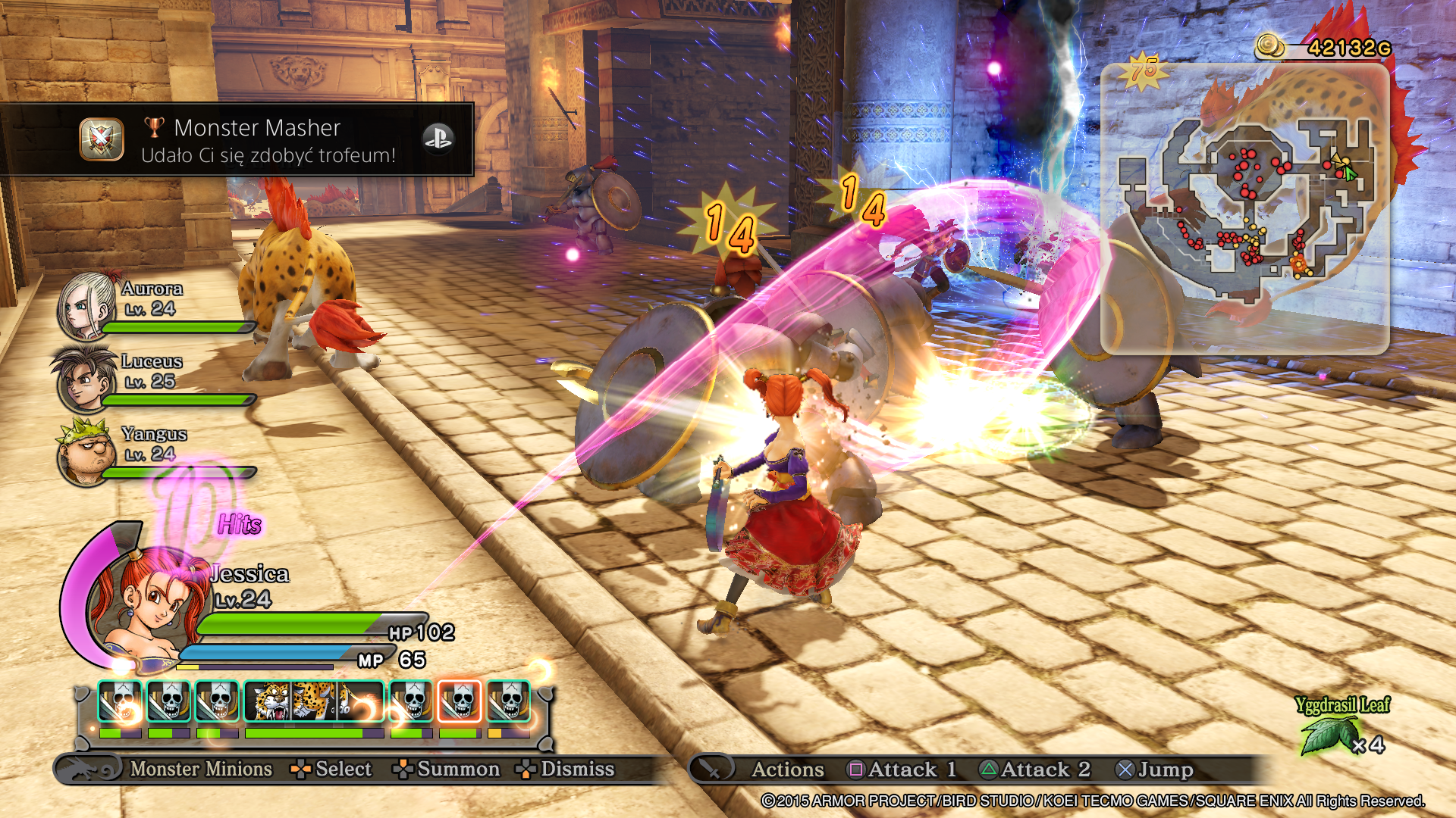 Powyższy akapit skłania mnie do przekonania, że jeśli miałbym do czegoś porównać walkę oraz to, jak się gra w ten spin-off to stawiałbym na serię Kingdom Hearts, a przynajmniej – najlepiej mi znanych – dwóch części z PS2. Dwa przyciski ataku, skok, odpalania coup de grace i ataki specjalne będące kombinacją powyższych z przyciskiem R1. Koniec. Tyle, jeśli chodzi o skomplikowanie systemu. Czy to źle? W żadnym wypadku. Prostota systemu wraz z efektami wizualnymi towarzyszącymi umiejętnością świetnie pasują do stylu gry i pozwalają w „radosny” sposób pozbywać się hord przeciwników. Kulminacyjnym punktem walk są ataki specjalne, wspomniane coup de grace. Odmienny dla każdego bohatera (poza parą „najgłówniejszych”) sieje zniszczenie na sporym obszarze wokół nas, w bardzo efektownym stylu – np. zamiana w smoka. Kolejnym elementem Dragon Quest Heroes: The World Tree’s Woe and the Blight Below (PS4) jest możliwość przyzywania potworów do walki po naszej stronie. Dzieje się tak za sprawą monet, które często pozostawiają po sobie pokonani przeciwnicy. Różne potwory, posiadają różne efekty pojawienia się na polu walki (np. rzucenie jakiegoś „buffa” na naszą grupę), a także sposób działania – pozostają na polu walki z paskiem życia i atakują, bądź używają jakiejś magicznej umiejętności i znikają. Bardzo fajny pomysł, nadający elementy strategii do zadań. Albowiem gra to połączone ze sobą fabularnie misje.