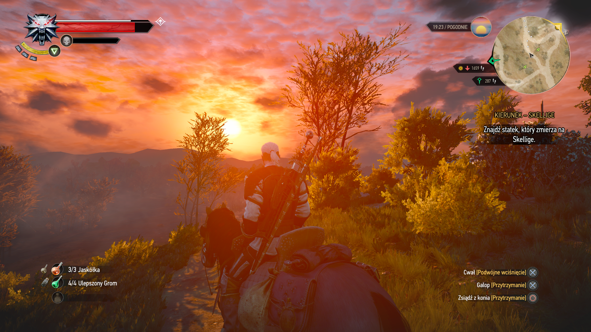Ukończenie gry zajęło mi 3 miesiące, regularnej lecz spokojnej gry. Bywały dni, gdy z Geraltem spędziłem ponad 10h, ale przeważnie kończyło się na kilku godzinnych partyjkach. Niestety czas, który jest liczony wewnątrz gry odnosi się do wewnętrznego czasu gry – w końcu mamy w niej do czynienia z prawdziwym cyklem dnia i nocy. Z tego powodu nie jestem w stanie powiedzieć ile dokładnie zajęło mi przejście tytułu. Grałem na przedostatnim poziomie trudności z zaliczaniem wszystkich zadań pobocznych stających na mojej drodze oraz czyszczeniu lokacji z znaków zapytania. Pozostawię Was, więc z taką odpowiedzią o czas z produkcją: SPORO 🙂