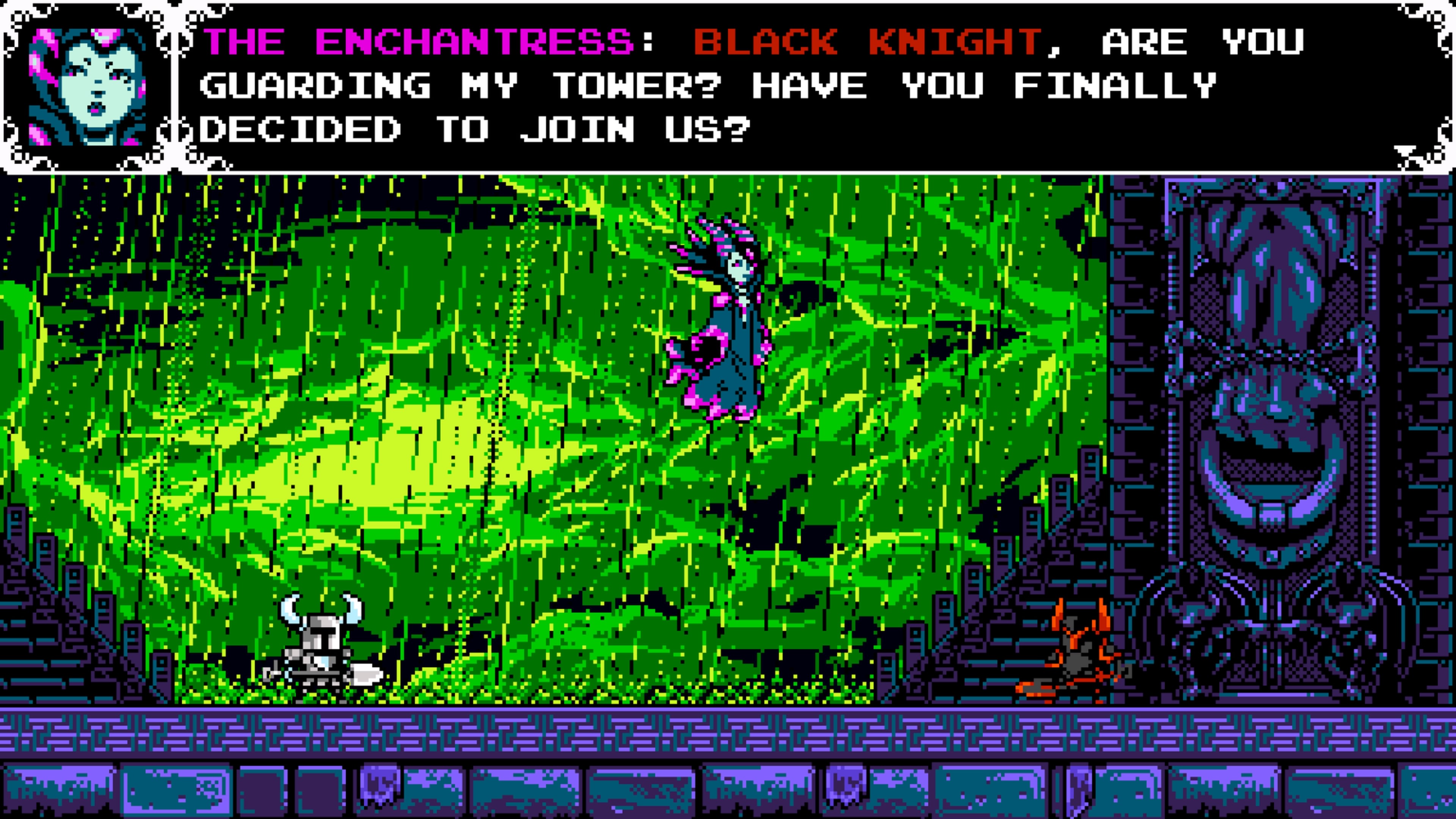 W kontekście fabularnym twórcy nie zboczyli ze ścieżki, którą nakreślili sobie rozgrywką. Postawili na pozorną schematyczność i przewidywalność, którą poniekąd nas od początku gry zmylili, by u końca wędrówki wywrócić nas do góry nogami. Grę rozpoczyna intro opisujące historię w jakiej się znaleźliśmy. Shovel Knight wraz ze swoją wierną towarzyszką broni Shield Knight przeżył wiele przygód i stoczył wiele zwycięskich bitew. Jedną z nich była walka w Tower of Fate, gdzie wspólnie przeciwstawili się najgorszemu złu. Gdy zwycięstwo było na wyciągnięcie ręki, mityczny amulet pochłonął bohaterów w magicznym zaklęciu. Shovel Knight stracił przytomność, a gdy się obudził znalazł tylko hełm swojej towarzyszki i zapieczętowane wejście do wieży. W rozpaczy nad utratą bliskiej mu osoby, postanowił zaprzestać życia w przygodzie i zajął się uprawą pola. Gdy jednak wspomniana wieża znów zaczęła emanować złowieszczą energią, wyciągnął łopatę z ziemi i ruszył w jej kierunku. Na jego drodze stanął The Order of No Quarter, grupa rycerzy pod wodzami The Enachntress. Tytuł przez większość czasu utrzymuje nam w przekonaniu, że mamy do czynienia z bardzo prostolinijną historią, jedynie skrzętnie sugerując nam, że uczestniczymy w czymś bardziej skomplikowanym niż „ratowanie księżniczki zamkniętej w wieży zamku”. Robią to m.in. poprzez wszechobecny humor. Twórcy bawią się tą formą przygodówki, tak samo jak bawią się nostalgiczną rozgrywką i retro wykonaniem, by finalnie dać coś znacznie więcej.