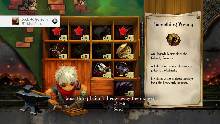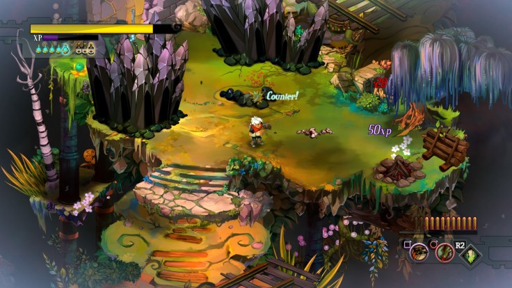 Bastion (PS4) od strony rozgrywki przypominają prostego hack’n’slasha czy action-rpg, w którym będziemy skakać od liniowej lokacji do liniowej lokacji, w przerwach wracając do “huba” zmienić uzbrojenia, cechy dzieciaka, ulepszyć bronie i oddać specjalne zlecenia za walutę. Kid posiada atak wręcz i dystansowy, umiejętność specjalną, blok tarczą oraz turlanie – tyle z ekstrawagancji w gameplay‘u. Próżno szukać tutaj innowacji pokroju systemu walki następnego dzieła Supergiant Games, choć twórcy zadbali o urozmaicenie czasu z tytułem poprzez przygotowanie sporego arsenału broni. W sumie jest 10 unikalnych broni, po pięć dla ataków wręcz i na odległość. Każda z broni posiada specjalny atak, do którego użycia zużywamy czarne butelki zbierane podczas ogrywania poziomów. Te również nie grzeszą rozbudowaniem. Przemierzamy je jedną, jedyną, możliwą ścieżką do końca i wracamy do Bastionu, a w nim sporo możliwości. Poza wspomnianymi NPC-ami, znajduje się tutaj “browar”, w którym z mieszanek różnych trunków sporządzamy alkohol (niegrzeczny ten “dzieciak”), zmieniający cechy głównego bohatera. Zwiększający punkty życia, podnoszący siłę ataku lub prawdopodobieństwo obrażeń krytycznych. Zbrojownia służy do zmiany rynsztunku, a kuźnia do jego ulepszania. Wymagający gracze mogą w świątyni umieścić figurki bożków, aby zwiększyć doświadczenie i mamonę otrzymywaną po pokonaniu przeciwników, którzy w zamian stają się silniejsi – to kolejny z elementów stający się dla mnie wyznacznikiem studia, ale nie jedyny. Zwiększanie sobie poprzeczki trudności gry widzieliśmy już w Transistor (PS4), podobnie jak i wyzwania poboczne skupiające się na “masterowaniu” konkretnej broni lub pokonaniu fali przeciwników. Znów druga produkcja studia miała ten element bardziej rozwinięty, co jest zrozumiałe gdyż…była drugą.