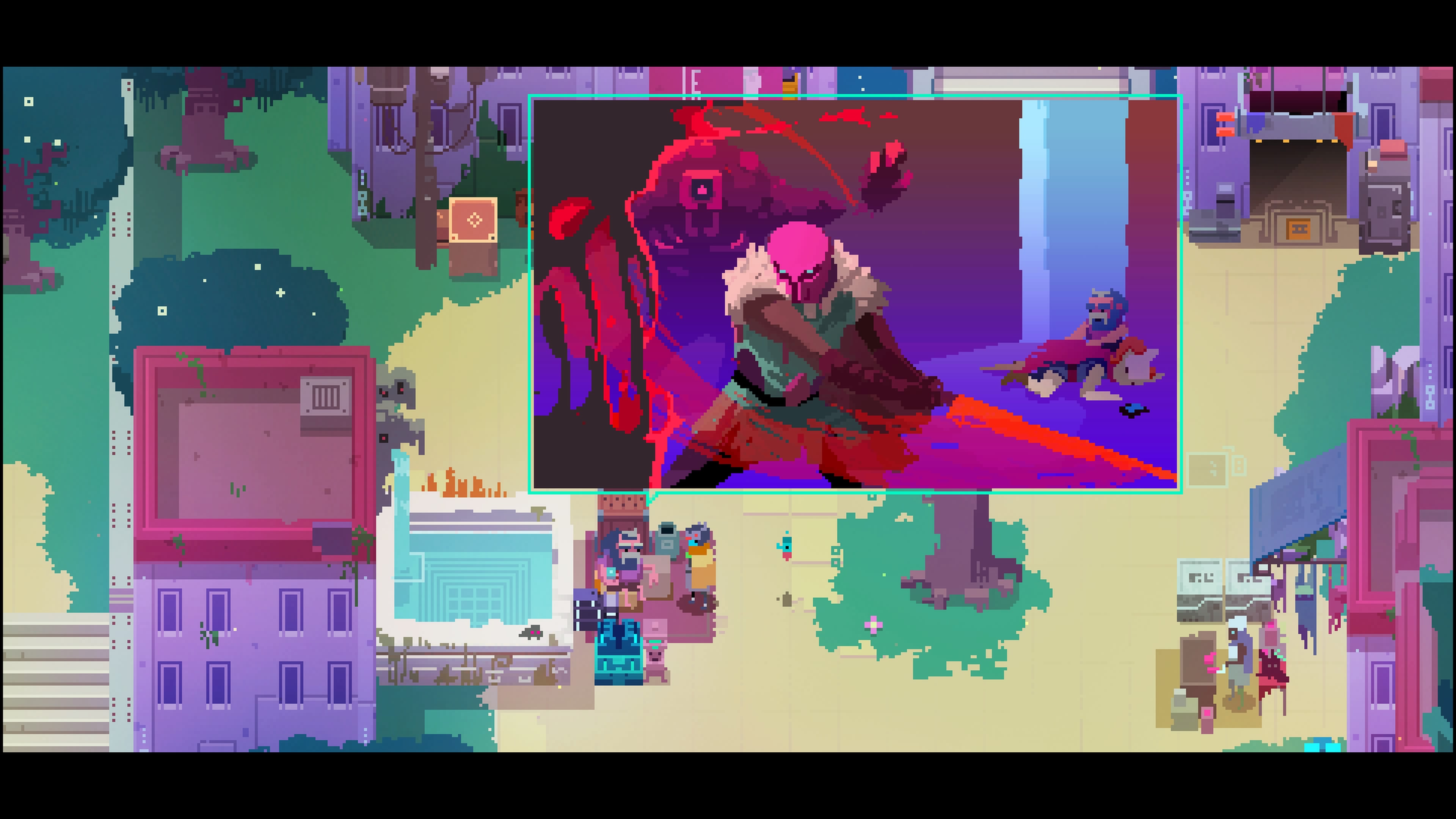 Ta część recenzji przychodzi mi ze sporym trudem. Będąc zupełnie szczerym, zastanawiałem się, czy w ogóle poruszać ten wątek pisząc recenzje tytułu, który tak wiele zawdzięcza klimatowi. Nie zrobiłbym tego, gdyby nie fakt, że wiąże się z tym jeden z minusów produkcji, a ponieważ jest ich tak mało, to muszę. Przechodząc grę, sporo rzeczy będzie dla Was zupełną zagadką. Poczynając od mega tajemniczego intra, po chorobę głównego bohatera, która powoduje, że od czasu do czasu złapie się za pierś i wypluje na podłoże plamę krwi. Co to za pies pojawia się zawsze na ostatniej prostej do bossa? Dlaczego po otwarciu jednej z czterech pieczęci włazu na środku miasta, bohater nawiedzany jest przez powtarzające się wizje własnej śmierci? Brzmi ciekawie? Jak cholera! Warto jednak wiedzieć, że gra nie da wam odpowiedzi na tacy. W Dark Souls nauczono nas szukać historii otaczającego świata w opisach przedmiotów i rozmowach z NPC-ami. Destiny natomiast pokazało, że umieszczenie lore daleko poza samą grą, nie jest najlepszym pomysłem. Hyper Light Drifter zaczerpnął niestety po trochu z obu rozwiązań, co przekłada się na uczucie niedosytu z zakończenia. Z bólem serca o tym wspominam, gdyż kiedy już siadałem przed konsolą, byłem tak pochłonięty całą atmosferą zagrożenia i podróży w nieznane, że potrafiłem jedynie myśleć o uzyskaniu kolejnych odpowiedzi. Gra sama w sobie mówi wiele, jednak do pełnego zrozumienia musimy sięgnąć po informacje ukryte na stronie Kickstartera tytułu oraz zewnętrznego tłumacza zmyślonego języka świata gry. Oliwy do ognia dodaje fakt, że sami twórcy nie potwierdzili, żadnej z fanowskich interpretacji. Z jednej strony to rajcujące, aczkolwiek moim zdaniem można było takie rzeczy jak translator starożytnej mowy świata gry, umieścić np. w odblokowanym po ukończeniu trybie NG+. Pozostaje samemu układać sobie fakty w głowie, szukać teorii innych i dopasowywać je do własnych – to chyba nie takie straszne, co?