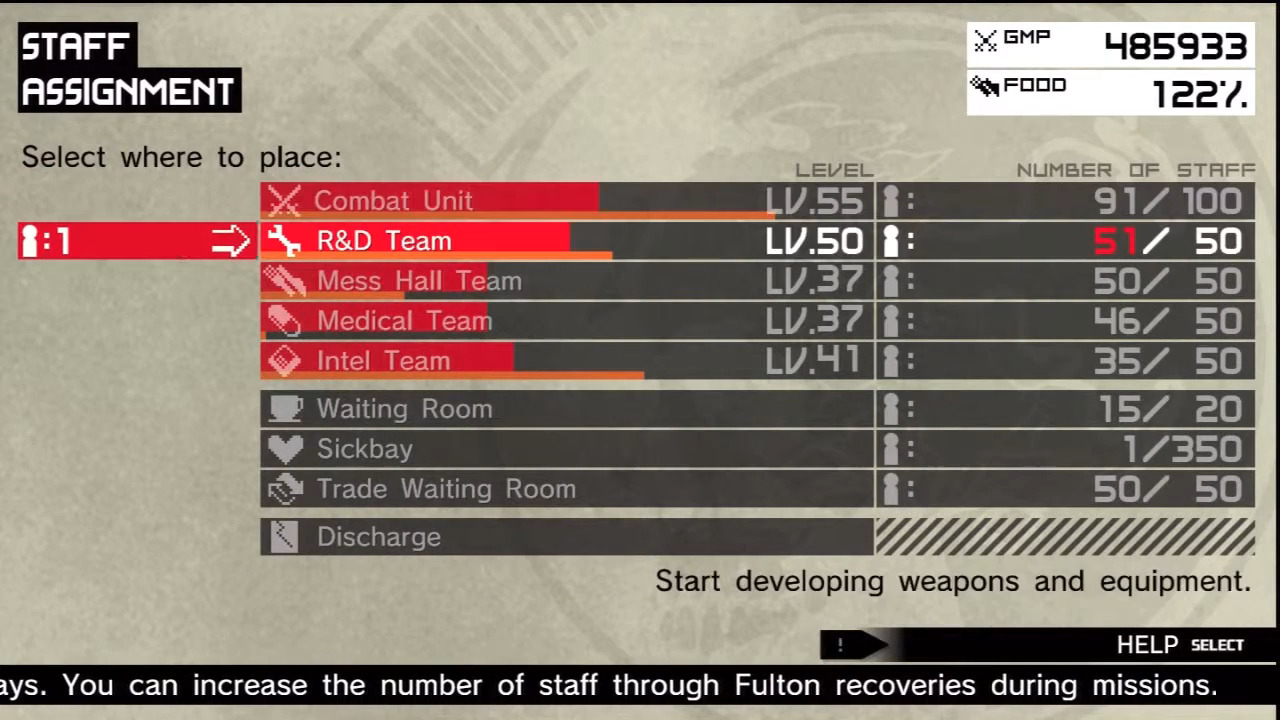 Armia bowiem to nie tylko wojacy, ale i jednostki medyczne, zwiadowcze, inżynierowie oraz kucharze – w końcu głodny żołnierz to niezadowolony żołnierz. Z rekrutowanych we wszelaki sposób ludzi do MSF nie każdy posiada odpowiednie parametry, by zostać włączony do służby na linii frontu. Osoby z umiejętnościami naukowymi trafiają do sekcji R&D (Research & Development), gdzie odpowiadają za zasilanie naszej armii nowymi typami broni oraz przedmiotami do użycia w trakcie misji, ulepszaniem tych istniejących oraz naprawą pokiereszowanych w trakcie Outer Ops pojazdów.