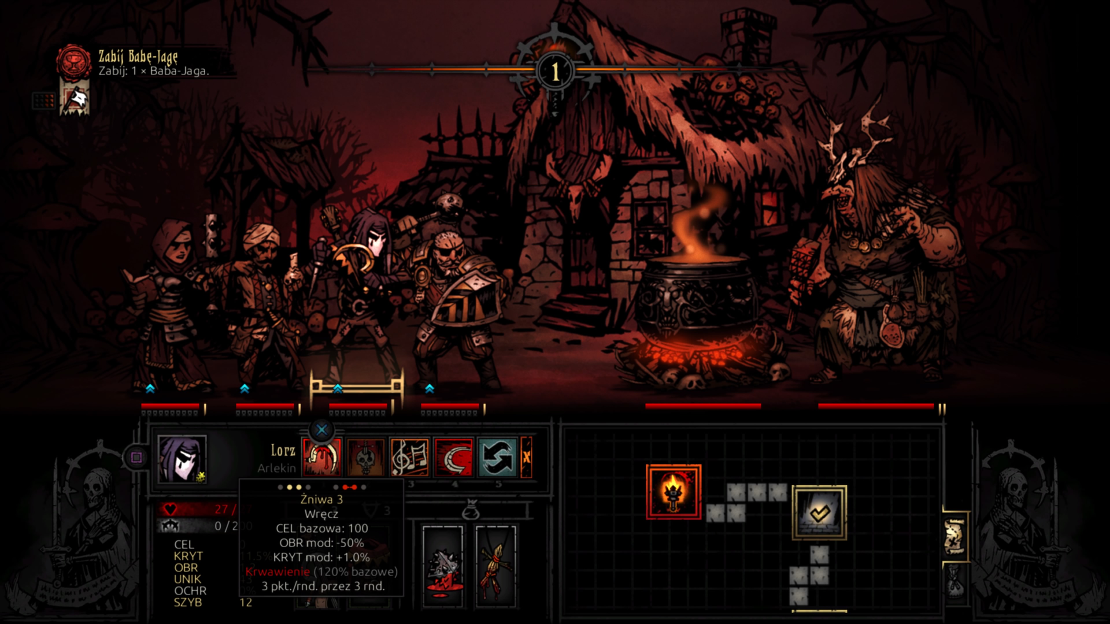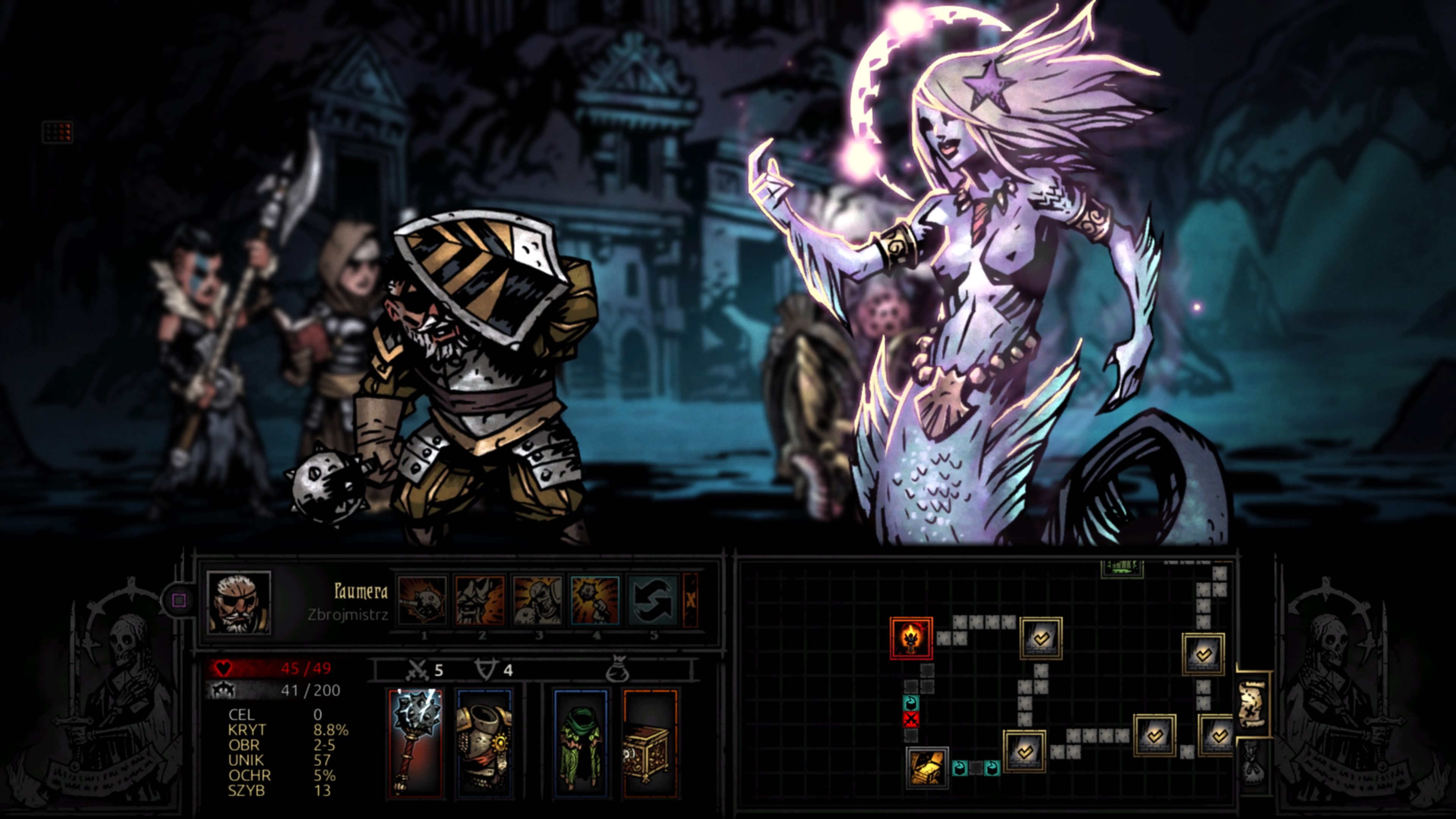 Część “aktywna” produkcji polega na eksploracji, składających się z korytarzy i “pokoi” lochów oraz turowych starciach. Lokacje są generowane losowo, zatem kolejne dwa “rajdy” nie będą w 100% identyczne. Nie pozostaje nam nic innego, jak ufać dobranej kompanii, a jest w czym wybierać. Kilkanaście klas, bez standardowego podziału na tanków, atakujących, leczące itp. Aczkolwiek, mimo że wiele z nich zarówno może wspomagać drużynę, jak i zadawać obrażenia, tak po zaznajomieniu się z ich mocnymi punktami odpowiednio wydziela każdej zadanie w wyprawie. Poznawanie każdej postaci sprawia sporo zabawy na początku, a ich dosyć spora uniwersalność sprawia, że zbudujemy niejedną “ulubioną czwórkę”, a co najmniej kilka preferowanych zestawień bohaterów. Niezależnie natomiast od naszego wyboru, na każdego w drużynie działają dwa ważne czynniki każdej przygody: oświetlenie lochu i stres. Z pierwszym dosyć łatwo sobie poradzić, bo wystarczy mieć ze sobą zapas pochodni. Im ciemniej w lochu, tym groźniejsi stają się przeciwnicy, a nasza drużyna jest np. mniej celna oraz – najważniejsze – każdy krok, wejście w pułapkę i odnoszone obrażenia bardziej stresują bohaterów. Stres, widoczny pod poziomem życia postaci, gdy urośnie do niebezpiecznego poziomu, wywołuje załamanie nerwowe. Irracjonalność, bezsilność, masochizm, paranoja. Dalsza podróż po lochu u boku osoby, która swój ruch marnuje na wycofanie się w szeregu drużyny, niezrobienie niczego lub okaleczenie siebie nie jest łatwe. W sumie nawet i bez przekroczenia limitu stresu jest ciekawie. Pamiętacie o cechach charakteru, jakich wspominałem wyżej? Bohater zafascynowany nekrofilią będzie grzebał w każdym napotkanym truchle, nawet jeśli spowoduje to u niego trwałą chorobę. Fascynacja okaleczeniami na pewno zmusza do otwarcia napotkanej “żelaznej dziewicy”, aby w środku znaleźć ukryty skarb lub pułapkę zadającą obrażenia drużynie. Alkoholik w drużynie to także nic śmiesznego, gdy już zauważymy, że zabrana liczba trunków leczniczych dziwnie zmalała. Jednak nie zawsze musi być źle, albowiem stres – podobni jak w życiu – może być mobilizujący i tak zbyt duże natężenie nerwów powoduje u bohatera heroizm, odwagę, czy potęgę, która mobilizuje całą drużynę. Przyznam, że niejedno starcie z przeciwnikami zostało dla mnie uratowane, poprzez nieoczekiwaną reakcją jednego z bohaterów, szczególnie pomocnych przy potyczkach z bossami. Darkest Dungeon tak się składa to także barwna paleta wielu rodzajów przeciwników z unikatowymi zdolnościami i ciekawych bossów. Starciom z każdym z nich towarzyszy ciekawa mechanika. Wiedźma będzie porywała jednego z naszych do wielkiego gara, gdzie gotując się będzie odnosił obrażenia. Syrena wdziękiem przeciągnie jednego z naszych na swoją stronę, a ślepy prorok zabarykaduje się za trzema przeszkodami. Tytuł trzyma nas w napięciu. Nie pozwala na momenty słabości,zbytniej pewności siebie, i karci za takowe. Wymaga od nas dobrego przemyślenia zestawu wybranych bohaterów na wędrówke, ich wyposażenia w błyskotki, odpowiedniej ilości przedmiotów leczących. Tutaj nie ma miejsca na pomyłki. Nawet szparki na potknięcie i to fascynuje….do czasu.