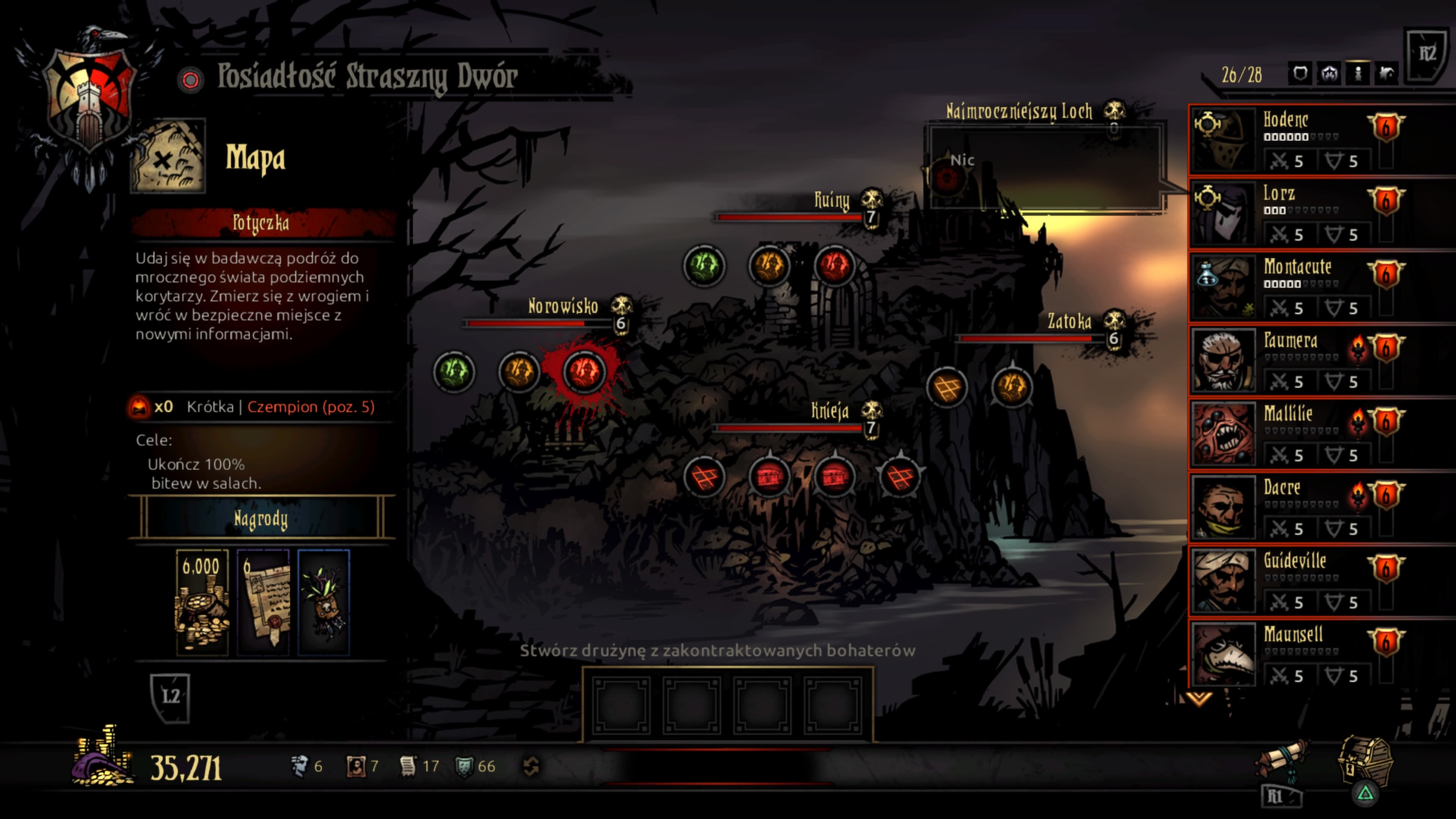 Sama rozgrywka jest równie poważna jak jej otoczka. Podzielona została w zasadzie na dwie aktywności: przygotowania do wyprawy w lochy oraz ich przemierzanie. W pierwszej zajmujemy się rozwijaniem Osady, leżącej u stóp naszego dworu, oraz rozwojem drużyny bohaterów. W Osadzie znajdziemy takie usługi jak Kuźnię, gdzie przyjdzie nam podnosić poziom naszego oręża i odzienia oraz Gildie, w których zwiększymy level umiejętności bohaterów. Wszystko oczywiście w mieście kosztuje mamonę, otrzymywaną za sukcesy w kolejnych wyprawach do lochów. W mieście także znajduje się m.in. lazaret, oberża i opactwo. W pierwszym z nich wyleczymy kompanów z nabytych w trakcie wypraw chorób oraz z przykrych nawyków, niepożądanych cech charakteru. Pozostałe pozwolą naszym bohaterom się odstresować, w dosłownym tego słowa znaczeniu poprzez rzucenie się w nocne pijaństwo, wir ryzyka hazardu lub uciechy dla ciała, a dla bardziej “grzecznych” medytację, modlitwę lub pokutne biczowanie. Te oraz pozostałe atrakcje Osady możemy ulepszać, odbudowując tym samym dorobek naszej rodziny i spełniając życzenie przodka. Fajnie obserwuje się, jak malowane budynki zmieniają się z każdym upgrade’em z ruin w dostojne budowle. To by było na tyle, jeśli chodzi o pierwszą połowę aktywności planowania wyprawy, a teraz poświęcenie uwagi naszej załodze. Liczba bohaterów, jakimi możemy zarządzać, ciągle rośnie, a nowi śmiałkowie do miasta przybywają z każdą wyprawą. Nieco już o zajmowaniu się nimi napomknąłem przy okazji budynków: rozwijanie umiejętności, ekwipunku, łagodzenie stresu po starciach w lochach oraz leczenie dolegliwości – ciała i umysłu. Albowiem w Darkest Dungeon ważniejszy od silnego ciała jest silny duch. Każdy z bohaterów ma swoje pozytywne i negatywne cechy osobowości. Te drugie są znacznie ciekawsze, więc od razu zajmę się nimi. Możemy spotkać się z osobami, które odstresowuje jedynie alkohol, gardzą religią i nigdy nie postawią nogi w opactwie miasta lub odwrotnie – nie pozwolą, by wraz z nimi wyruszyła na wyprawę osoba “nieczysta”. Jeśli nie czekamy zbyt długo, za niewielką opłatą możemy pomóc bohaterom się ich pozbyć, ale jeśli zlekceważymy obecność danej cechy zbyt długo, jej wyleczenie będzie bardzo kosztowne. Nie wszystkich oczywiście trzeba się koniecznie pozbyć, a dobre cechy można m.in. za opłatą wręcz utrwalić, gdyż z czasem u danej osoby może dojść do nagłej zmiany charakteru – czyli też jego składowych cech. Jest to niezwykle ciekawy i skomplikowany system, którego próżno szukać w ambitniejszych produkcjach RPG dużych wydawców. Aż chciałoby się zobaczyć patent Red Hook Studios w kolejnych odsłonach np. erpegów BioWare. Ostatnim elementem planowania wyprawy jest samo komponowanie 4-osobowego składu drużyny, wyposażenie ich w dwa przedmioty – zwane “błyskotkami” – oraz wybór miejsca, w jakie chcemy się udać. Mamy do wyboru 5 lokacji o odmiennym wyglądzie i przeciwnikach, podzielonych na kilka wariantów misji o różnych celach oraz minimalnym poziomie bohatera. Jeszcze tylko zakupić odpowiednią porcję prowiantu, pochodni i kilku bandaży. Gotowi? Schodzimy do ciemnych lochów.