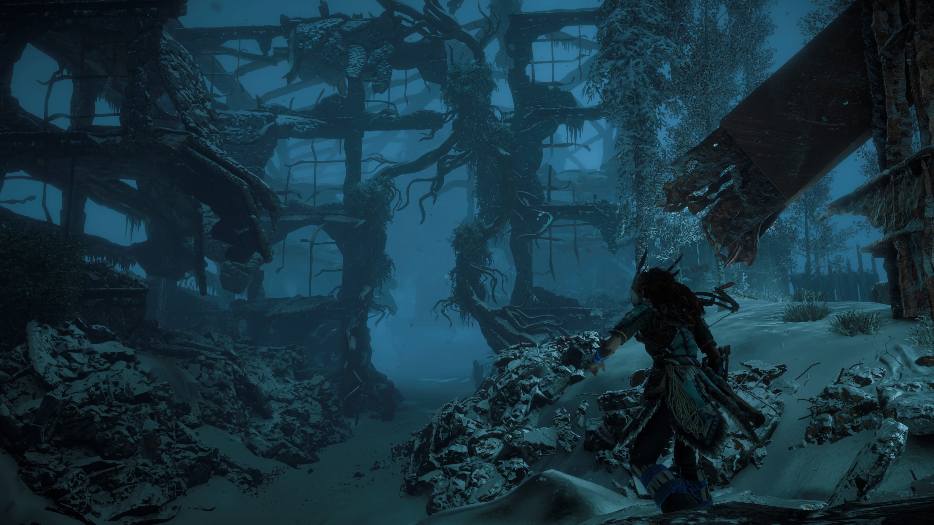 Jedne z bestii posiadają ogromny zbiornik na swoim grzbiecie, z którego strzelają w nas kulami np. ognia lub lodu. Jeśli uda nam się go zniszczyć, nastąpi wybuch, który zależnie od zawartości podpali lub zamrozi wszystkie znajdujące się w pobliżu maszyny. To tylko jeden z wielu przykładów wykorzystywania konstrukcji maszyn przeciwko nim. Równie ważnym, co plan działanie jest dobór broni. Jednocześnie możemy mieć na sobie ich cztery, zmieniane poprzez intuicyjne koło wyboru, na którym wybieramy również rodzaj pocisków do każdej z nich. Do dyspozycji m.in. mamy pociski zamrażające, podpalające, rozszarpujące elementy pancerzy, czy moje ulubione: zakażające. Działanie tych ostatnich polega na wprowadzaniu maszyn w szał, które zaczynają atakować siebie nawzajem – uwielbiałem ich używać w większych grupach. Twórcy oddają w nasze ręce łuk, wyczesaną procę strzelającą bombami oraz kilka bardziej „finezyjnych” broni, jak wyrzutnię stawiającą pułapki z lin wyrzutnia, o które potykają się przeciwnicy lub miotacz harpunów – ten po trafieniu w przeciwnika mocuje się w podłożu, aby finalnie powalić i przygwoździć oponenta do ziemi. Każda z broni działa lepiej lub gorzej na konkretne maszyny, więc w trakcie łowów musimy dobrze zastanowić się nad podejściem do starcia, co czyni potyczki nieustannie atrakcyjnymi. Dodam jeszcze, że mamy możliwość przejmowania kontroli nad wolą niektórych maszyn i mamy naprawdę przyjemny gameplay, który się nie nudzi i aż chce się zwiedzać kolejne siedliska maszyn w świecie Horizon Zero Dawn.