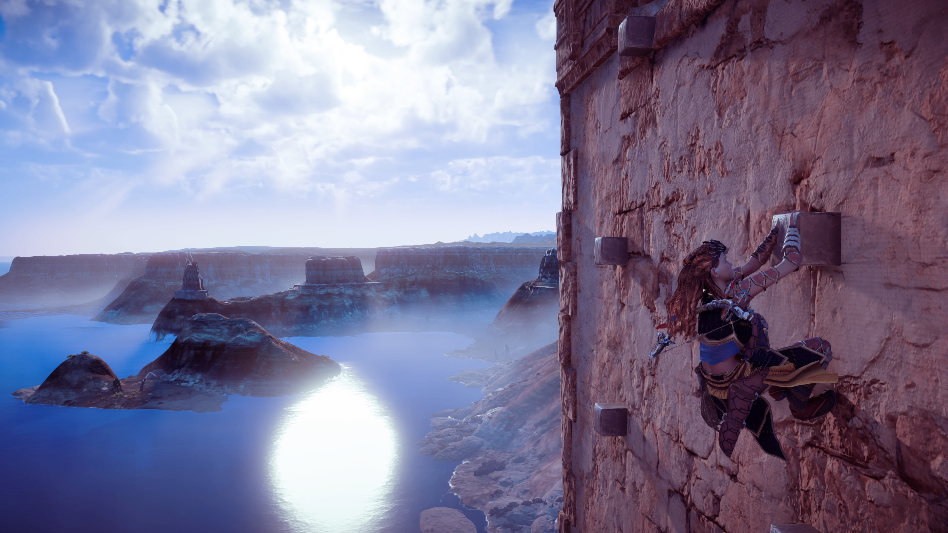 Podobnie ma się sytuacja z zadaniami pobocznymi. Nie jest to może poziom trzeciego Wiedźmina, ale side questy dają radę. Widać zresztą, że znów mamy do czynienia z zapożyczeniem sobie rozwiązań od m.in. właśnie ekipy CDPR. Aloy dzięki urządzeniu przy skroni może uruchomić tryb Focus, pozwalający badać miejsce wydarzeń, szukać poszlak oraz śledzić trop normalnie niedostrzegalny. Kłania się tutaj tryb detektywistyczny w grach z Batmanem od Rocksteady, czy zmysł wiedźmiński. Same zadania są ciekawe. Chce się poznawać historie za nimi stojące, czy losy osób z nimi związanych, przy których trzeba nadmienić, że Horizon Zero Dawn jest pełne naprawdę ciekawych postaci drugoplanowych – chociażby postrach bandytów Nil, oraz Talanah, nasza zwierzchniczka w Loży Łowców. Znajdźki skrzętnie obnażają gigantyczną zagadkę, jaką niewątpliwie jest sam świat gry, a zatem wbijanie platyny za wyczyszczenie mapy z przeróżnych ikonek jest wyzwaniem wręcz przyjemnym. Byłem naprawdę blisko 100% pucharków, jednak chyba coś pominąłem na wcześniejszym etapie gry i musiałbym teraz bawić się w NG+, więc tytuł pozostanie prawie „scalakowany” na moim koncie PSN. Wszystko to powoduje, że czas z produkcją Guerilla Games mija szybko, a także gra się w nią bardzo dobrze. Aloy świetnie radzi sobie w parkourze, bez większych problemów pokonując strome góry niczym ściany wspinaczkowe. Całkiem dobrze idzie jej walka wręcz, ale uwaga: to nie jest tytuł, w którym starcia bronią białą stoją na pierwszym planie, co – wiem niemalże z autopsji – może być bardzo zaskakujące i mylne dla spodziewających się tradycyjnego systemu walki graczy. W tym elemencie wychodzi na światło dzienne DNA studia. Starcie z bestiami świata Horizon przypominają mi najbardziej serię Monster Hunter, jednak z naciskiem na używanie broni dystansowej, choć ostatniej odsłony giganta z Japonii, World jeszcze nie ograłem i swoją refleksję opieram na wydaniach z PSP. Każda potyczka to polowanie wymagające przygotowania. Obrania strategii ataku oraz zaznajomienia się z silnymi i słabymi punktami przeciwnika. Nie tylko musimy dobrze dobrać rodzaj „amunicji” do starcia, ale i części, którą zaatakujemy, aby wystawić krytyczny punkt na światło dzienne, ściągnąć element dający przewagę oponentowi lub odstrzelić broń, którą użyjemy za chwilę przeciwko niemu – możliwości jest multum.