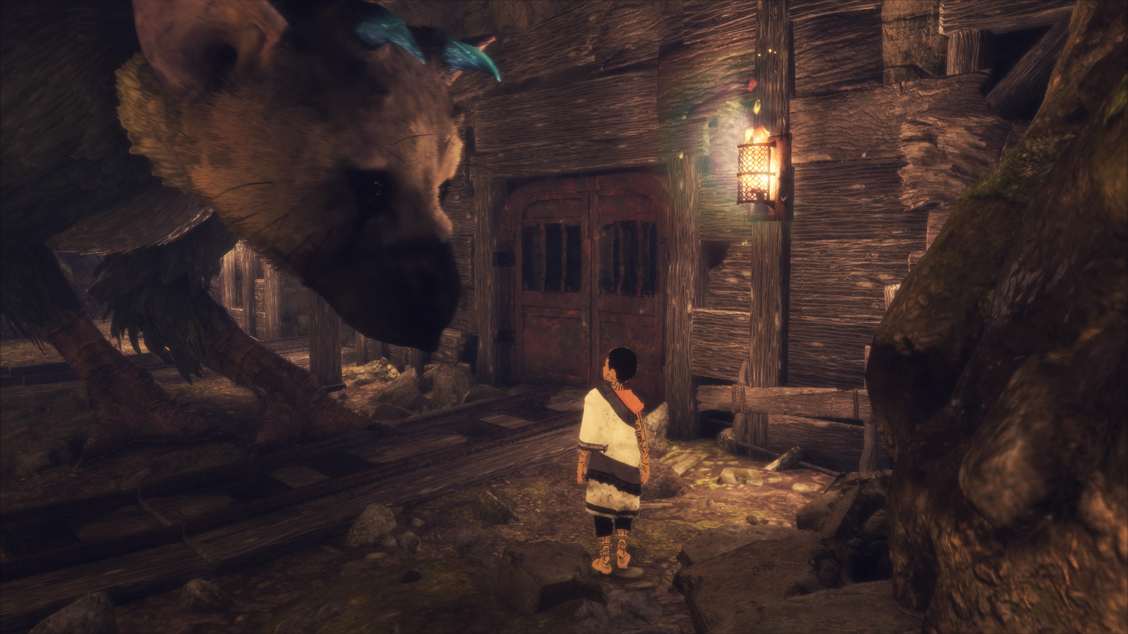Produkcja genDESIGN wciela nas w rolę młodego chłopca, który pewnego dnia zostaje uwięziony w podziemnej komnacie z dziwacznym stworem – raczej wygląd nie będzie dla was spoilerem. Bestia, przypominająca połączenie ptaka i psa, z niewiadomych przyczyn została zakuta w łańcuchy, a na jej ciele pełno jest wbitych lanc. Pierwszym naszym zadaniem staje się wyciągnięcie ostrzy z ciała zwierzęcia. Podchodzimy do niego i za pomocą wciśniętego klawisza oraz ruchu analogiem w tył, wyciągamy wbitą broń. Podskakując możemy złapać się pierza stwora i następnie się po nim wspinać. Kolejnym krokiem jest szukanie możliwości oswobodzenia go z łańcuchów – nie mamy innego wyjścia, jeśli chcemy wydostać się z jaskini. Biegamy po lokacji, wspinamy się na niewielkie wniesienia, podnosimy przedmioty i staramy się nimi cisnąć w łańcuchy – nasz chłopiec, to przecież zwykły chłopiec i nie posiada, żadnych nadprzyrodzonych mocy. W zasadzie można pokusić się spokojnie o stwierdzenie, że cała gra opiera się na podobnych zadaniach i rozwiązywaniu zagadek w lokacjach, niczym w starych odsłonach Tomb Raider. Rozglądamy się po ścianach, badamy możliwość wejścia na tę czy tamtą skałę, co możemy przenieść itd. Styl zabawy w The Last Guardian bardzo przypominał mi właśnie stare odsłony przygód Lary Croft. Znacznie bardziej niż Nathana Drake’a, gdzie rozwiązanie było przeważnie jasno komunikowane graczom przez np. kolory. Co za tym idzie? Nie będę pierwszy, który to powiedział: czuć, że gra była w produkcji od wielu, wielu lat.