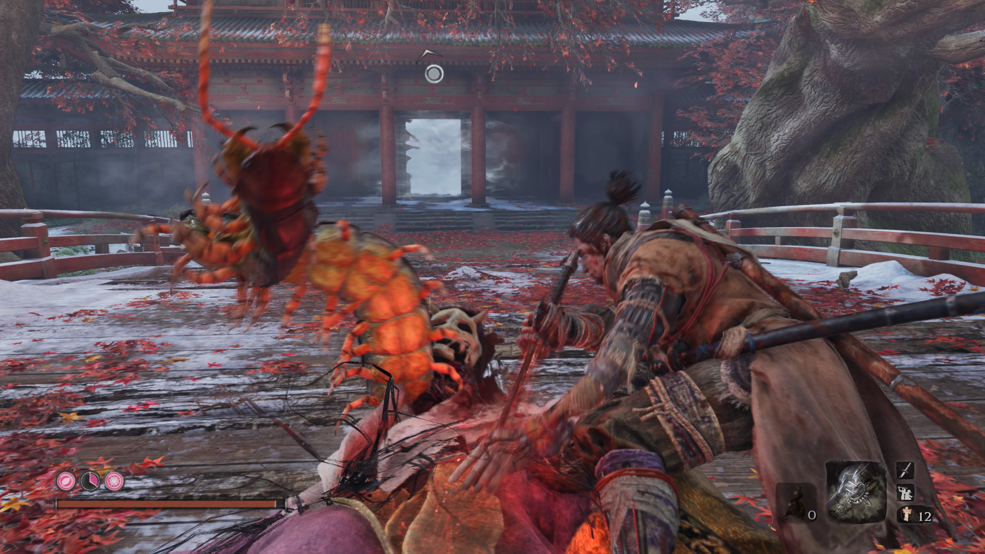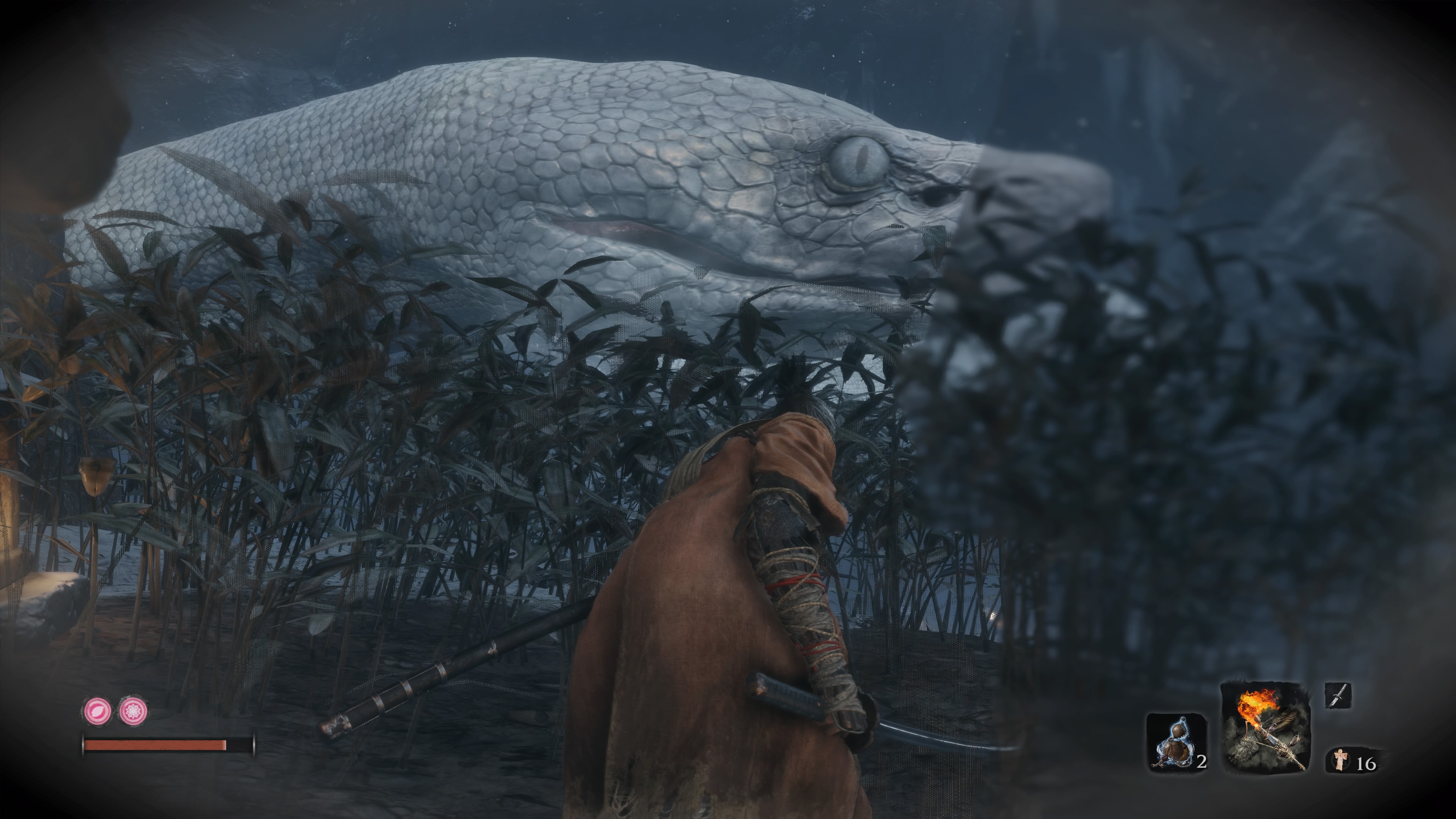 U sedna rozgrywki, albowiem nadal umieszczono bezlitosny, aczkolwiek nade sprawiedliwy schemat prób, błędów, uczenia się, dostosowania i pokonywania własnych granic – serce każdej z ostatnich produkcji From Software. I nie wiem, czy to ze względu na w/w dysfunkcje, z jakimi wystartowałem w Sekiro, czy – po prostu – tak gra takową jest, jednak jeszcze w żadnej innej grze nie odczuwałem tak gigantycznego zadowolenia i satysfakcji z pozbycia się sprzed oczu przeciwnika. Mimo silnego przeświadczenia, że jest to najtrudniejszy soulsborne z jakim dotychczas obcowałem, to również jest to zdecydowanie mój ulubiony przedstawiciel „gatunku”. A skoro już napomknąłem o poziomie trudności, to nie mógłbym nieco więcej powiedzieć o te niebywale rozdmuchanej (w mediach) cesze tytułu. Sekiro jest trudne. Co do tego nie ma wątpliwości. Nie ma możliwości przywołania sobie do pomocy innych graczy, czy NPC-ów. Rzadko kiedy mamy możliwość wykorzystania terenu, do zdobycia przewagi w starciu, np. chowając się za kamieniami przed ciosami przeciwnika i atakując przez nie – ahh, przypomniała mi się znów walka z Gwynem w Dark Souls. Dodatkowo, system walki wymaga perfekcyjnego opanowania i nieustannego wyostrzenia zmysłów, ale z drugiej strony zrekompensowano czymś praktycznie każdy z tych aspektów. Wilk może wskrzesić się po śmierci – stanowi to ważny punkt opowieści – i choć jest to ograniczone liczebnie, to bardzo pomaga. Poza starciami z bossami, pozwala zniwelować potknięcia np. na jakimś przypadkowym przeciwniku, którego nawet da się zaskoczyć naszym „zmartwychwstaniem” i wykończyć atakiem od tyłu. W walce z ważniejszymi oponentami pozwala, dać sobie dodatkową szansę, na wykończenie lub naukę.