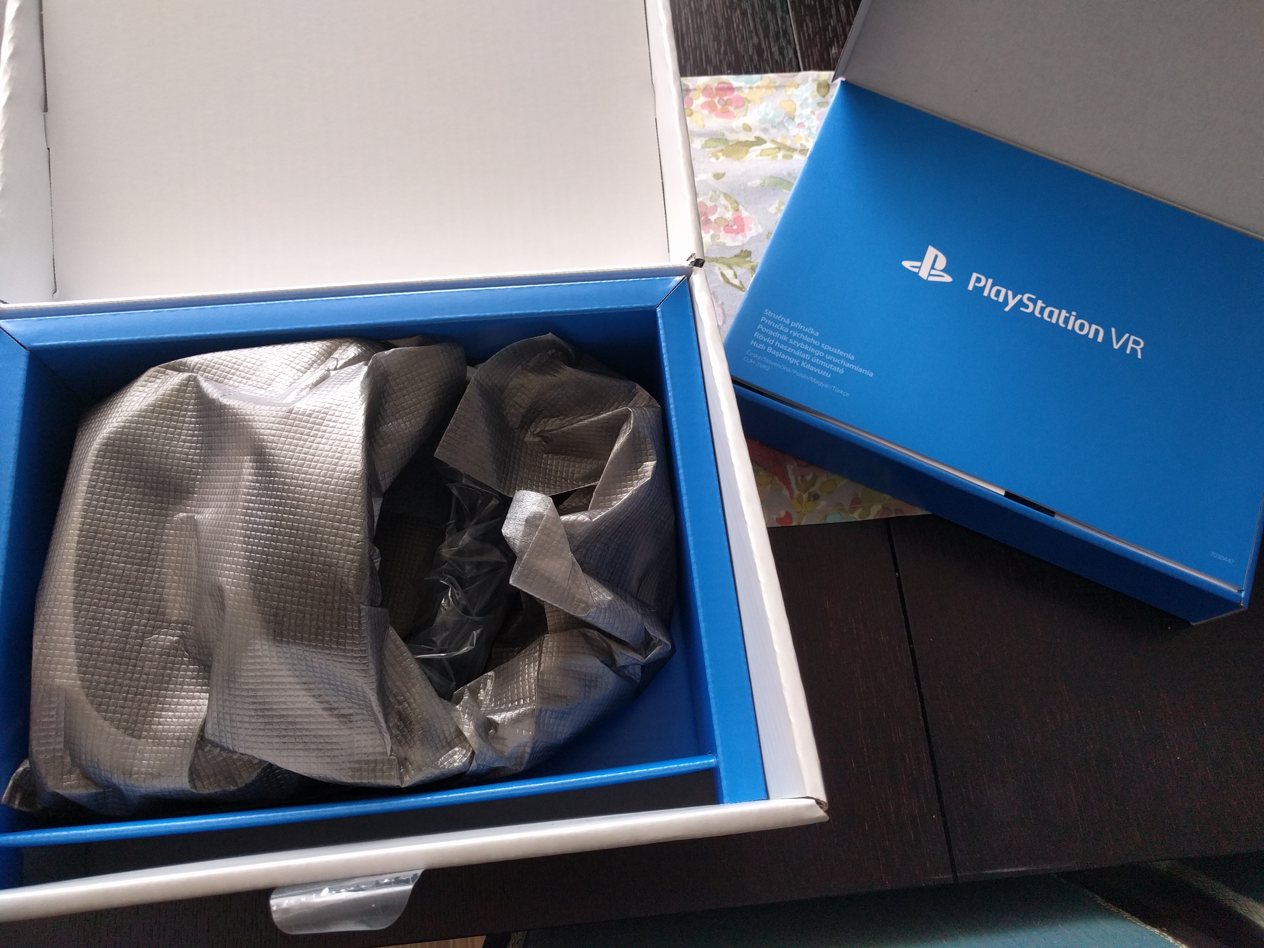 Rozpoczęcie zabawy jest dziecinnie proste. Sony zrobiło wszystko, aby nawet osoby zupełnie zielone w gierkach, poradziły sobie z podłączeniem VR. Instrukcja obsługi jest wielkości zeszytu A4 i przypomina elementarz. Na lewej stronie znajduje się opisany (maksymalnie w kilku zdaniach) krok, a cała prawa cześć to obrazek go reprezentujący. Ponadto, wszystkie kable mają na sobie numerek zgodny z krokiem podłączania, a numeracje również ukazuje instrukcja – nie da się tego spieprzyć. Nieco trudniejsze, aczkolwiek wciąż wykonalne dla każdego, jest odpowiednie założenie gogli. Zakładamy je z wyciągniętym wizjerem, a dopiero po dopasowaniu ich do głowy zaczynamy go przyciągać do oczu. Wymaga to trochę prób i błędów, poprawiania całego hełmu, opaski i wizjera, aż widoczny w środku obraz będzie ostry – wprawa czyni mistrza i tak obecnie zakładam je na siebie w mgnieniu oka. Wkładanie ich innym osobom trochę trwa, ale również bez przesadnych komplikacji. Fajnym patentem jest miejsce na przymocowanie słuchawek, dostarczonych w zestawie, które nie plątają nam się i przeszkadzają (uwaga, na zdjęciu jeszcze nie ogarnąłem, że wkłada się do środka). Całość leży na głowie bardzo wygodnie i nawet długie sesje (ponad godzinę) w nich są spokojnie wykonalne. Ważne: jestem osobą, która cierpi na srogą wadę wzroku, więc ucieszyłem się, że a) sprzętowi to zupełnie nie przeszkadza, b) mogę grać zarówno w soczewkach i okularach. Super! Niestety nie pasują do nich moje słuchawki, co jest trochę rozczarowujące, aczkolwiek zrozumiałe – headset jest spory i z kategorii nausznych.