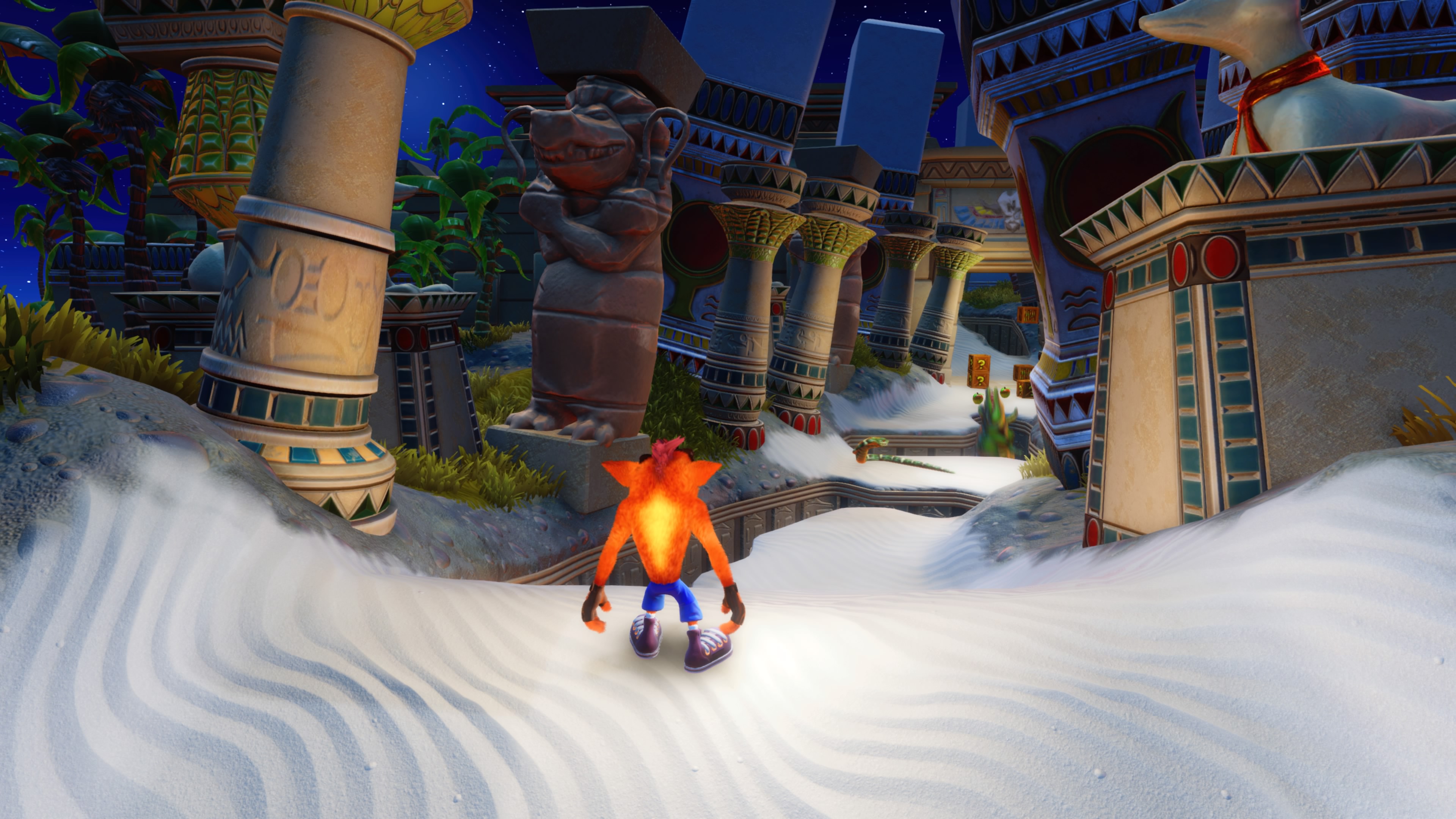 Jedną z najistotniejszych rzeczy, wobec której nostalgia płata nam figle, jest niewątpliwie grafika. Często wspominamy oprawę znacznie lepiej, aniżeli ocenilibyśmy ją dzisiaj, trzeźwym umysłem. Tym samym twórców remasterów rozliczamy z tego, jak blisko udało im się zrealizować te nasze wspomnienia – w takim kryterium oceny, dla Vicarious Visions należy się solidna premia. Crash Bandicoot N. Sane Trilogy wygląda lepiej, niż mogłem to sobie wyobrazić. Wszystkie trzy odsłony zostały poddane temu samemu procesowi liftingu i każda wygląda fenomenalnie. Oprawa szczególnie zrobiła na mnie wrażenie w trzeciej odsłonie, która z całej trylogii jest najbardziej różnorodna pod względem lokacji, a dokładnie ich klimatu i szczegółowość. Wszystko jest bajecznie kolorowe, niemalże żywe. Modele napotkanych przeciwników i samego Crasha, prezentują się kapitalnie – godne animacji z wielkiego ekranu. Jednym z pierwszych poziomów, w jakie kiedykolwiek grałem w Crashu był rycerski Toad Village, który zawierał się na płycie demo dołączonej do mojej pierwszej konsoli Sony. Widok odświeżonej lokacji niemalże mnie rozkleił: gęsta trawa na wzgórzach, która rozświetlała się i gasła w świetle przebijającego się przez chmury słońca. Podobne wrażenie zrobiły poziomy w klimacie „tysiąca i jednej nocy” czy starożytnego Egiptu. Miodzio! Co więcej, twórcy równie wiele troski co grafice, skierowali w kwestie udźwiękowianie tytułu – na czele z muzyką. Wszystkie dźwięki oraz melodie przygrywające rozgrywce zupełnie odnowiono, co idealnie komponuje się z uwspółcześnionymi aspektami wizualnymi. Natomiast jeśli chodzi o głosy postaci w grze, to pomimo innej listy płac niż w pierwowzorach, brzmią one bardzo podobnie. Wszystko to spina się w niezwykłą staranność wykonania, którą niewątpliwie obdarzono trylogię. Dla weteranów jamraja będzie to spełnienie marzeń, a dla zupełnie niezaznajomionych z Crashem, ot naprawdę ładny tytuł.