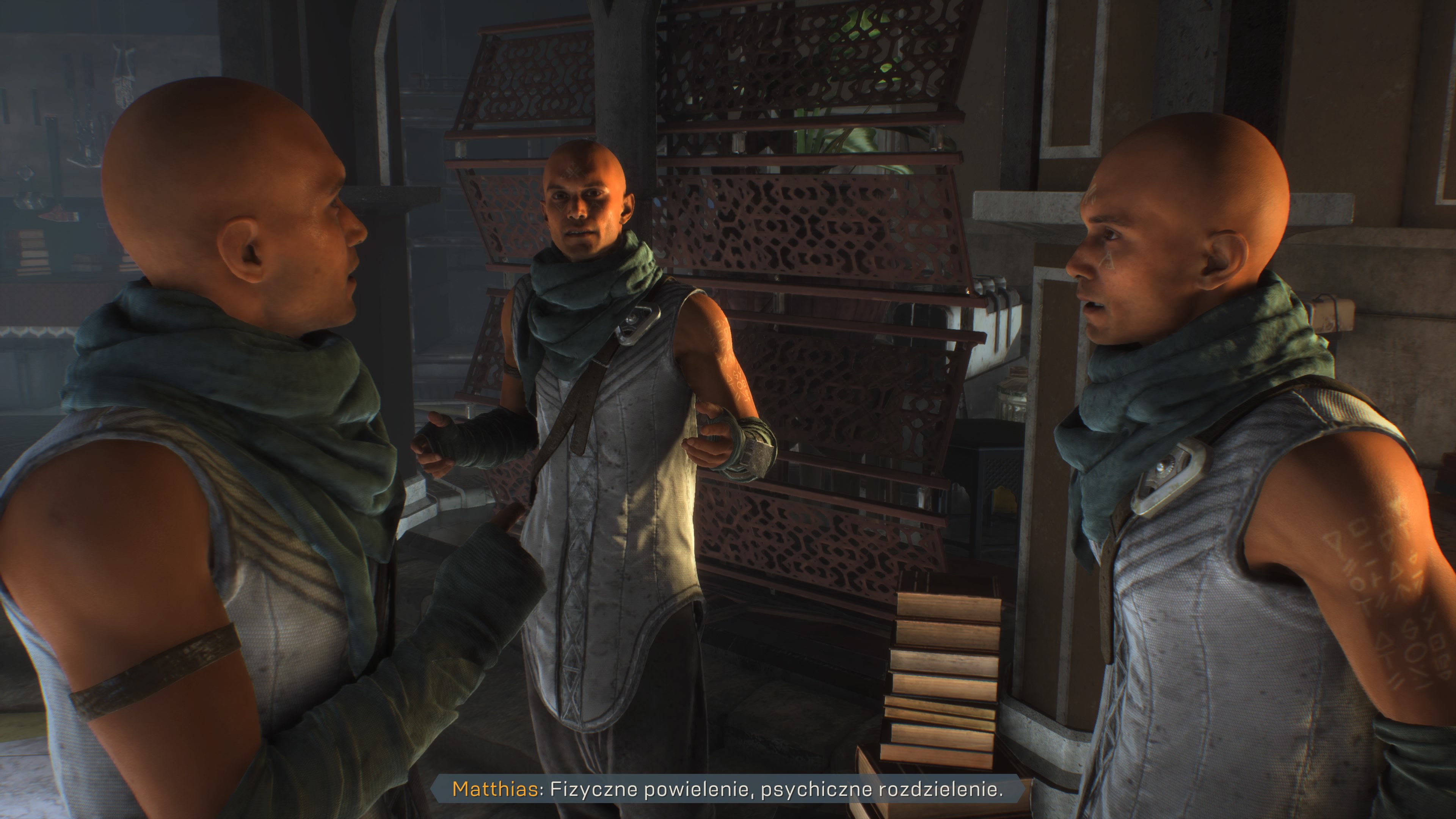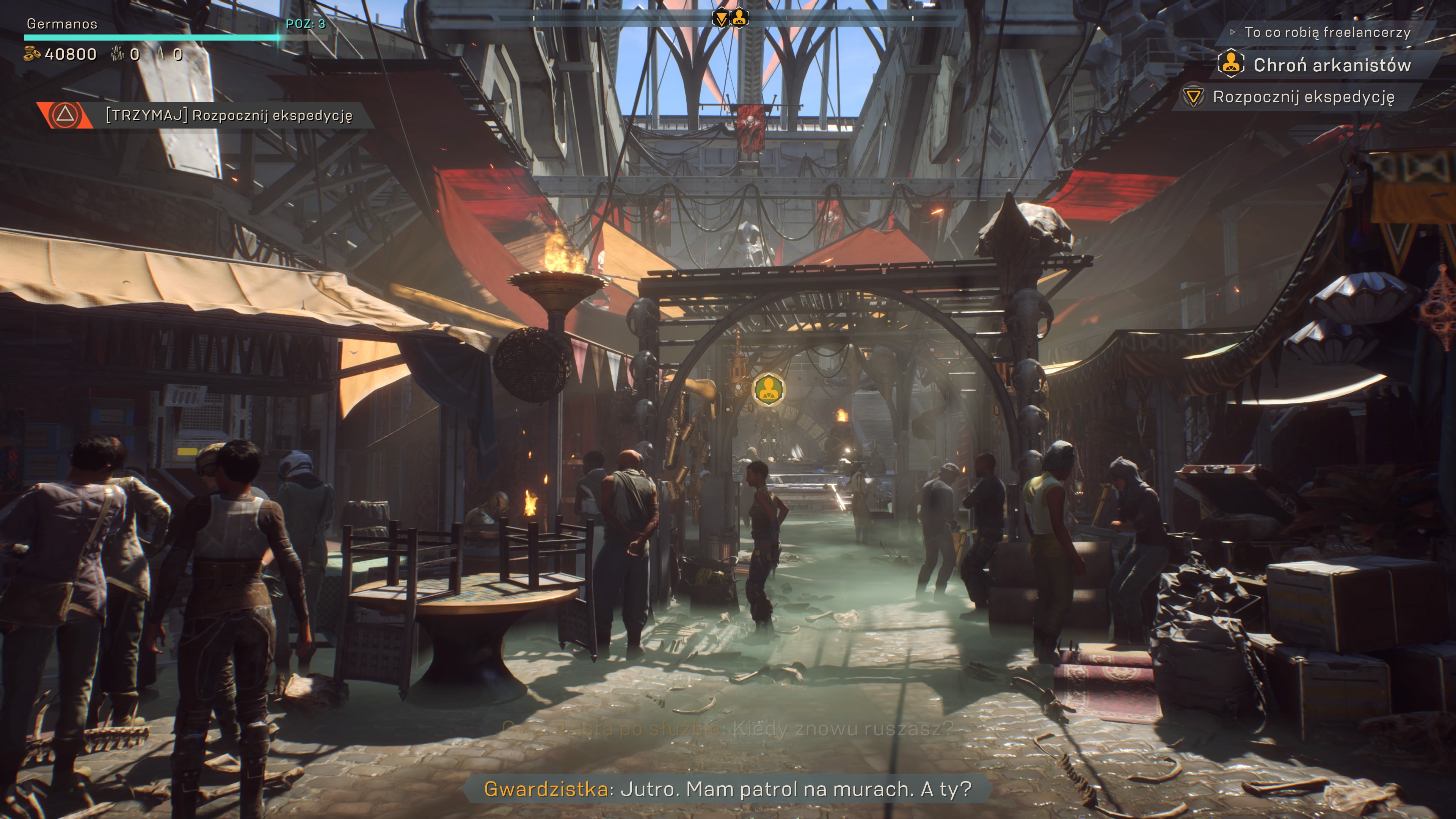 W związku ze spotykanymi personami gra została podzielona na dwie części – wewnątrz murów miasta oraz poza nimi. W środku poruszamy się po uliczkach i rozmawiamy z ww. osobami. Czasem wynikiem naszych rozmów będzie misja do wykonania, a innym razem otrzymamy możliwość wyboru jednej z dwóch odpowiedzi. Nie jestem niestety pewien, jak wielkie dla zdobywanych punktów frakcji mają nasze wybory albo czy zmieniają coś w przyszłych możliwościach konwersacji. Niemniej, duch BioWare jest widoczny. Fajnym patentem jest to, że wraz z budowaniem naszych relacji ze społecznością miasta, zmienia się Fort Tarsis. Ściągane zostają płachty z rzeźb upamiętniających legendarnych freelancerów, oczyszczone zostają podupadłe miejsca spotkań ludzi (czują się bezpieczniejsi) itd. Na własne oczy widzimy wpływ naszych działań i poczynań na świat. Muszę powiedzieć, że podobała mi się ta część rozgrywki. Po intensywnej rozgrywce powrót do miasta i możliwość porozmawiania z mieszkańcami o mniej czy ważniejszych kwestiach był nawet relaksujący. A jeśli w pakiecie dostajemy bardzo dobry voice-acting, animacje (pomimo powtarzania się) i wygląd rozmówców – w to mi graj.