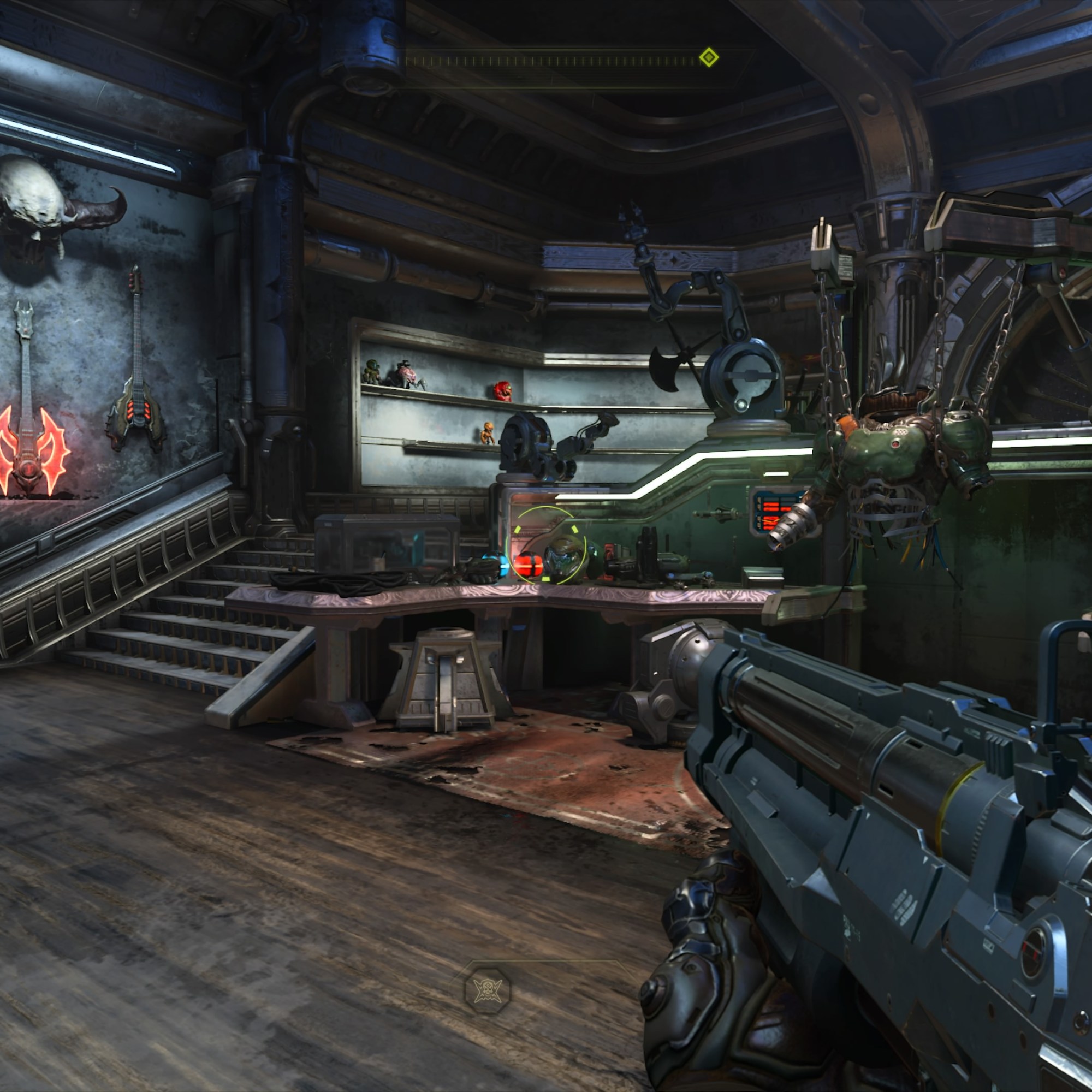 W Eternal pojawiło się dużo elementów platformowych. Na tyle, że w sieci zdążyłem zobaczyć już porównania do Mario czy Devil May Cry. Nasz morderca demonów może wykonywać w powietrzu podwójne skoki, które w połączeniu z możliwością dashowania w dowolnym kierunku i wybijaniu się na poręczach (serio) pozwala niemalże uciec spod każdej opresji i przez dobre kilkanaście sekund przenieść walkę nad ziemię. Otwiera to zupełnie nowe horyzonty, zmieniające starcia na arenach w krwawy taniec. Nie wygląda to ani trochę realnie, ale hej – już mówiłem dlaczego. Parkour przenosi się z walk do eksploracji poziomów i poruszania się po poziomach. Dochodzi tutaj jeszcze możliwość łapania się niektórych ścian i odbijanie się od nich. I tym studio mnie kupiło. W ogóle: co za pomysł! Jednym z problemów DOOMa z 2016 było to, że musiałem sobie rozgrywkę dawkować, albowiem choć rajcowna, potrafiła zmęczyć w większych dawkach. Eternal przez powyższe radzi sobie na tym poletku znacznie lepiej. Kolejne starcia oddzielone są od siebie sekcjami skaczącymi, a także (dla chętnych) poszukiwaniem licznych znajdziek. Tutaj znów. Bez hamowań. Ulepszenia bohatera, broni i kostiumu, leżą sobie zupełnie wolno na w najdziwniejszych zakamarkach map, nie wspominając o poszukiwaniu maskotek i płyt winylowych – pierwsze można potem obserwować w bazie wypadowej, za to drugie pozwalają na słuchanie ikonicznych utworów z poprzednich gier id.
