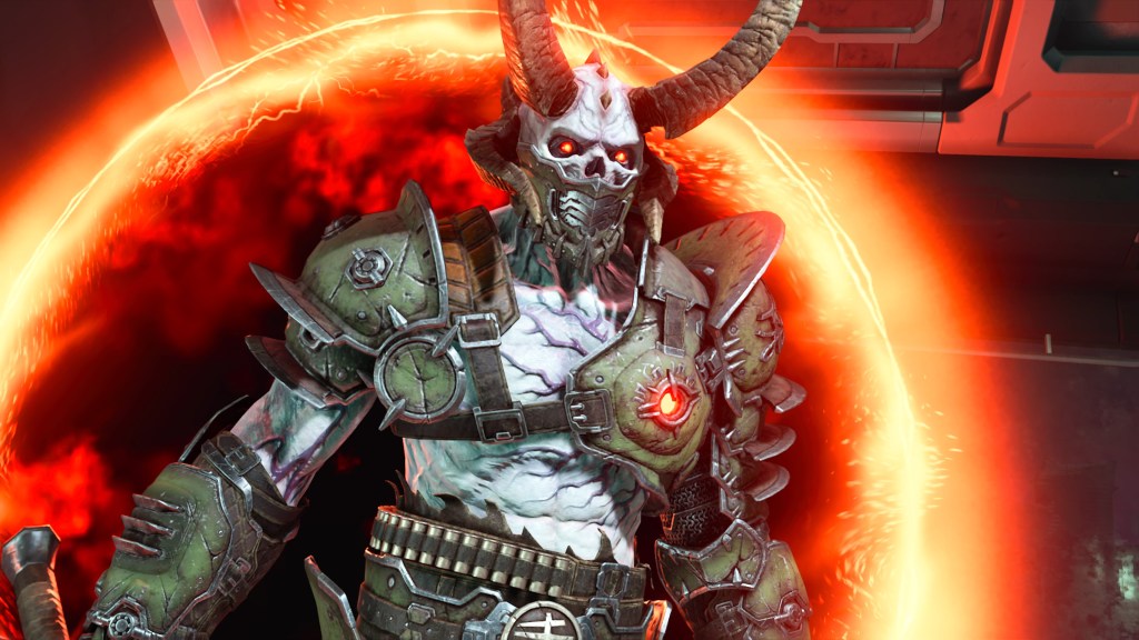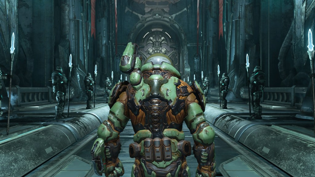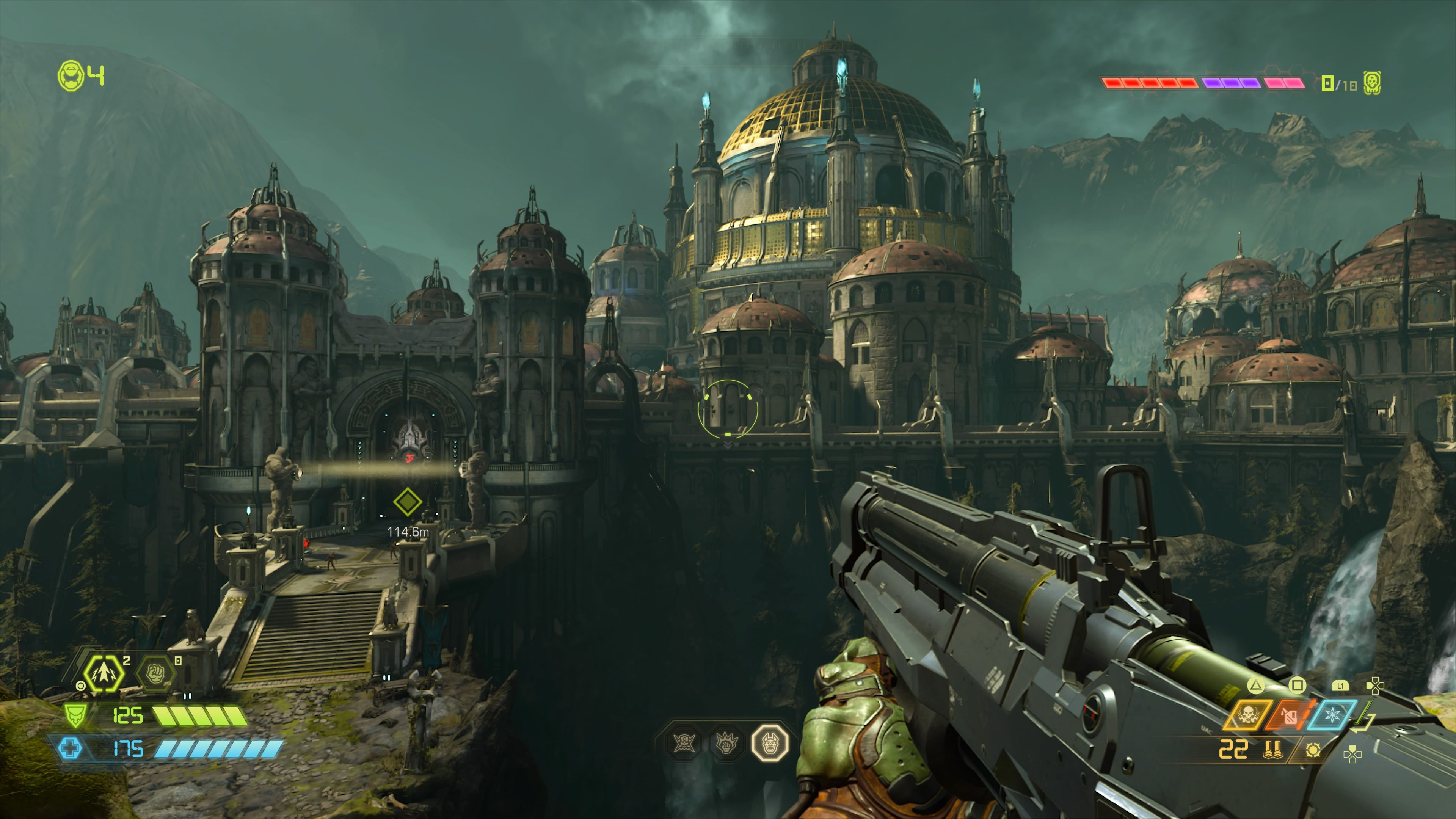 Nie pamiętam gdzie przeczytałem to porównanie, ale utkwiło mi w pamięci: estetyka nowego DOOMa przypomina okładki albumów kapel thrashmetalosych – trudno się z nimi nie zgodzić. Natomiast, i tutaj sequel kopie zadek poprzednikowi. Praktycznie każdy z plenerów mógłby posłużyć do kolejnego krążka Megadeath, Slayera czy innego Dragonforce. W związku z budową rozgrywki opartej na misjach, które rzucają nas w różne, nieczęsto występujące po sobie w sposób liniowy lokacje, odwiedzimy naprawdę przeróżne klimaty. Poza piekielną czerwienią i szatańskim pomarańczem, spotkamy tu równie wiele śnieżnej bieli, ogrodów pokrytych zielenią czy komnat celtyckich zamków i twierdz. Oczywiście, nie zapomniano o domieszce klimatów futurystycznych i maszynerii rodem z filmów sci-fi. Kolorystycznie naprawdę dużo się dzieje w Eternal. A wszystko wygląda równie świetnie, jak miało to już miejsce w 2016 roku. Grafika prezentuje się bardzo ładnie, a animacja rozgrywki to żyleta. Wertykalność i zwiększona mobilność starć jeszcze bardziej podkręciły tempo, a silnik nie łapie minimalnej zadyszki. Można mieć zastrzeżenia, co do poziomu jakości wypuszczanego kodu przez Bethesda’e, jednak id pokazuje, że ich silnik (id Tech 7) to prawdziwa bestia.