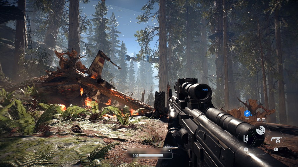 Co natomiast muszę oddać twórcom, to że postarali się, aby każdy znalazł odpowiedni dla siebie tryb zabawy w Battelfront II. I nie mówię tu jedynie o grze wieloosobowej, a ogólnie całej produkcji. Jest oczywiście kampania, o której powiem za chwilę, a do tego: misje kooperacyjne (dla dwóch graczy na podzielonym ekranie, walka przeciwko botom z celami do osiągnięcia), treningi (przeciwko SI) oraz garść różnorakich trybów zabawy dla wielu graczy. Znajdziemy tu znane tryby (TDM, CTF, conquest i rush z Battlefielda) w nowych nazwach (np. Blast to nic innego jak zespołowy deathmatch, a Supremacy to połączenie rush i conquest) oraz par oryginalnych (powiedzmy) pomysłów. Pierwszym z nich jest bitwa na wyłącznie pojazdy latające, Starfighter Assault. Dwie drużyny oraz kilkadziesiąt botów. Jedna ekipa broni krążownika Imperium, a druga stara się go zniszczyć. Bardzo przyjemne, choć przez średnie wrażenia lotnicze, nie spędziłem z trybem za dużo czasu. Ostatnim jest tzw. Evok Hunt, gdzie wcielamy się rolę oddziału Szturmowców, pozostających na Endor po zniszczeniu Gwiazdy Śmierci. Naszym celem jest przetrwanie nocy, broniąc się przed atakami rdzennych mieszkańców planety, którzy wykorzystują znajomość swojej ziemi w partyzanckich atakach. Każdy zabity członek naszej drużyny trafia po śmierci do przeciwnej, a gra kończy się wraz z końcem czasu. Całkiem przyjemny zestaw, który gdyby nie wcześniejsze bolączki, pewnie zatrzymałby mnie na dłużej.