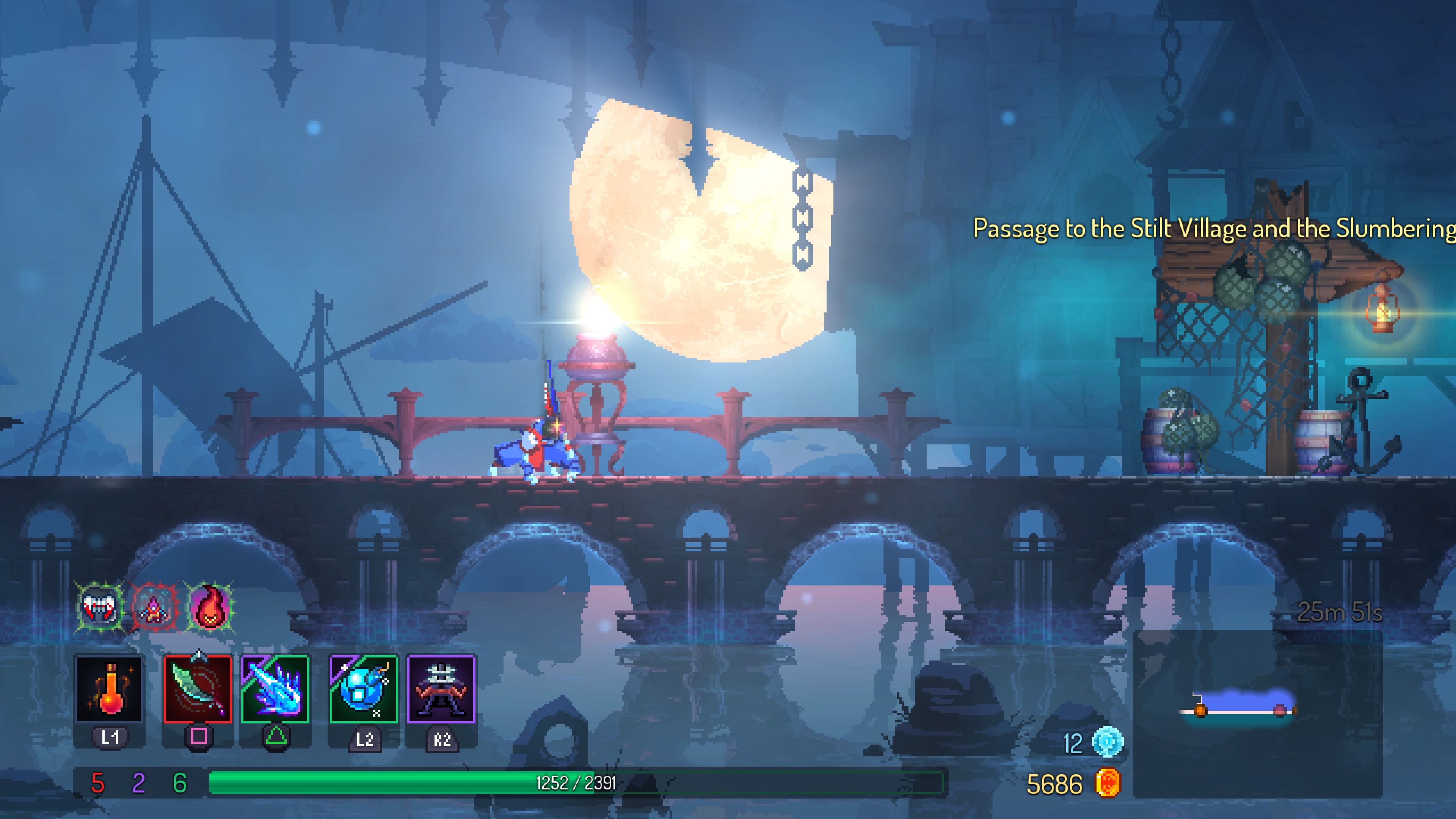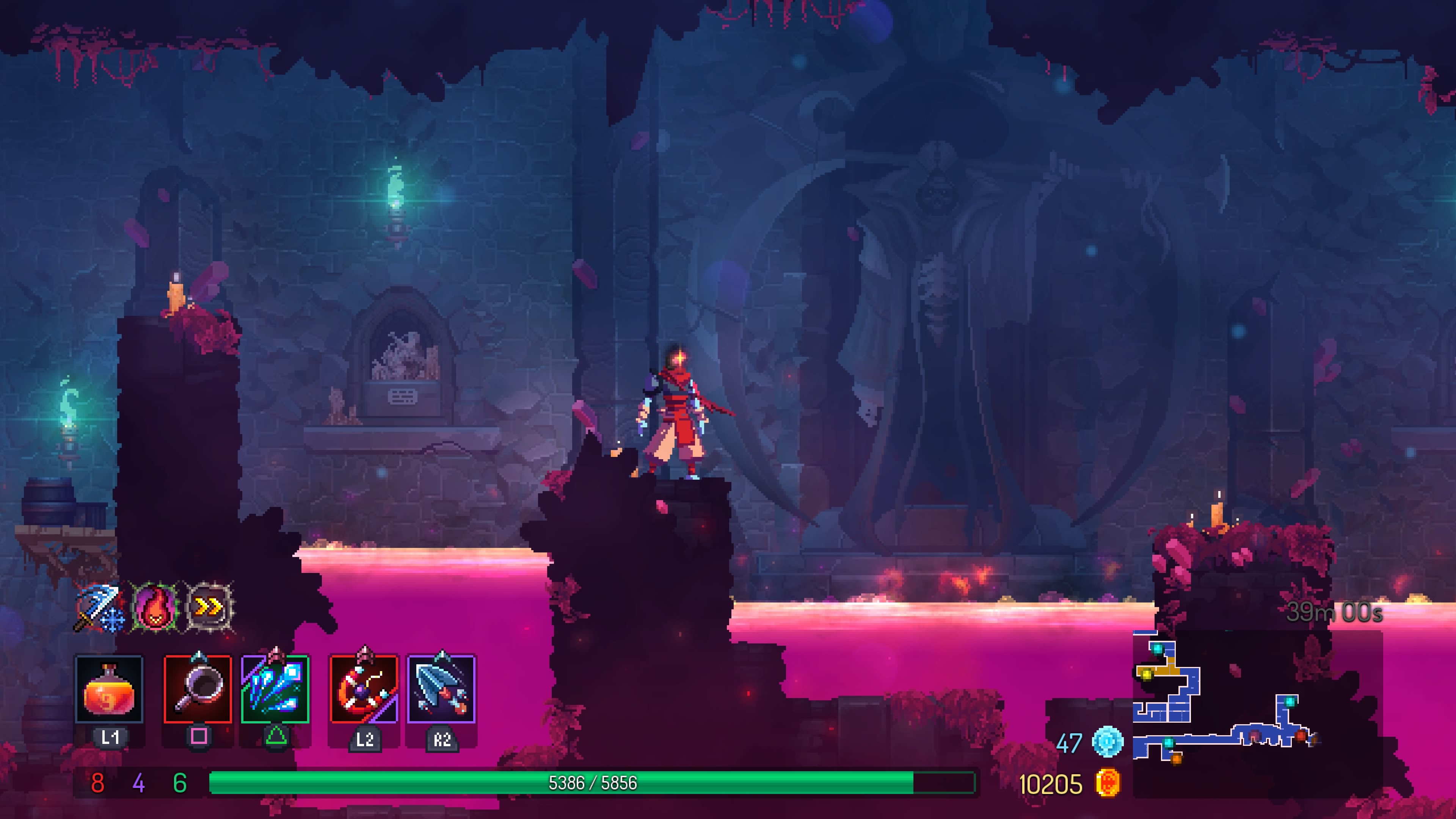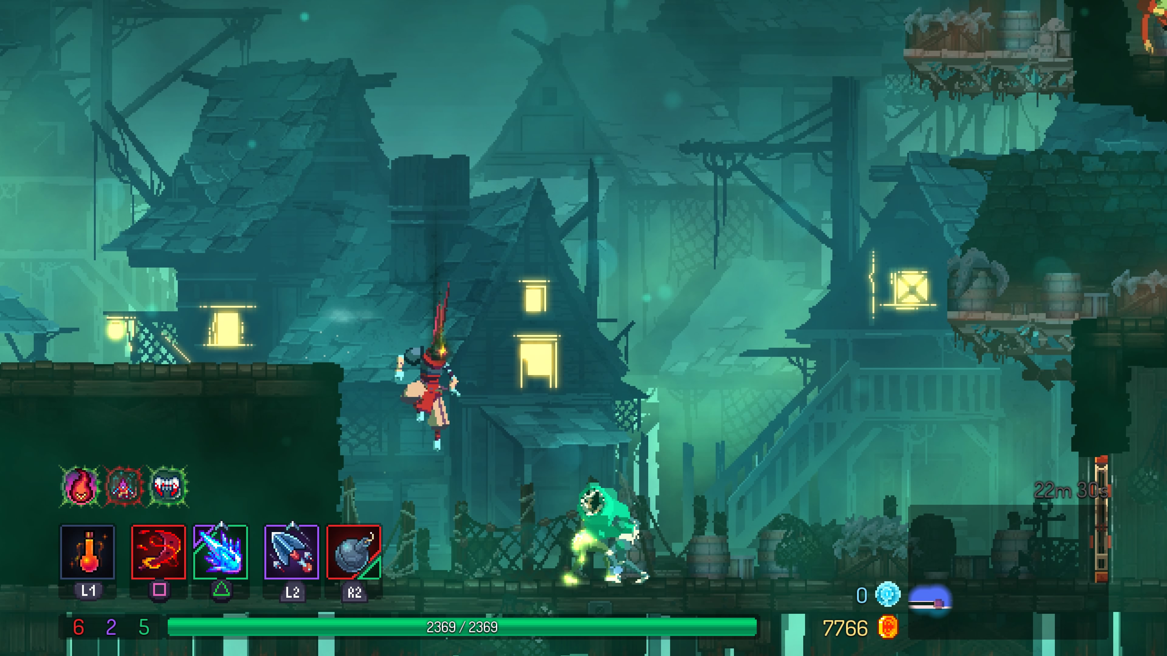 Dead Cells mógłbym nazwać kolażem kilku nurtów game designu: platformówki 2D, metroidvanii i roguelike, gdzie każdy z nich to w ostatnich latach niezwykle popularna baza pod produkcję indie. Rozgrywka jest bardzo prosta: poruszamy się w dwóch wymiarach, w czterech kierunkach, siekając po drodze wszystko, co popadnie – chyba nie muszę wiele więcej tłumaczyć? Od Striderów po wszelkie Mega Many, raczej każdy momentalnie wie, o co chodzi, a już na pewno, jeśli tylko rzuci okiem na kilka zrzutów z gry. Podobnie jak ma to miejsce w ww. tytułach, naszym celem jest przejście poziomów, od startu do mety, co kilka z nich stoczyć walkę z bossem i uratować księżniczkę – z tym ostatnim to się zagalopowałem. Niejednokrotnie natrafimy na naszej drodze na przejścia czy elementy otoczenia, do których będziemy musieli wrócić później i na razie odpuścić, cokolwiek skrywają za sobą, co już wskazuje na naleciałości metroidvanii. Ale przecież tytuł zbudowany jest liniowo. Kilka poziomów, boss i znów kilka poziomów, i znowu walka z bossem i tak do napisów końcowych. Poruszamy się wyłącznie do przodu bez możliwości wracania się do wcześniejszych lokacji – zatem, jak wrócić do tych niedostępnych rzeczy? Tutaj wchodzi trzecia składowa kolażu, od którego zacząłem akapit – pętla gier rogue-podobnych.