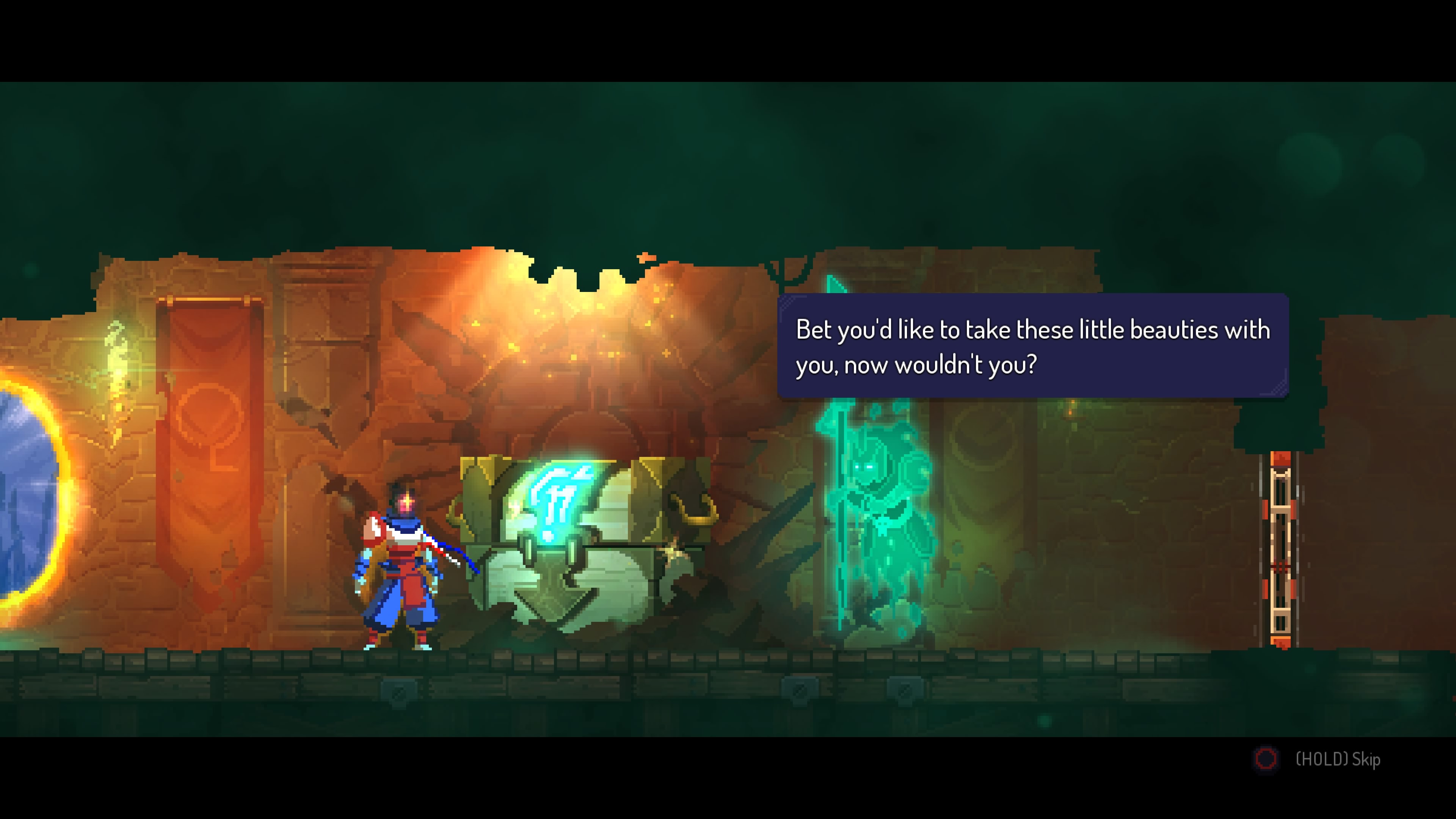 Dead Cells nie jest – wbrew pozorom – pozbawione fabuły, a raczej tła fabularnego, które dzięki odkrywaniu sekretnych pokoi i przyglądaniu się interesującym miejscom, powoli odkrywamy. W grze wcielamy się w…vbloba. Coś o wizerunku zielonego gluta, który wskakuje do zamkniętego w celi bezgłowego ciała i przejmuje nad nim kontrolę – tak rozpoczyna się każde przejście. Wraz z odkrywaniem sekretów świata dowiadujemy się, że znajdujemy się na wyspie, która niegdyś była kwitnącym królestwem do czasu, aż pojawiła się w nim zaraza, zwana The Malice. Gdzieniegdzie dowiadujemy się o królu, który musiał posunąć się do brutalnych rozwiązań ratowania resztek królestwa, co o tym sądzili mieszkańcy, o alchemikach bezskutecznie szukających lekarstwa oraz inne dzieje ludzi. Te czasem potrafią zaskoczyć, np. w trakcie sielankowego biegu przez grę trafiłem na pokój, w którym powiesiła się kobieta, a niedaleko niej w łóżkach znajdowały się kilka martwych „małych ciał” i nóż – jakby ktoś obuchem dał mi po głowie mi. Mimo wszystko nie oznacza to, że Dead Cells jest przesadnie poważne. Twórcy wrzucili do gry również dużo humoru, szczególnie w kwestiach dialogowych czy sarkastycznych przemyśleniach naszego bohatera, który nie raz zabawnie skomentuje coś, co znalazł. Motion Twin zachowało ciekawy balans pomiędzy humorem a intrygującą historią świata gry. Kolejny plus na ich koncie.