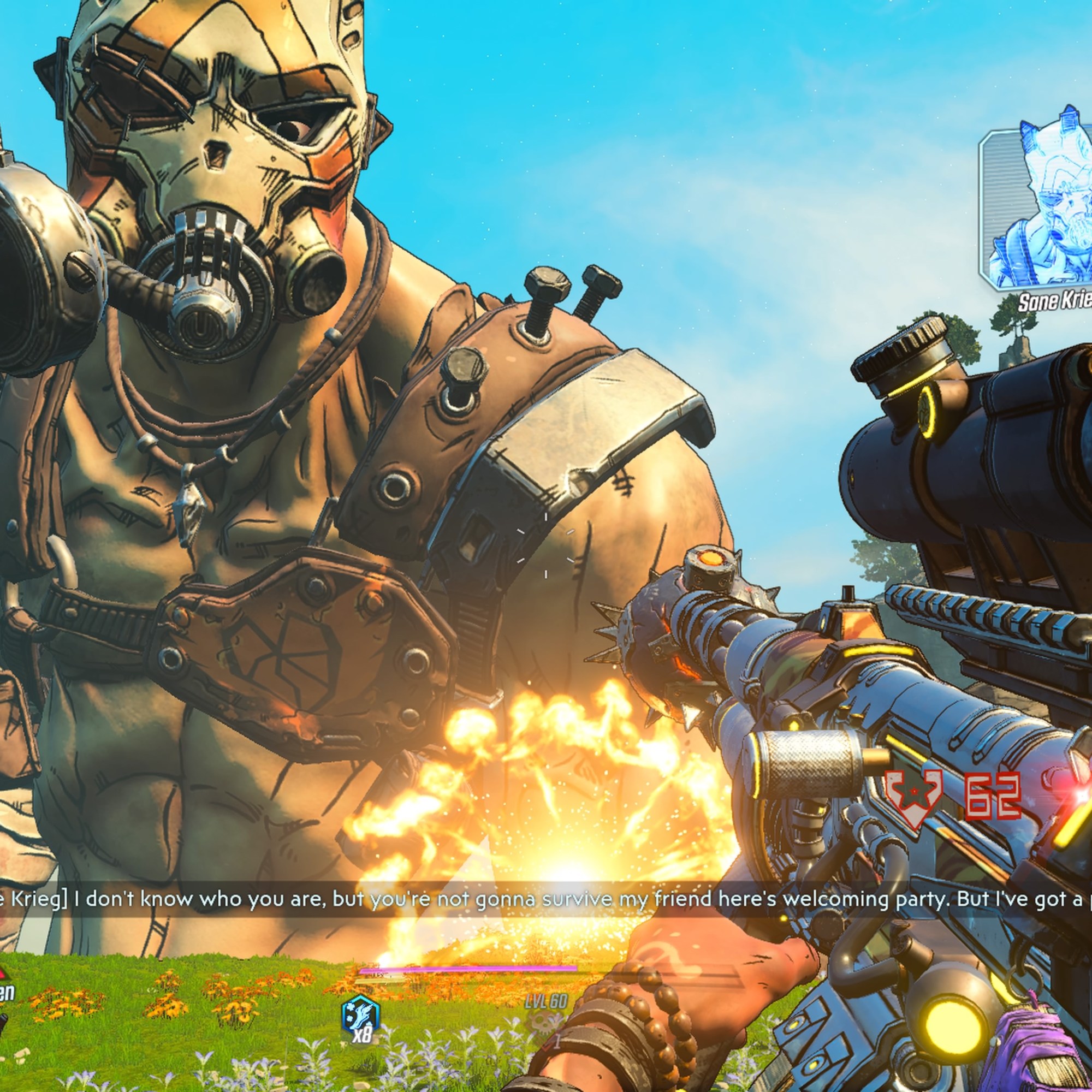 Na zakończenie przepustki sezonowej Gearbox zarezerwowało sobie najbardziej zakręcony pomysł na dodatek: podróż do umysłu/świadomości psychola (czyli popaprańców w maskach z Pandory), a dokładniej Kriega. Dla tych z was, którym to imię nic nie mówi, śpieszę z wyjaśnieniem: Krieg to dodatkowy vault hunter w Borderlands 2, który był dodany do gry jako DLC. A zatem jest to kolejna postać powracająca do serii, po Gaige w dodatku ślubnym, o którym pisałem wyżej – uderzanie w nostalgię i powroty w uniwersum zawsze mile widziane. Szczególnie w tak zakręconej formie. Otóż Tanis wpadła na pomysł zbadania umysłu Kriega, a dokładniej chce się dowiedzieć, co powoduje, że człowiek staje się borderlandsowym psycholem, i prosi nas o pomoc. Oczywiście się zgadzamy i kierujemy Sanctuary na planetę o nazwie Umysł Kriega – jeśli uważacie to za absurdalny pomysł, to macie rację i cały dodatek taki jest. Na miejscu w pierwszej kolejności wita nas sielankowa sceneria rodem z odcinka Kucyków Pony, pełna tęcz i muzyki w stylu 8 bitów. Sceneria szybko znika i spotykamy dwie wersje Kriega. Niebieska (rozważną i spokojną) i czerwona (popapraną i szaloną). Okazuje się, że to, co widzieliśmy jako Krieg jest wypadkową obu tych jaźni. Niebieska wersja Kriega prosi nas o pomoc ucieczki z umysłu swojego prawdziwego ja, albowiem ma dość życia w szaleństwie. Nie jest to natomiast tak proste. Konieczne będzie starcie się z traumami i lękami jego świadomości. Tak mniej więcej jawi się cel dodatku, a przynajmniej jego początkowe założenia.