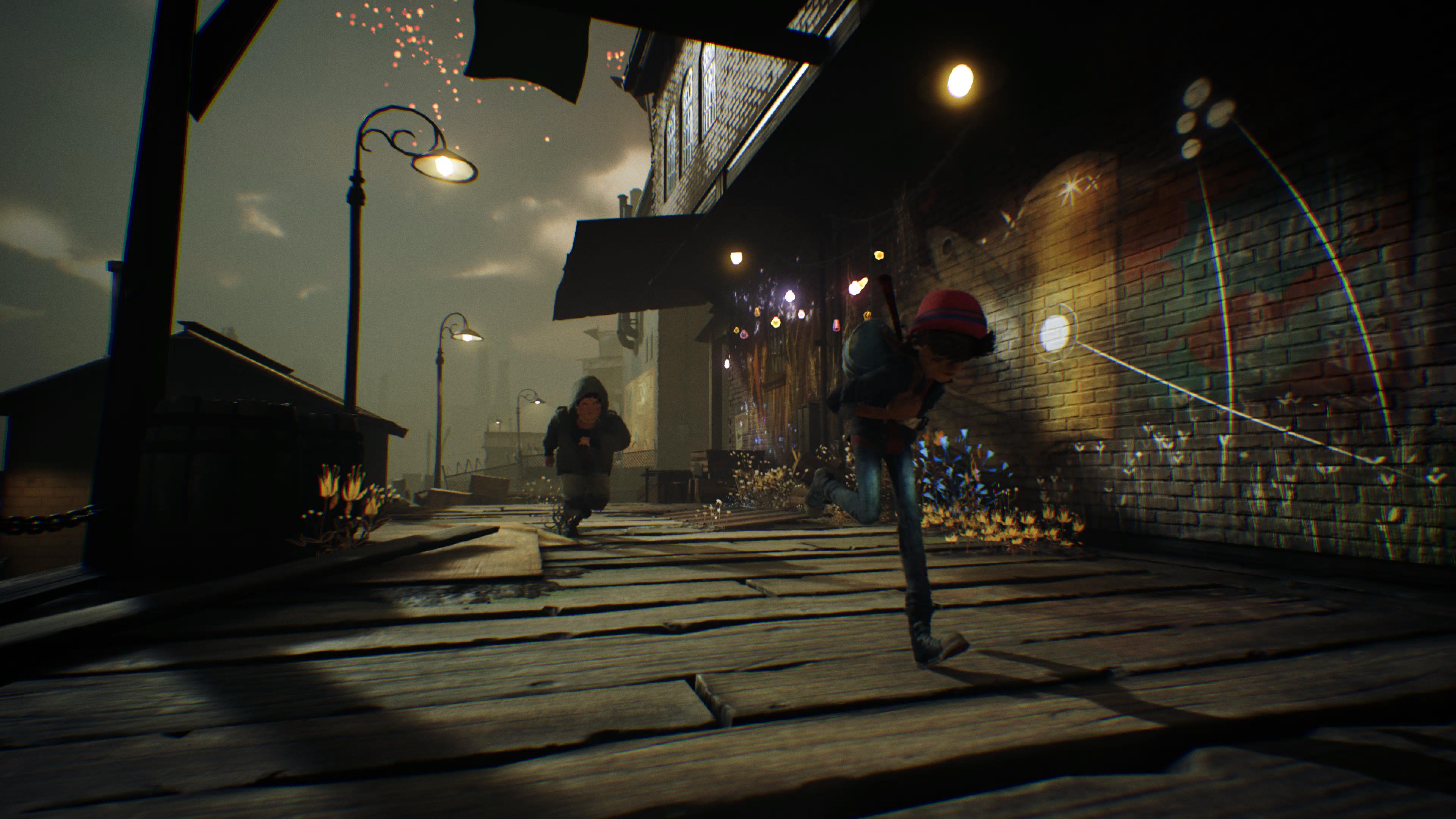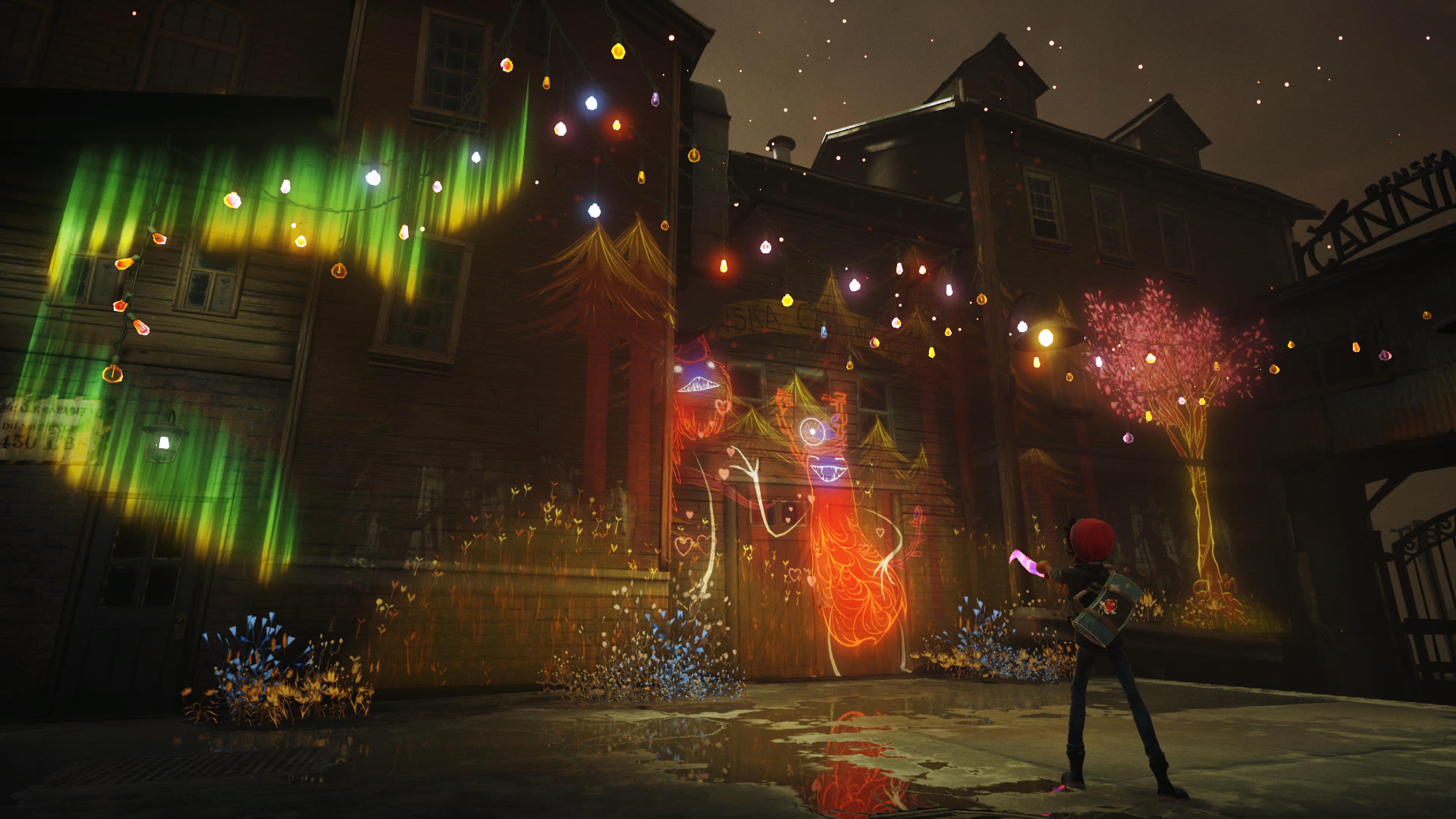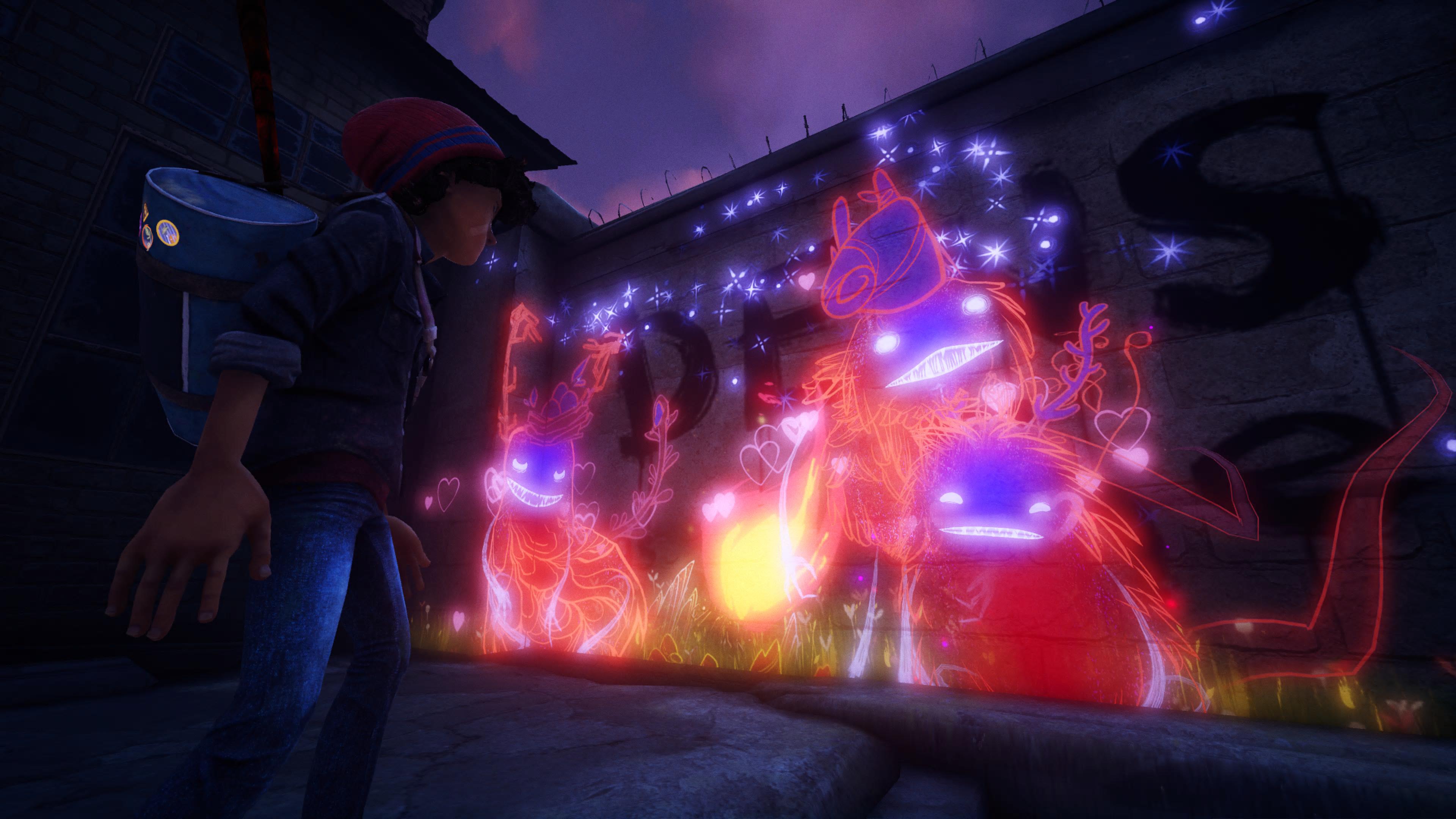 Poza częścią artystyczną rozgrywki nie ma za wiele więcej atrakcji. Są chuligani, których Ash unika w trakcie swojej przygody albo stara się zgubić, gdy zostanie nakryty. Nieco dziwnie, że jako jedyny potrafi wspinać się na wysokości czy wskakiwać na niewysokie obiekty otoczenia, ale cóż. Jak już nam złapią, to gra serwuje czarny ekran i załadowanie zapisu. Można by powiedzieć, że to taki dobrotliwy tytuł – no prawie. Trochę jestem zawiedziony, że tytuł nie utrzymał konwencji zwyciężania zła dobrem do samego końca. Meritum gry było przełamanie mroku, smutku i cierpienia, miłością wyrażoną poprzez barwy rysunków Asha. Natomiast w końcówce dodano do gry, moim zdaniem, na siłę rozgrywkę bardziej nastawioną na akcję i combat. Nawet pomimo faktu, że Ash nie namalował sobie nagle AK-47 czy gigantycznego Buster Sworda, a walczył pędzlem i jego magiczną mocą to żałuję, że twórcy nie utrzymali pokojowego ducha przygody do samego końca. Nie, żeby to był jakiś gigantyczny „fakap”, ale miałem mały niesmak, gdy gra zmieniła się biedne Kingdom Hearts – aczkolwiek to już bardzo osobista kwestia. Zatem jeśli nie rajcuje was kariera artysty graficiarza, to poza tym nie ma tu za wiele. Całość zdecydowanie ciągnie za sobą historia, ale i również oprawa. Pixelopus już przez Entwind pokazali, że mają dobrze nastrojony zmysł artystyczny (i lubią opierać gry o jeden element rozgrywki), a Concrete Genie to tylko potwierdza. Pierwsze skrzypce grają oczywiście naścienne malunki, dżiny i efekty związane z ich powstaniem. Murale Asha są przepełnione bogatą paletą barw i odcieni. Ślicznie zrealizowane są również towarzyszące im drobne animacje, widoczne np. przy malowaniu wyrastającego drzewa czy porannej zorzy. Dżiny posiadają uroczy design, który trochę przypominał mi Muminki, choć nie do końca wiem czemu. Animacje postaci w grze zrealizowano w stylu przypominającymi filmy z montażem poklatkowym. Nawet jeśli nie widać tego na pierwszy rzut oka, to spojrzenie na mimikę bohaterów od razu przypomina takie produkcje, jak chociażby świetne „Kubo i Dwie Struny”. Dopełnieniem estetyki są przerywniki, pokazujące przeszłość dzielnicy albo jej mieszkańców, które wykonano w jeszcze innym stylu, przypominającym książkowe ilustracje czy komiksy. Zasadniczo widać, że to po stronie artystycznej tkwi siła studia, a ponieważ nie jest to ekipa liczna, to zarówno skala gry, jak i tego teksu na tym się zamyka.