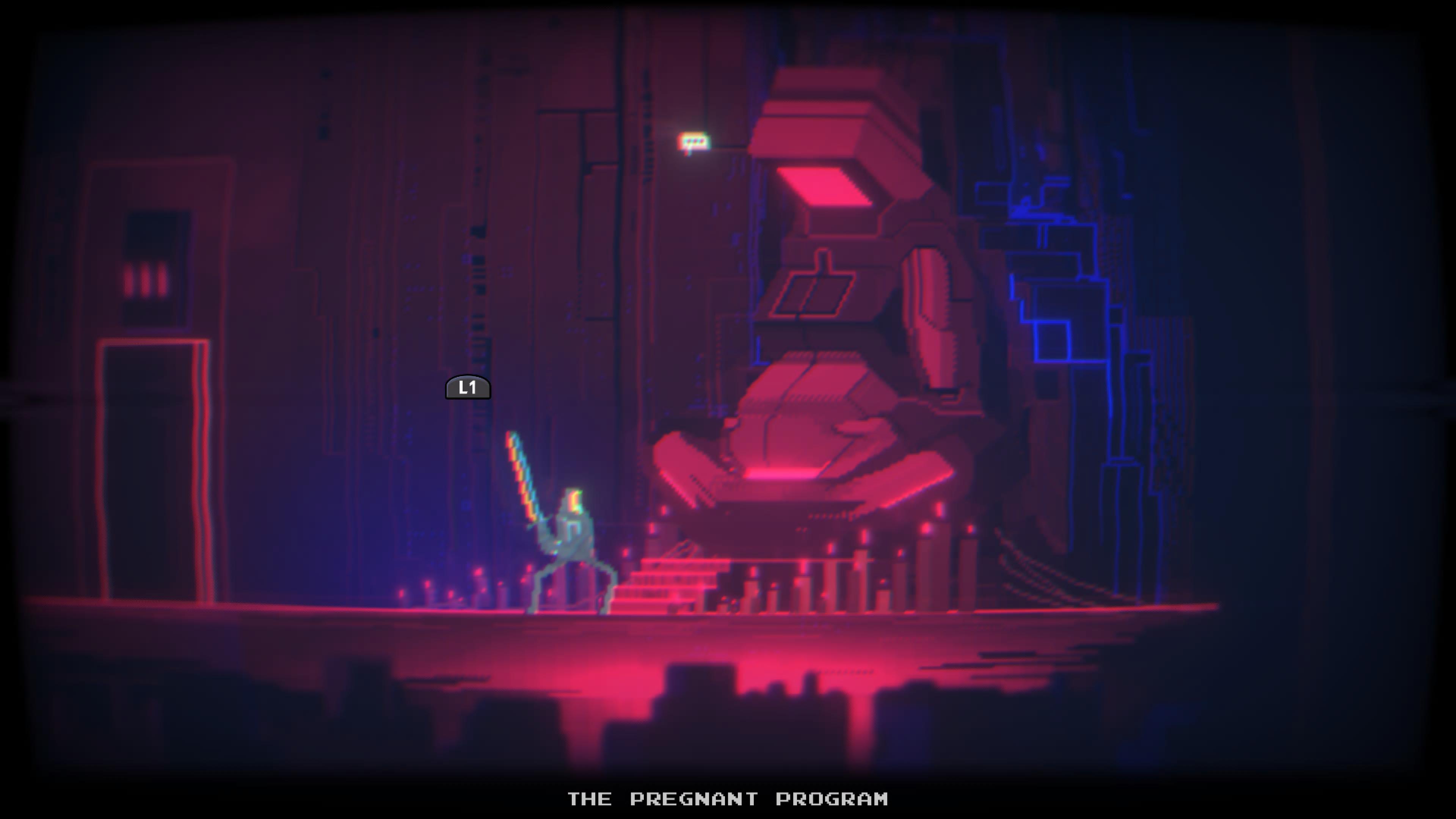 U podstaw Narita Boy to platformer 2D z bardzo klasycznym dla gatunku gameplay’em. Poruszanie się to lewo, to w prawo. Przeskakiwanie pomiędzy poziomami sceny na przycisku skoku, czy skoku z dolnym kierunkiem. Nasz bohater reaguje na komendy zero-jedynkowo. I właściwie tyle. Jak mówiłem, stara szkoła na pełnej. Równie klasycznie wygląda system walki. Tytułowy Narita posługuje się mieczem oraz bronią palną, która w sumie też jest tym samym mieczem – trochę jak Gunblade z ósmego fajnala. Jeden i drugi rodzaj ataku posiada swoją dopakowaną wersję, którą wykonujemy poprzez przytrzymania odpowiadającego jemu przyciskowi na padzie, przy czym reużywalność tego drugiego podyktowana jest załadowaniem pełnego magazynku w broni, który się samoczynnie regeneruje. Repertuar ruchów w trakcie walki urozmaicają takie akcje jak szarża barkiem, która dodatkowo wytrąca z równowagi gardę wrogów oraz unik. Obie mechaniki służą również do pokonywania większych przeszkód i przepaści, co jest często eksploatowanym wzorcem w gatunku. Raczej wszystko, czego moglibyśmy się spodziewać po dwuwymiarowej grze akcji w 2021.