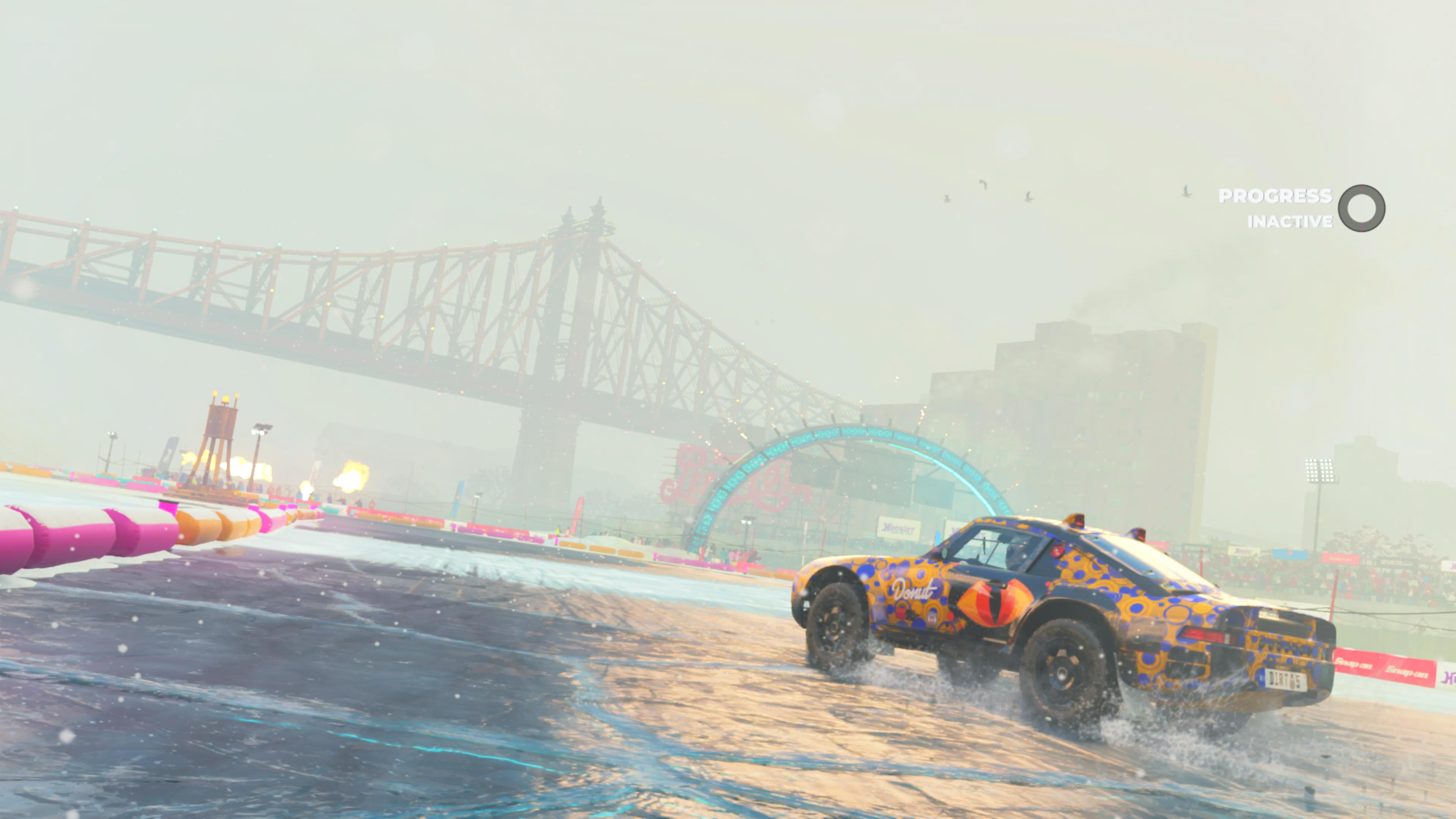 W klimat produkcji idealnie wprowadza nas filmik na początku gry. Duch imprezy, jaskrawe kolory, egzotyczne lokacje, a w głośnikach soczyste „My Name is Thunder” od połączonych sił The Bloody Beetroots i kapeli Jet. Tak. Dokładnie tak zapamiętałem ostatnie moje doświadczenia z Dirtem – rajdowe MTV. Całość produkcji osadzona jest w klimacie, który najlepiej określa się jako ‚sztos’, czy cokolwiek dzisiejsza młodzież używa. Kolorystyka i klimat przenosi się od torów na menu gry, gdzie wszelkie ekrany oraz opcja dosłownie krzyczą swoją styluwą. Twórcy chcieli pewnie tym samym dotrzeć do szerszego grona odbiorców, a w szczególności młodszych graczy – tych, dla których np. seria Dirt Rally jest zbyt „na serio”. W efekcie przypomina mi tego mema z Steve’em Buscemi, w którym to stara się wtopić w środowisko młodzieżowe jako starszy pan 50+. Sam jestem pewnie zaliczanym do boomerów, więc mnie to aż tak nie boli, ale starania są aż nadto wyraźne. Jak już nadmieniłem, wyścigi osadzone są w atmosferze imprezy. Gra rzuca nas od zawodów do zawodów w całkiem sporej grupie krajów. Region Arizona w USA, Brazylia, Chiny, Grecja, Włochy, Maroko, Nepal, Nowy York, Norwegia and Południowej Afryki. Każdej lokacji towarzyszy prawdziwa pompa: fajerwerki, miotacze ognistych języków, rzucający konfetti widzowie, wrzawa w trakcie przejazdu obok trybun – muszę przyznać, że to mi się podoba. Na myśl przychodzi mi Motorstorm, który również jako impreza zapaleńców dawał radę. Lubię, kiedy tor żyje. Tu i tam przeleci nad nami samolot wyczynowy, krojący niebo kolorową racą albo pojawi się helikopter, unoszący się w miejscu nad torem. Wisienką na torcie jest natomiast muzyka na stadionie. Pierwszy raz się z czymś takim spotkałem i uważam to za kozacki patent. Muzyka w trakcie wyścigu reaguje na umiejscowienie trybun z publicznością, a raczej z rozłożeniem nagłośnienia na trasie. Świetny system, który jeszcze bardziej napędzał poczucie uczestniczenia w prawdziwym wydarzeniu. I choć w opcjach jest możliwość zmiany efektu na bardziej klasyczny, a więc jednostajną ścieżkę dźwiękową, tak nie wyobrażam sobie, po co ktoś miałby to zmieniać – kapitalnie się przy tym jeździło i orientowało na trasach. Początek wyścigu, wrzawa i ryczące Jackiem White’em głośniki, które w trakcie wyścigu się wyciszają, aby znów stopniowo dochodzić do nas z oddali, zbliżając się do mety. Sztos!