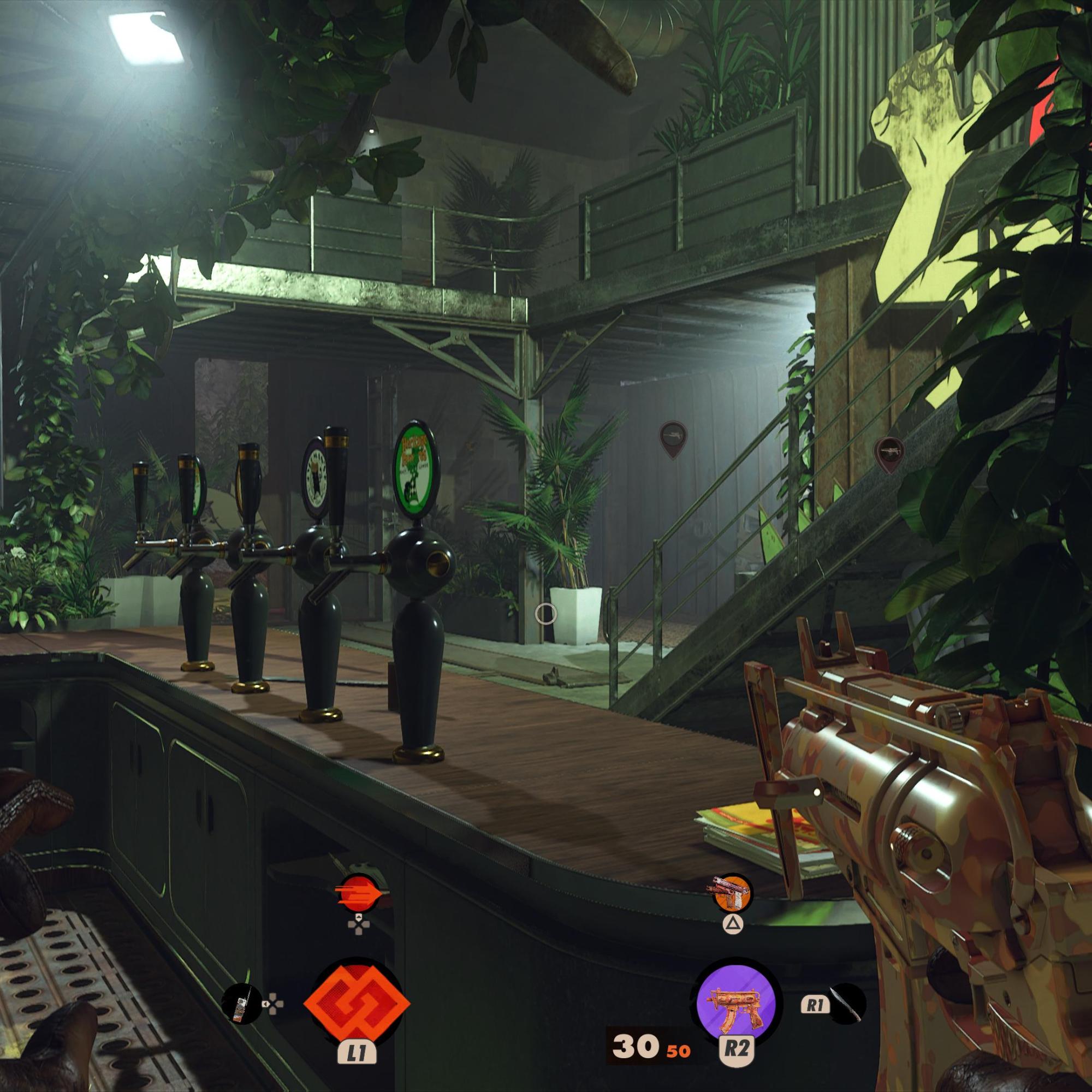 Deathloop również bardzo dobrze prezentuje się od strony artystycznej. Jeśli jesteście fanami klimatów filmów szpiegowskich z lat 60-tych, a szczególnie kultowych Bondów, to grając w tytuł, będziecie w siódmym niebie. Cała gra przepompowana jest klimatem i energią tego okresu, w połączeniu z masą gadżetów oraz technologii stylizowanej na te lata. Styl ten zauważalny jest od samego UI oraz wszelkich ekranów menu gry, po warstwę audio. Znalezienie interesującej wskazówki w trakcie rozgrywki lub zrobienie poważnego kroku w postępie narracji, kwitowane jest jinglem, który – przysiągam – musiał zostać wycięty z któregoś Bonda albo No One Lives Forever z PS2. Swoją drogą wszystko, co w grze usłyszymy, ma taki klimat. Nawet utwór promujący grę, a więc „Deja Vu”, brzmi jak rozbiegówka kolejnego filmu o Agencie 007. Kierunek został odpowiednio zrealizowany w ubiorze bohaterów, plakatach, rozrzuconych gazetkach czy technologię (z lekkim naciągnięciem w stronę sci-fi), aż po architekturę i umeblowanie pomieszczeń. Jest coś niezwykle przyciągającego w tym stylu. Sama grafika natomiast prezentuje się od strony wykonania, należycie dobrze, żeby nie powiedzieć bardzo dobrze. Choć raczej nie spotkałem się z momentem, który swoją prezencją absolutnie wyrwałby mnie z butów, to jednocześnie nic nie zraziło mnie na tyle, aby było warte wspomnienia w tym miejscu. Natomiast, gdyby ktoś mnie zapytał, czy Deathloop wizualnie nie zmieściłby się na PS4, to miałbym problem zaprzeczyć. Na pewno gra nie osiągałaby takiego odświeżania jak na piątce, a jeśli chip ze szczepionki Billa Gatesa nie nawala, to licznik klatek w lewym oku wskazywał stabilne sześćdziesiąt fps’ów.