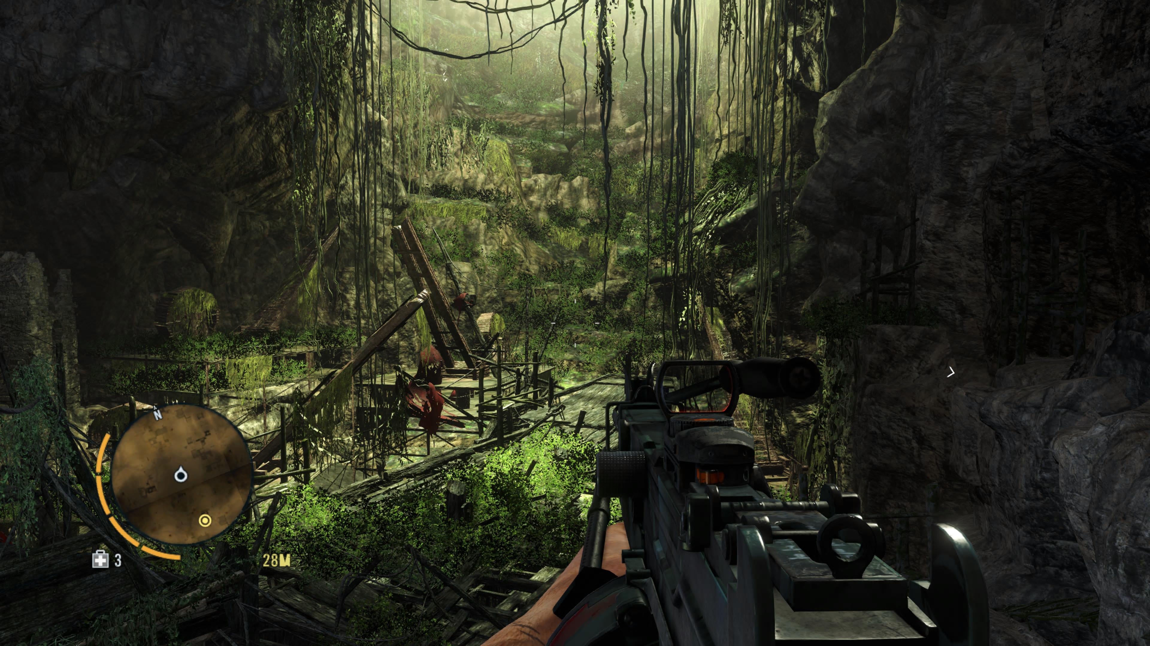 Far Cry 3 bardzo szybko wrzuca nas w wir szamba, w jakim znalazł się Jason Brody, główny bohater gry. Po spędzeniu zajebistych wakacji (czy urlopu) z grupką ziomali, z całą ekipą trafił w ręce uzbrojonych po zęby handlarzy ludźmi, piratów i morderców w jednym. Całą grupą oprychów dowodzi niejaki Vaas, totalny szajbus i popapraniec, który od pierwszych zdań wypowiedzianych w naszą stronę przez bambusowe kraty, zrobił na mnie wrażenie. Chwilę po spotkaniu z Vaasem, udaje nam się wydostać z klatki, wraz z naszym bratem. Parę metrów skradania się po obozie kończy się tragicznie dla krewnego, a nas – w ramach chorej gierki – przegania z obozu Vaas, spuszczając za nami psy oraz swoich żołnierzy. Następnie klasyk: zjazd po zboczu, spadek z urwiska do wody i cięcie. Budzimy się na chacie niejakiego Dennisa, który wrzuca nam na łapę tatuaż, a po chwili gadania, daje nam broń do ręki i wysyła nas na pierwszą misję. Tak rozpoczyna się historia, w której to amerykański nastolatek (może lekko starszy) stanie się maszynką do zabijania, myśliwym, mistrzem kierownicy, ekspertem od broni palnej i ładunków wybuchowych, królem dżungli, samcem alfa i łamaczem serc niewiast. Serio. Historia ogólnie nie jest najgorsza, ale na pewno nie należy do wielkich dzieł pisarstwa gamingowego. Trochę śmierdziała mi kryzysem wieku średniego, w której to autor rozmarzył się nad koncepcją: od zera do ogiera. Bez dwóch zdań natomiast, pierwsze skrzypce grają tutaj postacie. Te napotykane przez nas na skutek wydarzeń w grze, ale przede wszystkim Jason i Vaas. Ich „związek” na przestrzeni całych poszukiwań przyjaciół przez Jasona, będzie na świeczniku wydarzeń w grze. Do tego stopnia, że gdy fabuła przestaje nim podążać, cała historia siada. Aby nie zdradzić za wiele, to powiem tak: drugiego aktu (oraz wszystkiego z nim związanego) mogłoby równie dobrze nie być w grze i chyba wyszłoby to jej na dobre.