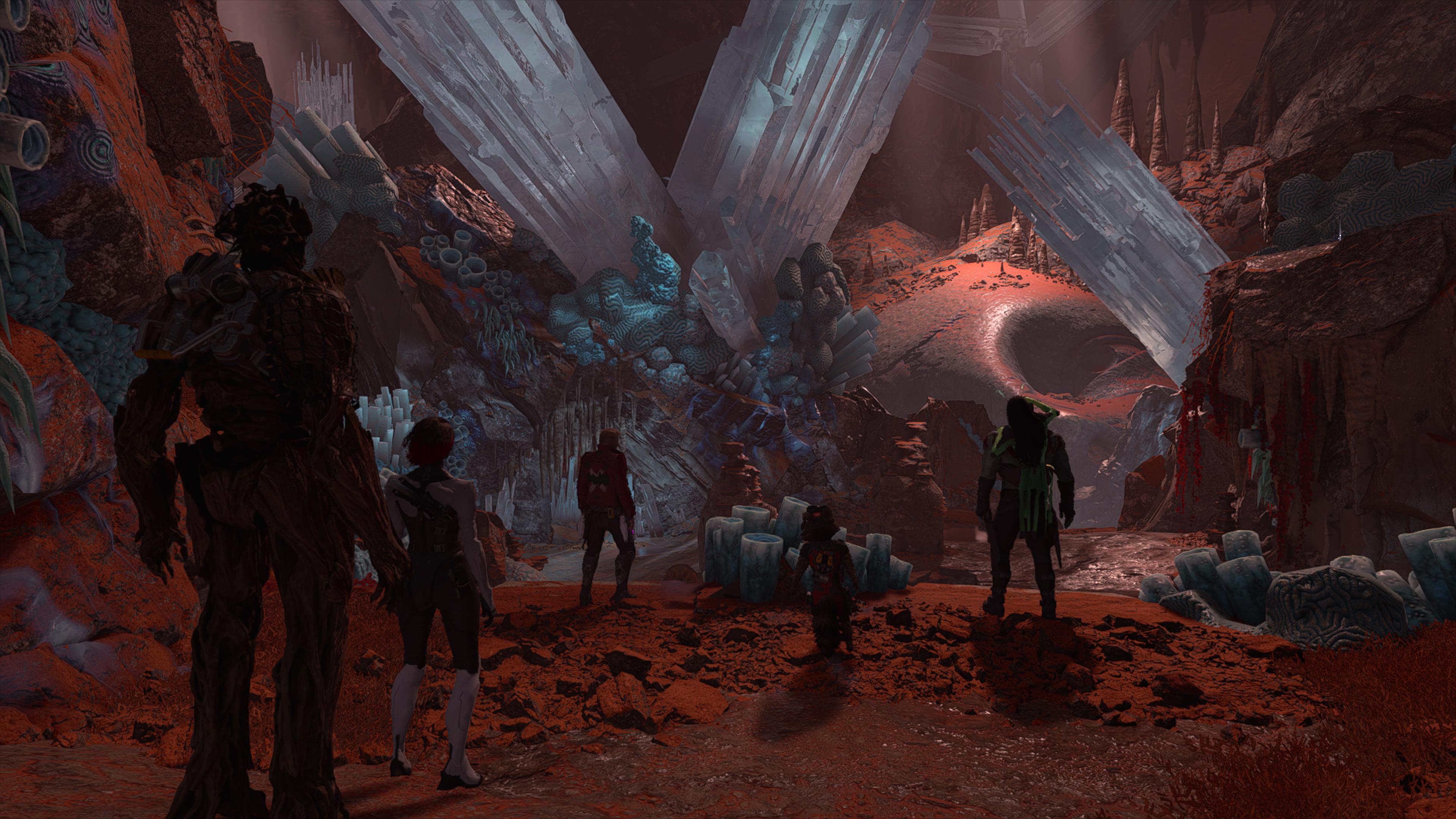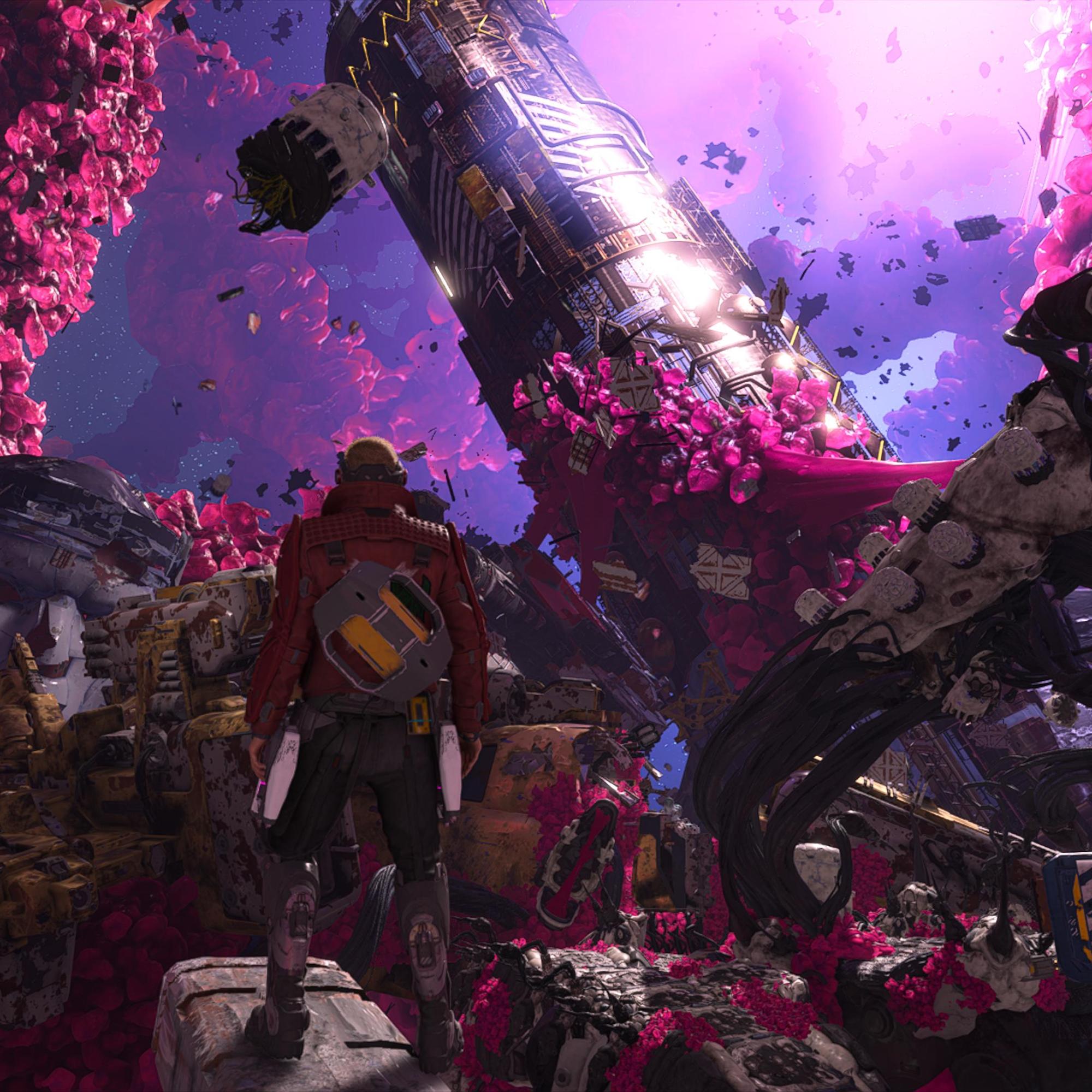 Nie pamiętam, kiedy ostatnio tyle się rozpisałem o oprawie audio, więc przydałoby się teraz trochę powiedzieć o oprawie wizualnej – a jest o czym. Po pierwsze bardzo podobają mi się wizerunki całej drużyny Guardians of the Galaxy. Avengers od Crystal oberwało się za nadmierne odejście od wizerunków gruntowanych w naszej podświadomości przez kino i trochę się obawiałem, że tutaj będzie podobnie, Na szczęście nie słyszę specjalnych lamentów w tym wątku. Najwidoczniej nie jestem jedynym, którym nowy design postaci się podoba. Gra również cieszy oko, gdy spojrzymy na otoczenie i widoczki. Obojętnie czy jesteśmy w korytarzach stacji kosmicznej, czy na powierzchni cudownej kosmicznej planty. MARVEL’s Guardians of the Galaxy to bardzo ładna gra. Nie jestem specjalnie dobry w photo mode, ale mam nadzieję, że kilkoma screenami w recenzji to potwierdziłem. Ładnie prezentuje się już pierwsza lokacja, która jest cmentarzyskiem statków kosmicznych, dryfujących w otoczeniu różowej pianki izolacyjnej. Oko cieszą jaskrawe kolory w połączeniu z ze stalą wraków. Po chwili zmieniamy estetykę na wnętrze stacji kosmicznej, aby za chwilę wrócić znów w bardziej dzikie, aczkolwiek równie barwne rejony. Jest na czym zawiesić wzrok i czemu robić fotki, co community wirtualnej fotografii skrzętnie wykorzystuje – choć najwięcej portretów zbierają postacie, również świetnie wykonane, co cała reszta. Mój licznik FPS-ów nie działał za dobrze, więc nie jestem pewien, czy gra działa w 60 fpsach, ale niezależnie od ilości fajerwerków na ekranie, nawet nie kwiknie. Technicznie z tytułem jest wszystko w najlepszym porządku, a wpadki, które oczywiście są, tytuł zalicza bardziej w warstwie designu. Szczególnie w pamięci utkwiło mi poruszanie się po wąskich przejściach czy szczelinach pomiędzy skałami, które są jednokierunkowe. Wchodząc w interakcję z nimi i poruszając się w jedną stronę, nie możemy się cofnąć. Powiedziałem do siebie wtedy, że rzeczywiście, twórcy celowali w zapewnienie rozrywki, jak za dawnych lat. Gra też czasem potrafi nie załadować jakiegoś wydarzenia w grze, przez co musimy ładować ostatni save. Natomiast rzeczą, która chyba najbardziej mnie zniesmaczyła, była zagadka w jaskiniach, przy sekcji z Mantis jeżdżącej „na barana” – jak zagracie, to sami się zorientujecie, jak mało intuicyjną zagadkę przygotowali twórcy.