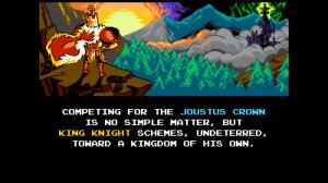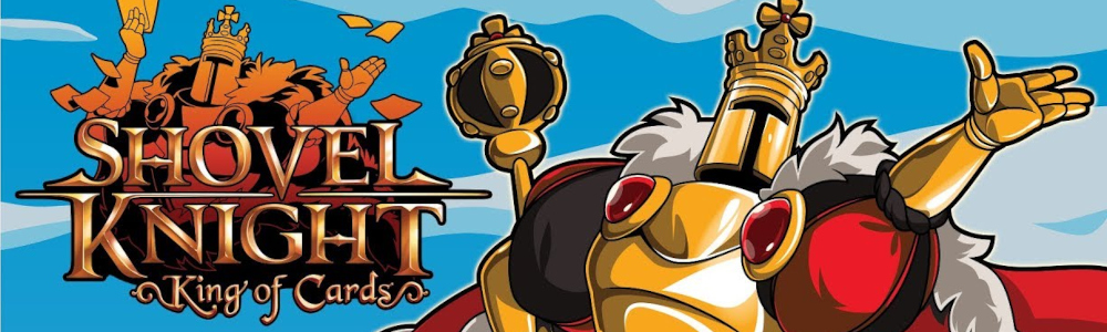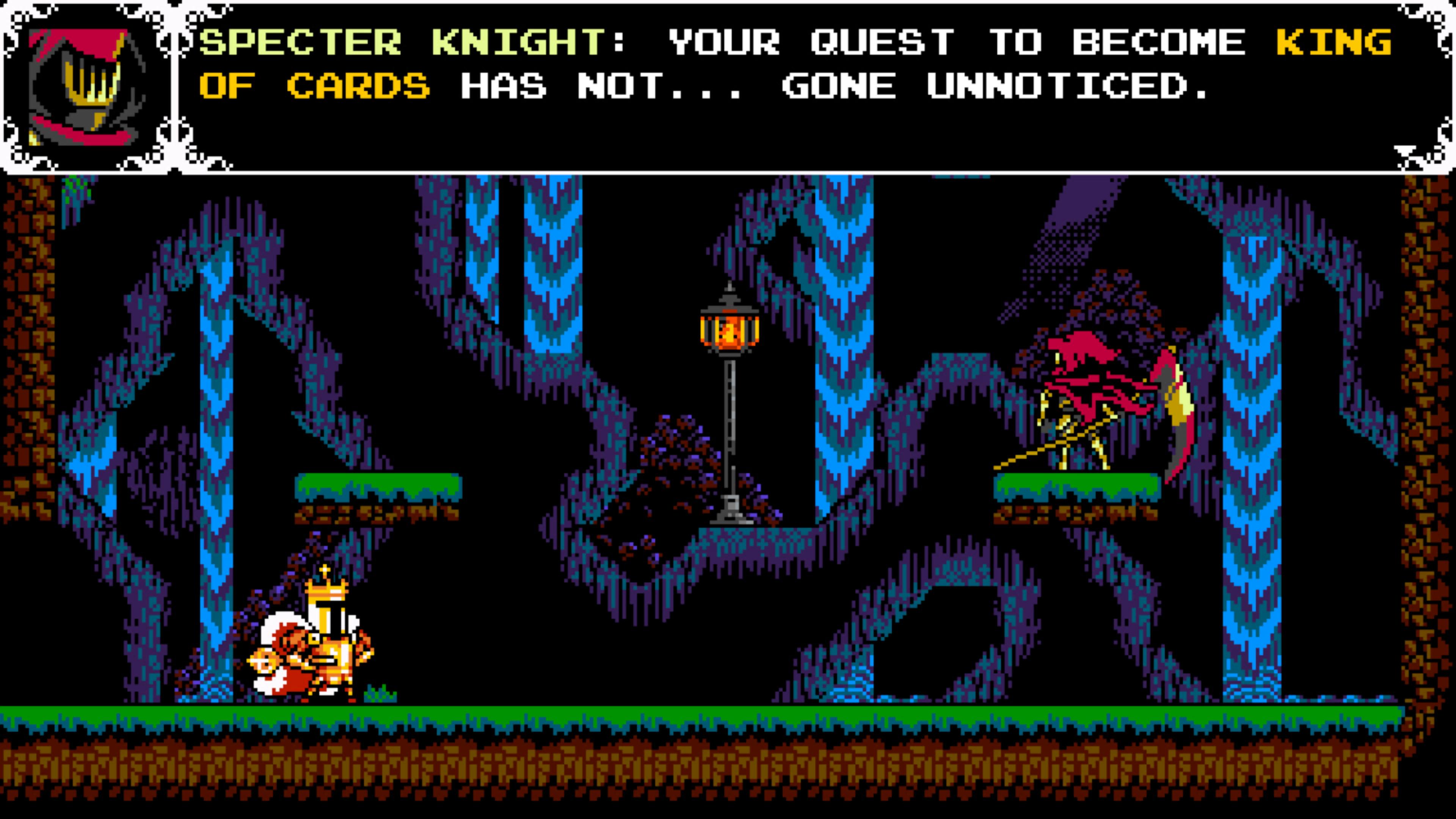 King of Cards to kampania fabularna skupiająca się na King Knight, a więc jednemu z przeciwników niebieskiego rycerza, co kontynuuje zamysł pozostałych dodatków. King Knight marzy o władzy. Tak po prostu. Chciałby rządzić, aczkolwiek na razie jedynym osobami, które mu służą, jest jego mamusia oraz gromada domowych szczurów. Rycerz jednak ma plan. Otóż światem gry zawojowała gra karciana o nazwie Justus. Grają w nią wszyscy mieszkańcy świata, a jak głosi legenda: kto pokona wszystkich trzech mistrzów/królów Justus, ten zdobędzie niesamowity skarb oraz koronę króla. Rycerz zatem wsuwa ciasto mamuśki i rusza w drogę ku zostaniu mistrzem Justus i zdobyciu królestwa pod swoje władanie. Atmosferą dodatkowi jest bliżej do kampanii Plague Knight, a więc znajdziemy tutaj dużo humoru, zabawnych kwestii dialogowych oraz poważny cel, który na zakończenie robi się bardzo poważny, a wręcz i okrutny – co nie powinno być zaskoczeniem dla osób znających podstawową grę. Tym samym jest też różna od bardzo poważnej historii Specter Knighta. Występuje tutaj również znacznie więcej postaci pobocznych, których większość można skojarzyć z historii Łopatowego Rycerza. Fajnie było zobaczyć sporo z nich w nowych rolach i gagach. Wspominałem, że King of Cards jest lżejszą opowieścią niż poprzedni dodatek, co natomiast nie oznacza, że potraktowano go po macoszemu. Nadal cała historia musi wpasować się w uniwersum ustanowione przez poprzednie trzy opowieści i robi to bardzo dobrze. Znając właściwie ostatni z rozdziałów, można się spodziewać tego, jak zakończy się dodatek, aczkolwiek nie ujmuje to całokształtowi, który śledzi się przyjemnie i nie raz z uśmiechem na ustach.