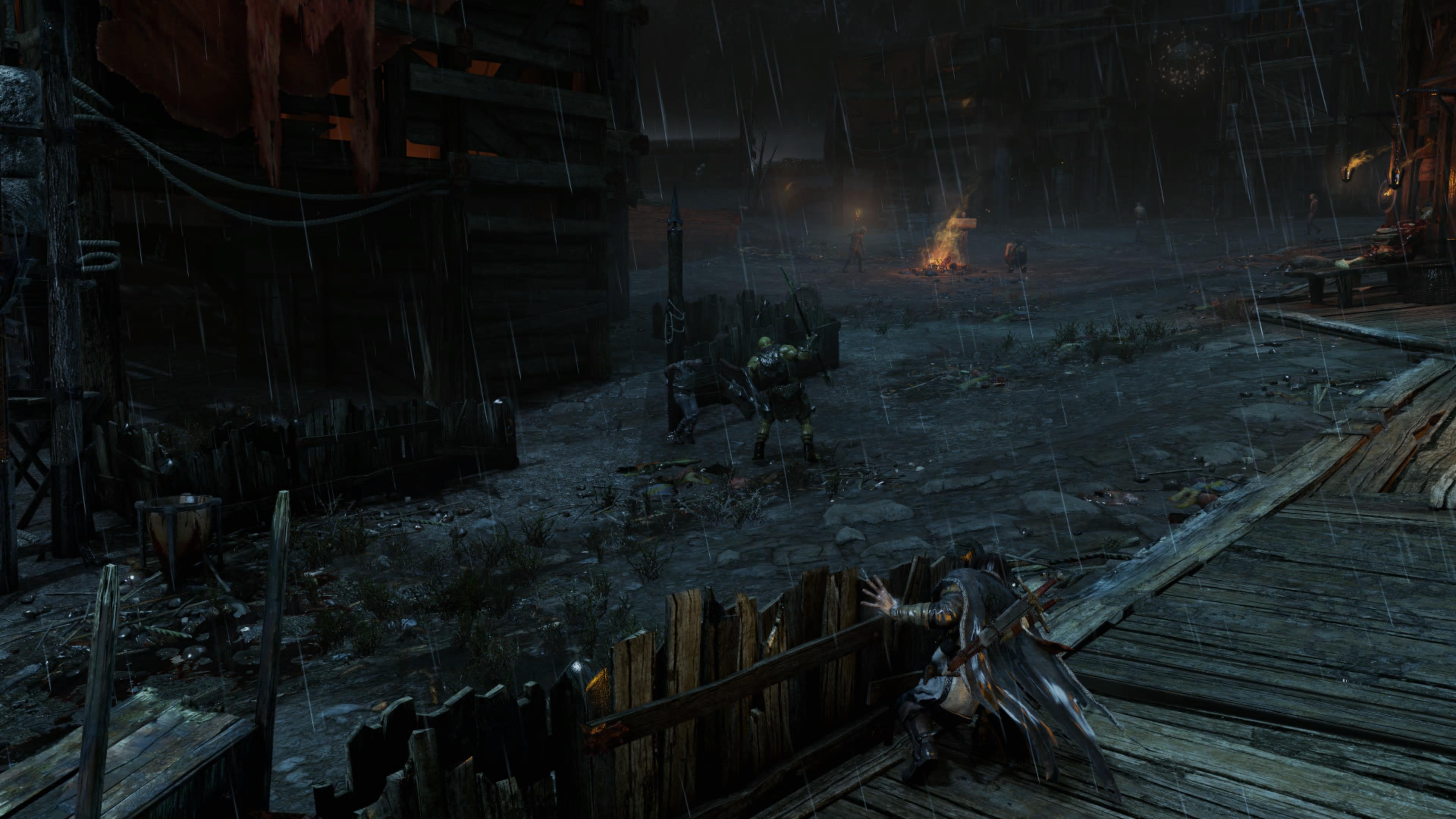 Kolejny scenariusz: jesteście w samym środku misji wykończenie jednego z generałów armii, a analizując sytuację wokół okazuje się, że w jego otoczeniu chadzają sobie trójka kapitanów. Sytuacja zupełnie losowa, po prostu akurat mieli jakiś biznes w tym samym miejscu. Z jednej strony okazja na upieczenie kilku pieczeni na jednym ogniu, ale i wyzwanie zdecydowanie trudniejsze. Muszę przyznać, że rzeczywiście Nemesis to coś wyjątkowego i zdecydowanie ratuje on rozgrywkę w Shadow of Mordor. Wspominałem o zapożyczeniach, czy wręcz zerżnięciach mechanik z innych produkcji. Zerżniętych tak dobrze, że Talionowi zdarzy się zupełnie nie odczytać moich zamiarów (a wiadomo, że to nie moja wina) i wykonać skok ze wzniesienia w kierunku, którego zupełnie nie wybrałem albo kręcić się w kółko na gzymsie – jeśli ktoś grał w Assassin’s Creed to wie, o czym mówię. Teraz sobie przypomniałem, że jest nawet kopia trybu detektywa z Batmana. Do tego warto powiedzieć, że ogólnie gra jest książkowym przykładem tytułu typu open-world, z zadaniami pobocznymi, wyzwaniami dodatkowymi i znajdkami do odszukania. Ogólnie rzecz biorąc, zawartość ta jest do zapomnienia w sporej mierze, choć pełne VO materiałów czytanych mnie ucieszyło. Gra nosi piętno między-generacji (i to w dodatku pomiędzy PS3 a PS4), więc do jej już znaczącego wieku, dochodzi jeszcze to. Mordor, po który się poruszamy jest brzydki jak cholera. Jakościowo jeszcze jest nieźle, ale estetyka świata wprowadza w depresję. To jednocześnie produkcja z pierwszych lat poprzedniej generacji, więc trudno się temu dziwić — zresztą, najlepiej skwitowała sytuację moja małżonka: „Grasz w grę o tytule Cień Mordoru i dziwisz się, że świat jest ohydnym pustkowiem?”. I w sumie racja. Mordor jest utrzymany w barwach szarości i brązu. Wszędzie albo połacie pozbawionej życia gleby, skały albo fortyfikacje armii orków. Patrząc od tej strony to nawet i powinno się nagrodzić ekipę Monolith za dosyć wiernie oddane ziemie Saurona. Mega dobre natomiast wrażenie na mnie zrobiły modele paskudnych przeciwników. O różnorodności już pisałem, a tutaj chodzi mi bardziej o ich faktyczny wygląd. Są równie odrażający, co ci z filmów Jacksona i to jest super.