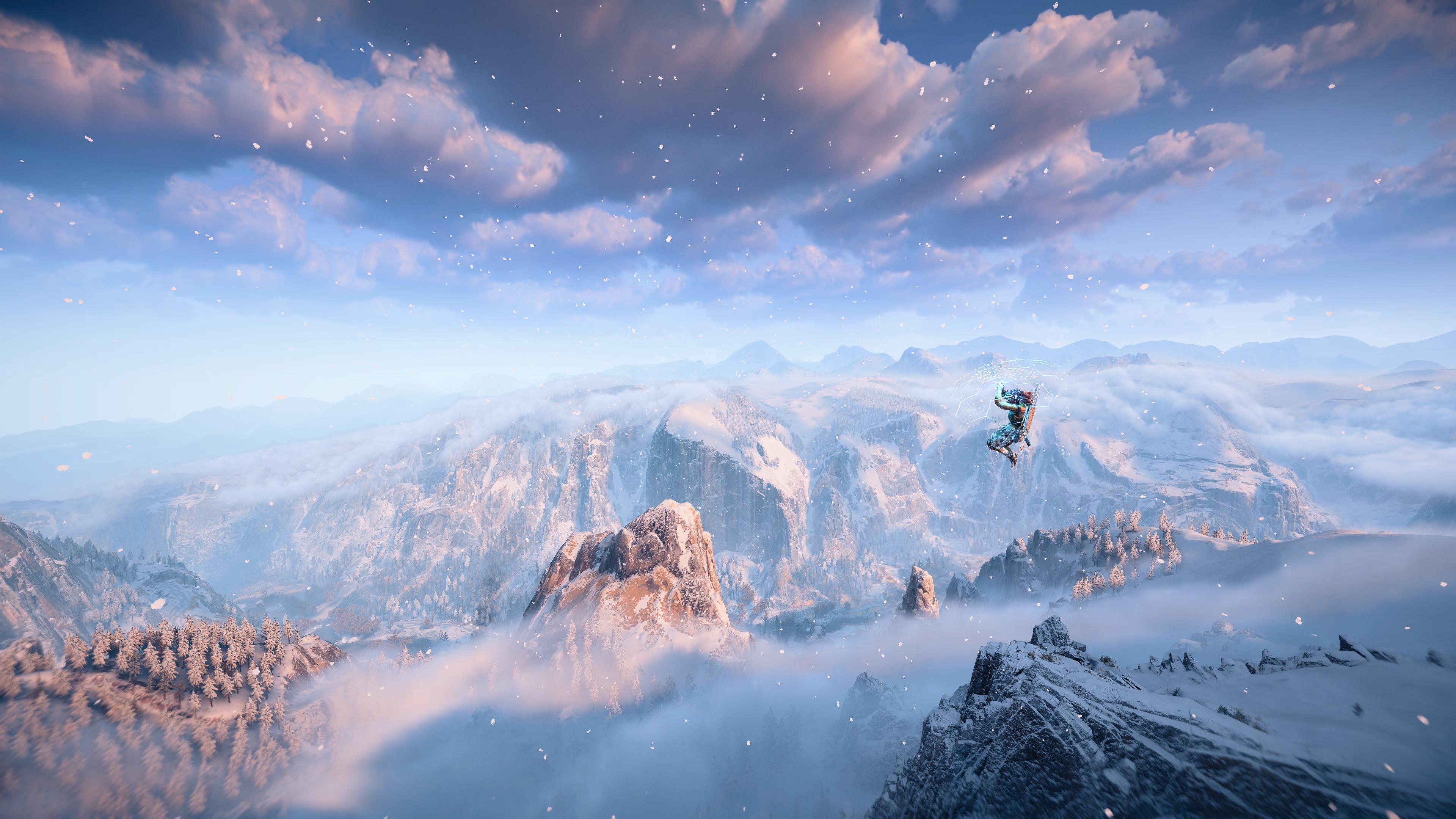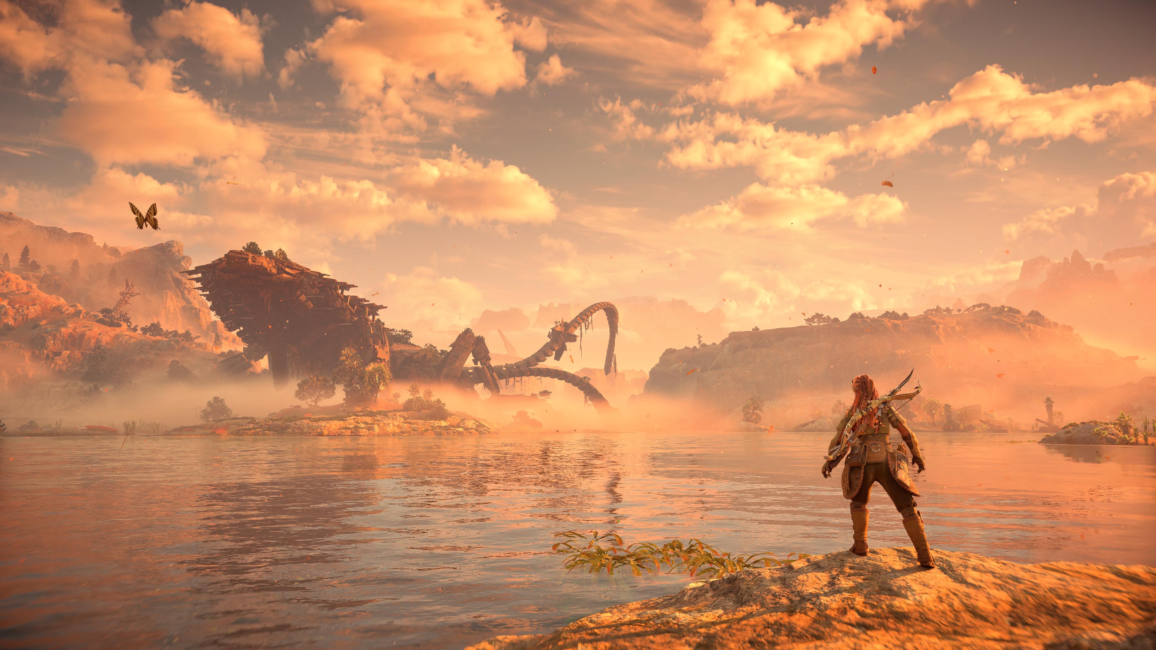 Zatem kiedy dorzuciłem już szczyptę dziegciu grze Guerilla Games, mogę spokojnie przejść do chyba największej zalety tytuły, a na pewno tej najwyraźniej widocznej — oprawy graficznej. Wszystkich tych, których ulubionym zajęciem przy pierwszej części, było nazywanie jej „piękną wydmuszką”, chciałbym uspokoić, że i tym razem wszelkie podobne określenia dla części wizualnej gry są, jak najbardziej na miejscu. Powiem krótko: czegoś takiego jeszcze nie widziałem. Nie widziałem na konsolach. Nie widziałem na pecetach. W filmach, zwiastunach, czy prezentacjach silników. To jak prześlicznie wygląda Zakazany Zachód, jest absurdalne. Przyzwyczaiłem się, a może raczej stało się to dla mnie naturalne, że ostatnie przemiany generacyjne w konsolach, nie są już tak widowiskowe, jak to miało miejsce, gdy przeskakiwaliśmy z pierwszego na drugie PlayStation, czy później na trzecie. Im dalej tym efekt mniej powalał. Pod koniec poprzedniej generacji Sony dostarczyło nam sporo pięknych produkcji — a szczególnie Ghost of Tsushima od studia Sucker Punch. Nowy tytuł Guerilla oraz Tsushima to podobny poziom. Oba światy są prześliczne i niesamowicie bogate w różne biomy, natomiast Horizon przekręca każdy z tych aspektów o stopień wyżej. W „duchu” na stop-klatce mogliśmy dostrzec hacki, jakie twórcy zastosowali, aby gra tak cudownie wyglądała na PS4, natomiast tutaj nie ma mowy o półśrodkach. Mapka Forbidden West jest ogromna i składa się na nią wiele charakterystycznych, zupełnie odmiennych i fenomenalnie wykonanych ekosystemów, ze swoimi warunkami pogodowymi, fauną czy ukształtowaniem terenu. Chwilę pędzimy przez rozpalone słońcem pustkowie, aby wpaść za chwilę w gęsty las, przejść przez zaśnieżone góry, mokradła, czy stepy. Kopara wali o glebę. Do tego wszystkiego pełny system cyklu dnia i nocy. Grałem w tytuł na PS5, z włączonym trybem preferującym grafikę i rozdzielczość, względem klatkarzu — jak zwykle zresztą. Gra się nie zacinała, widocznie nie opadała w fps-ach, nie zauważyłem żadnego doładowywania się tekstur czy wyskakujących obiektów. Majstersztyk ze strony Guerilla Games i ich silnika Decima. Mimo wszystko to, nad czym się rozpływam, to tylko dotyczy świata gry, a co nawet nie jest dla mnie największym sukcesem artystów z niderlandzkiego studia.
