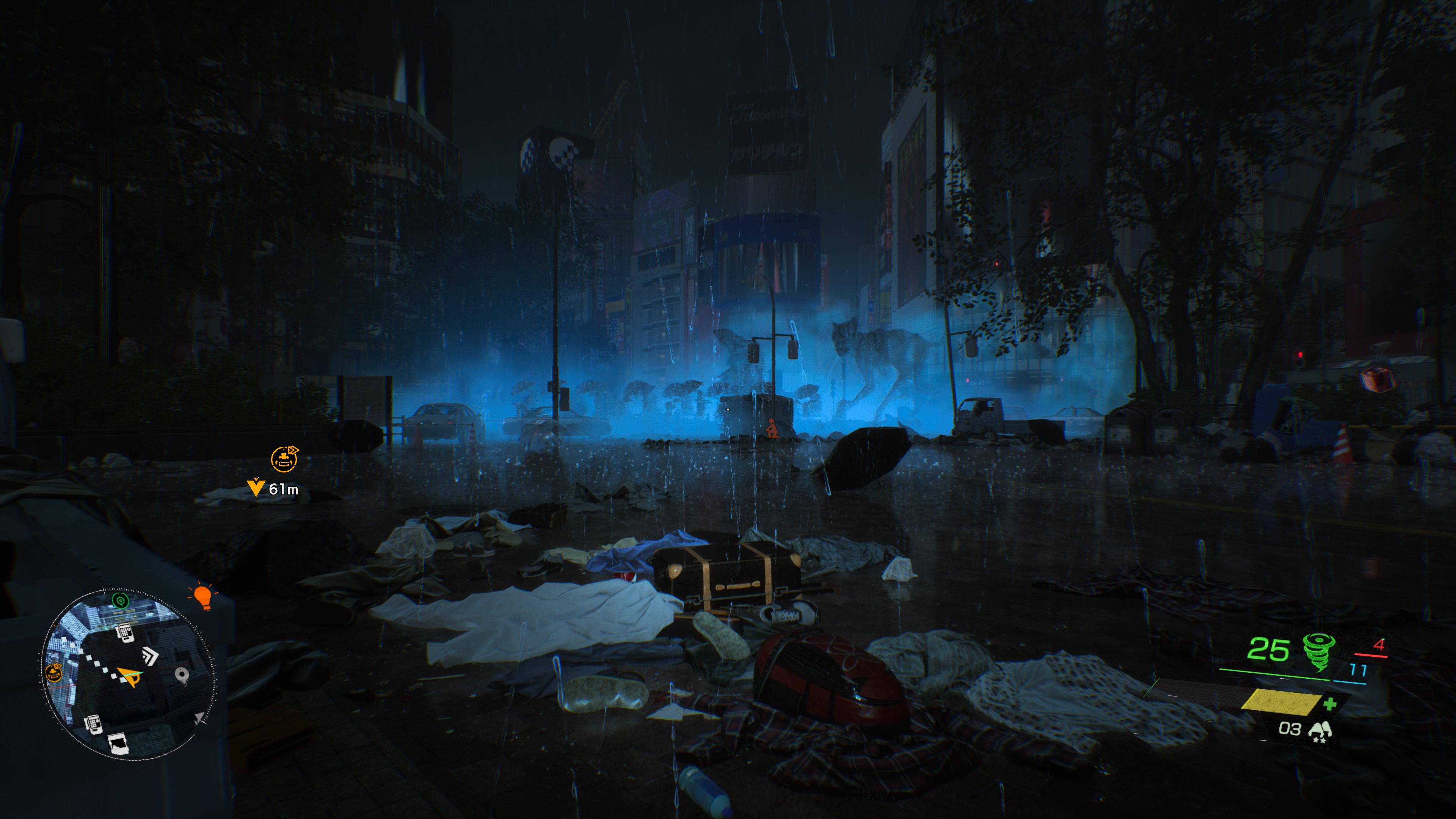 Nadmienić w tym miejscu muszę, że podobało mi się tempo utrzymywane przez grę. W zasadzie nigdy nie czułem bombardowania zadaniami pobocznymi i rzeczami do roboty. Misja fabularna, po niej odblokowuje się kilka historii pobocznych, możliwość „oczyszczenia” kolejnego kawałka mapy, trochę znajdek i znów można popchnąć fabułę. Był w tym rytm, który mi mocno siadł i sprawiał, że czas z grą mijał satysfakcjonująco. Niestety, co za dużo to nie zdrowo i tak pod koniec gry miałem już dosyć zbieractwa oraz szukania ukrytych znajdek — a musicie wiedzieć, że to pokaźna część gry. Kiedy na podcaście próbowałem wytłumaczyć, czym jest Ghostwire Tokyo, powiedziałem, że to shooter, co słusznie nieco zakłopotało Anię, która również w tytuł grała. I choć podtrzymuje moje zdanie, że gra ma dużo elementów strzelanki, to również zgodzę się, że sporo tutaj z symulatora chodzenia. Większość czasu w grze spędzamy pieszo, przemierzając świetnie zbudowaną dzielnicę Tokio. Wchodzimy w alejki, skaczemy na wysokościach i liżemy ściany, aby odnaleźć pokrywane sekrety. A jest ich tutaj bardzo, BARDZO dużo. Od gangu szopów, którego przedstawiciele poukrywali się jako przedmioty otoczenia, ale nie ukryli ogonów, więc jeśli widzimy na chodniku hydrant z futrzastym ogonkiem, wiemy, że to jeden z nich. Do tego w grze są dziesiątki przedmiotów nawiązujących do kultury Japonii, które odkupią od nas lokalni sprzedawcy i kolekcjonerzy zabytków. Zastanawiacie się, jak to możliwe, skoro wszyscy ludzi zginęli? Otóż skoro po mieście szukamy szopów, to nie powinno was zdziwić, że sklepy i stragany przejęły…koty, a dokładnie kocie yokai. Zwierzęta zresztą są istotną częścią gry, albowiem nasz bohater potrafi czytać w myślach napotykanych po drodze bezpańskich psów i kotów. Ci pierwsi po otrzymaniu od nas jedzonka, zabiorą nas w ciekawe miejsca lub wykopią trochę grosza z chodnika. Natomiast koty to miejscy konfidenci, którzy np. zdradzają nam, że w okolicy ukrywa się przebrany szop czy inny yokai. Wisienką na torcie zbieractwa w tytule są dusze zabitych w trakcie ataku terrorystów, mieszkańców dzielnicy. Jest ich bowiem ponad dwieście tysięcy, jednak zanim dostaniecie zawału, szybko wyjaśniam, że pojedyncza zebrana dusza, redukuje ten licznik o stu do tysiąca. W zależności, czy dusza znaleziona została w alejce, dobraliśmy się do niej na dachu, trudnodostępnego wieżowca czy wymagała od nas nieco zachodu – jak chociażby dostarczenie papieru toaletowego do publicznego szaletu, ponieważ właściciel owej duszy w trakcie śmierci walił dwójeczkę bez papieru, przez co nie mógł pogodzić się z odejściem, zanim go nie otrzyma.