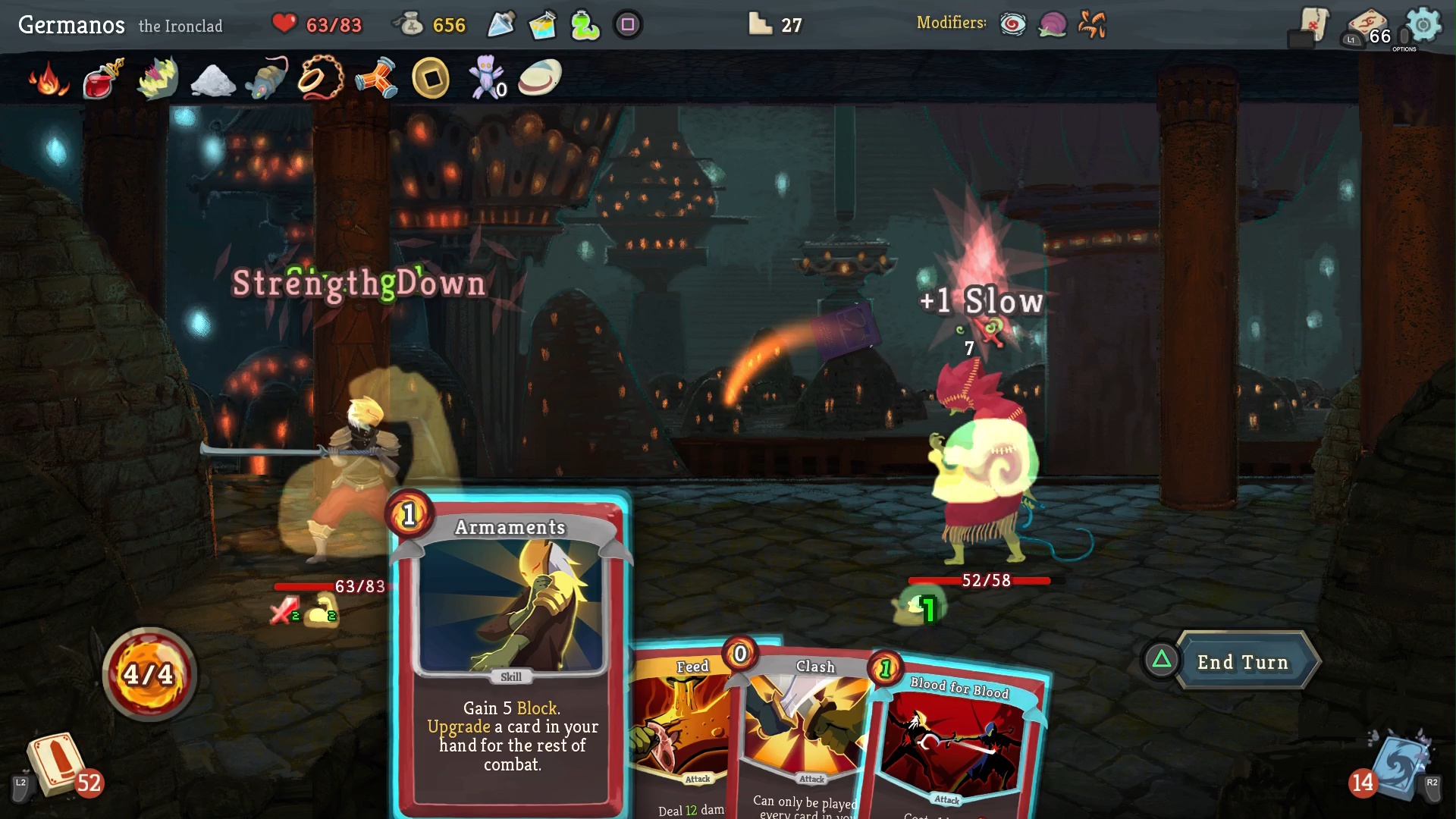 Podoba mi się prostota rozgrywki z perspektywy systemów, albowiem o niewielu rzeczach musimy pamiętać. Wszystko jest widoczne na ekranie. Przewidywane obrażenia, kolejny ruch przeciwnika, dostępne mikstury, nałożone statusy oraz działające relikty. Każdy z tych elementów możemy podzielić i przeczytać bardzo dokładny opis działania – gameplay w swojej istocie jest przyjemnie prosty w opanowaniu, co nie oznacza, że gra jest prosta. Natomiast próg wejścia do niej jest niezwykle niski i jeśli tylko jesteście graczami nieuciekającymi przed używaniem w grach szarych komórek, to odnajdziecie się w Slay The Spire błyskawicznie. To chyba element, który najbardziej mi się spodobał w grze. Jak prosto się w niej odnaleźć oraz jak wszystko jest tak zapraszające, że można całą swoją uwagę poświęcić na szukanie synergii naszej talii oraz taktyki, która przy obecnych kartach, da nam zwycięstwo. Większość czasu z grą spędziłem na telefonie, grając przez Remote Play, czy to będąc w łóżku, na sraczu, czy w biurze na sraczu. Bezproblemowo wchodzi się do zabawy, ale niełatwo się z niej wydostać, ponieważ jak najbardziej pojawia się rogalikowy syndrom: „jeszcze jednego podejścia” – oczywiście nie w pracy, tam to szybciutko gierka i wyłączamy. Z tego też powodu spędziłem w grze…choć przyznam, że jak sprawdziłem dane, to nie mogłem uwieżyć – ponad sześćdziesiąt godzin. Dla porównania Hades, którego wyższość w kontekście wartości produkcyjnej nie da się zanegować, zjadł jedynie dobę mojego życia. Slay The Spire jest tym samym w moim topie godzin spędzonych w grze, w tym roku. Zaczynając zabawę, w życiu bym tego nie przewidział, a „obwiniam” za to właśnie przystępność zabawy i bardzo szybką pętlę kolejnych podejść. Jak nie idą nam karty, to nie idą i szybko skończymy. Kolejne podejście rozpoczynamy błyskawicznie po ostatnim.