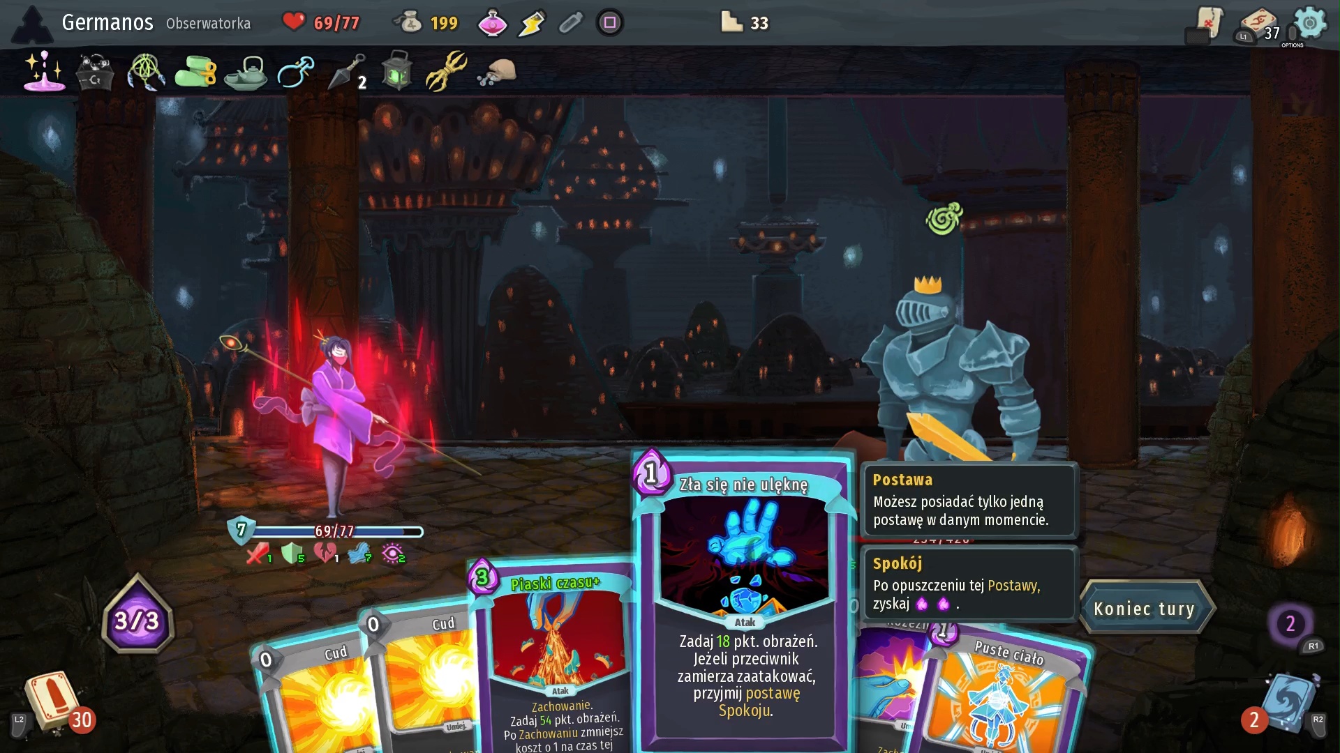 Przyznać jednak muszę, że ćwierć tego pochłonęła mi ostatnia, czwarta i jednocześnie dodatkowa postać w repertuarze bohaterów – Watcher. Obserwatorka to kolejna bardzo ciekawa postać, której rozgrywka opiera się o postawy: furii, spokoju i boskości. Grało mi się nią cholernie dobrze, aczkolwiek nie potrafiłem zbudować talii na tyle dobrej, by ukończyć grę. Innymi postaciami, co już wspominałem, bez problemu docierałem do napisów końcowych, gdy już udało mi się opanować taktykę pod ich talie. Nie dotarłem jednak do zakończenia ukrytego, prawdziwego, do którego osiągnięcia potrzebne są specjalne klucze. Te pojawiają się jako nagroda opcjonalna w różnych momentach przejścia i musimy wybrać, np. nowy relikt, czy klucz bez żadnych bonusów. I pewnie grałbym dalej, gdyby nie mój ciąg ku kolejnym napisom, ku kolejnemu ukończonemu tytułowi. Nie no. Serio. Sześćdziesiąt jeden godzin – wciąga po uszy! Miejcie to zatem na uwadze przed zabawą, ale warto.