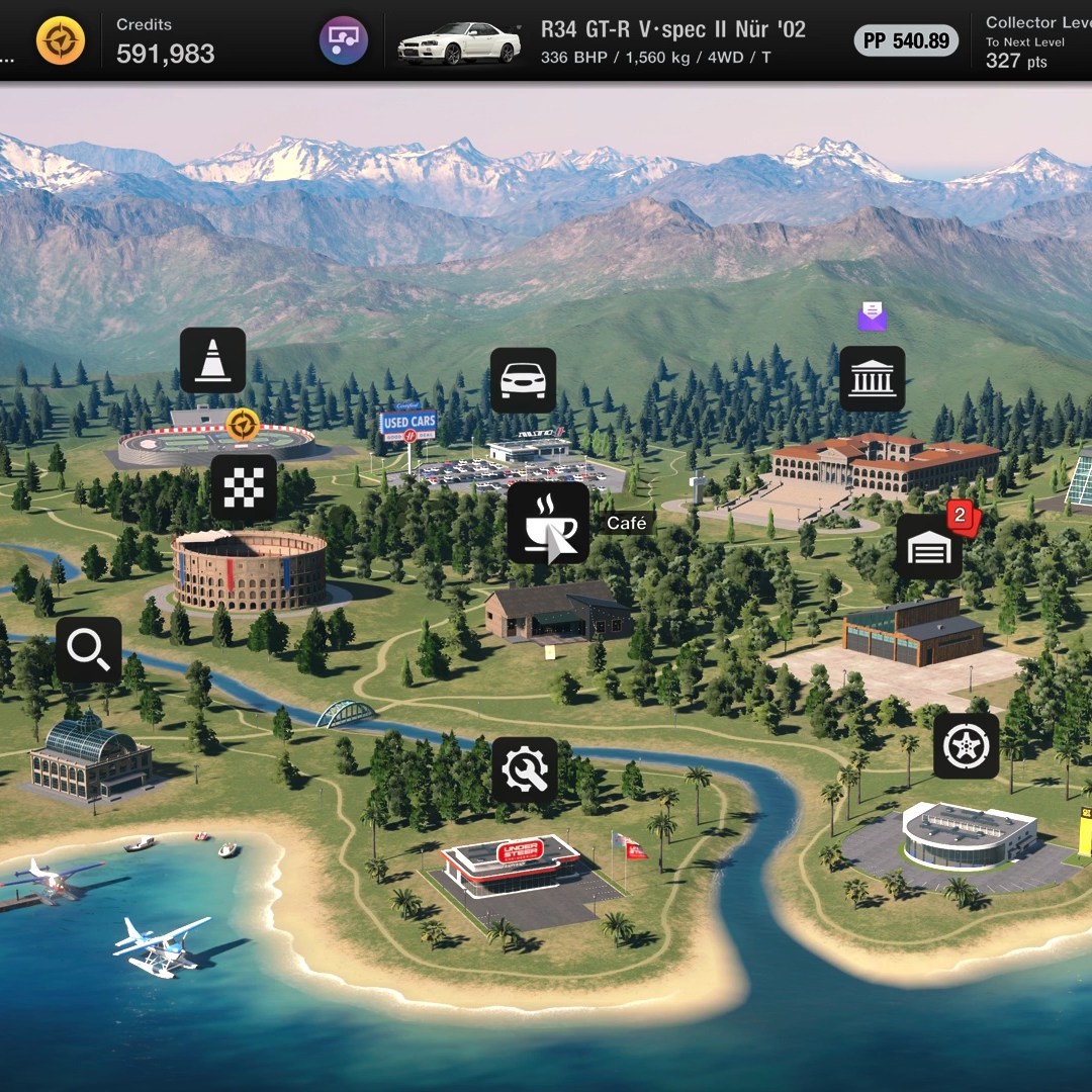 Ekran głównego menu to znów mapka, co powinno uderzyć w czułe miejsca fanów i jest nawiązaniem do najlepszych odsłon serii, jak np. część czwarta z czarnulki. Z niej mamy dostęp do wszystkich sposobów zabawy, a przechodzą przez nią przedstawię całą grę. Pierwszą ikoną z lewej są Scapes, które wracają ze wszystkimi cechami, jakie znamy z poprzednich odsłon. Dla osób, które nie wiedzą czym Scapes są: to rozbudowany tryb foto, który umożliwia nam fotografowanie samochodów w przepięknych sceneriach z całego świata. Największe i najbardziej znane miasta. Lokalizacje ikoniczne od strony geografii, turystyki, czy motoryzacji. Nie wiem, ile dokładnie scenerii jest w grze, jednak jestem bardziej niż pewien, że idą pod tysiąc. Szczególnie że wraz z aktualizacjami do gry trafiają nowe. Graczom jednoczenie oddane zostaje dużo ciekawych opcji, przełączników, filtrów itp., aby każdy domorosły fotograf mógł zbudować idealną scenę z samochodem w roli głównej. I choć sam nie jestem zbyt dobry w te klocki, to widząc jakie cuda wykonują inni gracze, wierzę w moc Scapes. Z tego miejsca warto przejść do punktu o nazwie „Showroom”. Nie tylko dlatego, że jest tuż obok na mapce, ale ponieważ to tutaj znajdziemy cały content, jaki stworzony został przez graczy i udostępniony społeczności. Jak sama nazwa wskazuje, znajdziemy tutaj wszystko, czym inni gracze chcą się pochwalić globalnej społeczności Gran Turismo. Od scenek, fotek z wyścigów, powtórek, aż po kreacje dla nadwozia samochodów, kombinezony i kaski kierowców. I niezależnie od wspomnianego rodzaju dzieła, tworzonego przez innych graczy, wszystkie potrafią absolutnie zachwycić – a już stanowczo to, co wyrabia się z karoserią aut.