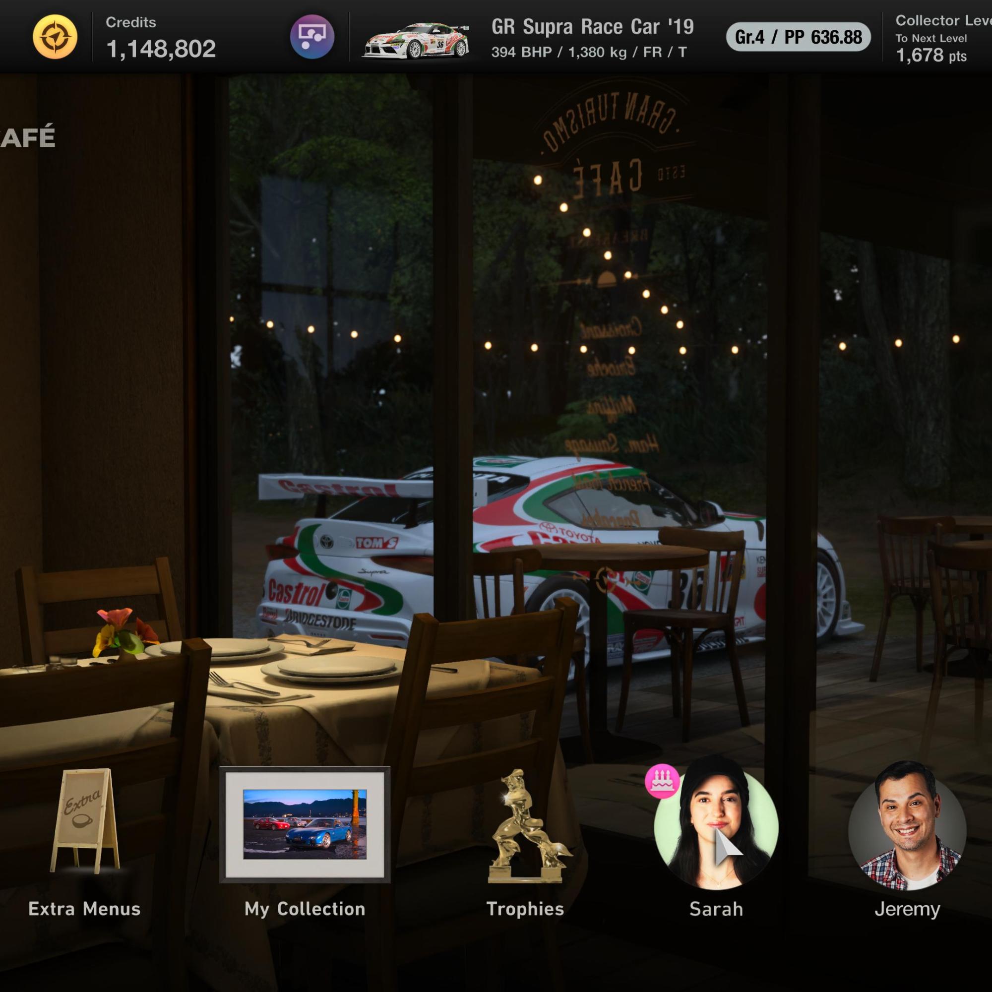 Zabawa offline zaczyna się od licencji, jak zresztą miało to miejsce od korzeni serii. Dla osób, które nie grały we wcześniejsze odsłony: licencje to coś w rodzaju egzaminów prawa jazdy. Od podstaw hamowania, pokonywania zakrętów, serii wiraży, aż po okrążenia, w których na czas będziemy musieli połączyć poprzednie lekcje. Choć brzmi to dziwnie, to uwielbiam je pokonywać, zdobyć złote pucharki, sprawdzać się z wynikami znajomych i odbierać nagrody za pokonanie wszystkich testów. Szczególnie rajcownym osiągnięciem jest ostatnia licencja, oznaczoną literą S i składającą się z najbardziej wymagających czasówek. Zdobycie jej to prawdziwe osiągnięcie, tak było w każdej z części i jest również tutaj. A jeśli tych wyzwań będzie wam mało, to są jeszcze misje, dostępne z punktu mapy o tej samej nazwie. To zbiór zadań podlegających na np. przejechaniu odpowiedniego dystansu na jednym baku, wygraniu wyścigu w jednym okrążeniu, startując z ostatniego miejsca czy zmagań typu drift i drag race – ćwierć mili, bez kontroli trakcji i na manualnej skrzyni biegów, to dopiero wyzwanie. Ciekawostka dla osób szukających nieco zabawy, ale też i solidnego wyzwania poza zabawą sieciową. World Circuits to natomiast serce ścigania się w Gran Turismo 7. Podzielone na trzy obszary, Amerykę, Europę oraz Azję i Oceanie, mieści wszystkie tory z gry. Na każdym torze umieszczone zostały wyścigi tematyczne, wśród których znajdują się np. wyścig samochodów z napędem na przód, samochodów typu muscle car, dla tych z turbiną, dla tych stworzonych w latach 80 czy pochodzących z Niemiec. Wiecie, o co chodzi. Jeżdżenia jest dużo. Torów jest od groma, a te predefiniowane wyścigi to tylko ułamek oferty GT7 dla jednego gracza. Każdy tor możemy masterować, podobnie nieco do licencji – najpierwej pokonujemy sektory na czas, a na koniec walczymy z czasem pełnego okrążenia. Możemy sami stworzyć nasz własny wyścig, dobierając parametry związane z przeciwnikami, warunkami na torze, liczbą okrążeń, a gra wypluje nam nagrodę za zwycięstwo. Jest też możliwość śrubowania okrążeń w pojedynkę, jak i tryb drift, aczkolwiek jestem w tym tak słaby, że nie sprawdzałem go zupełnie – drifting występuje we wspomnianych misjach, więc piszę z doświadczenia. A jeśli nie chce się wam kombinować, to Arcade Race zapyta was o poziom wyzwania i rzuci od razu na tor. Wszystko, co oferowały poprzednie odsłony i z nawiązką, jednak najlepsze skrywa kawiarnia.