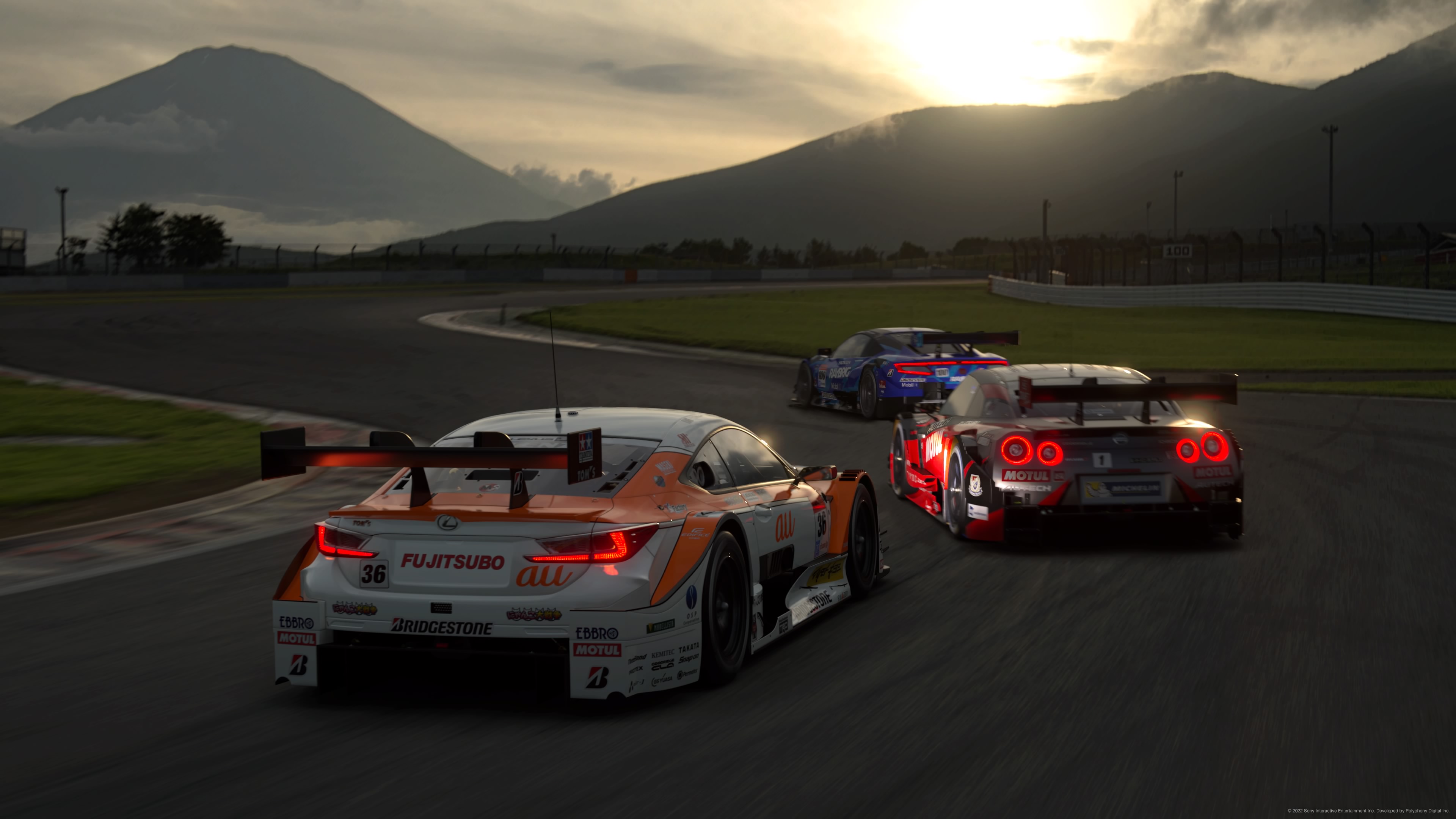 Najbardziej wyraźnym natomiast aspektem Gran Turismo, przy użyciu którego gry serii wyrażają uwielbienie dla świata samochodów, są oczywiście one same, a przede wszystkim to jak się one prezentują. Bez spoglądania na moje recenzje poprzednich GT, jestem bez mrugnięcia okiem w stanie wam powiedzieć, co napisałem o ich warstwie wizualnej. Na pewno pojawiło się tam stwierdzenie, że Polyphony Digital zawsze stara się podnosić poprzeczkę dla tego, co rozumiemy przez grafikę w grach wyścigowych. Samochody z każdą kolejną odsłoną zyskują miliony polygonów, dzięki którym wyglądają oszałamiająco i wręcz namacalnie realnie, i pomimo zmian generacji – to zawsze prawda. Zatem nie napiszę, że i tym razem znów mógłbym to napisać. Screeny mówią więcej niż jakiekolwiek słowa opisujące grafikę w grze, więc sami widzicie. Z twardszych argumentów za osiągami wizualnymi mogę nadmienić, że Gran Turismo 7 działa w rozdzielczości natywnej 4K oraz utrzymuje stabilne sześćdziesiąt klatek na sekundę. I choć dostępne są dwa tryby zabawy, faworyzujący klatkarz lub ray-tracing, to przyznam, że pomimo przełączania się pomiędzy nimi, nie zauważyłem większych różnic. Tytuł ogrywam na OLEDzie Sony, więc takie rzeczy jak HDR wciąż robią fenomenalną robotę. Chwilę warto poświęcić się nad odbiciami, czy też refleksami, czy po prostu ray-tracingiem, który pomimo występowania jedynie w trybie Scapes oraz powtórkach wyścigów, zrzuca szczenę na podłogę. Polyphony Digital pracuje na autorskim silniku i z przyjemnością obserwuje się jak z odsłony na odsłonę podnoszą jego możliwości, przez tak wiele iteracji. W grze występuje niezwykle udany cykl dnia oraz nocy, który przy wspomnianym wcześniej HDR i wyraźnej poprawie jakości foliarzu wokół tras, potrafi zafundować pamiętliwe momenty w trakcie wyścigów. Oczywiście ścigamy po torach wyścigowych, czasem żywcem wziętych z palety autentycznych tras świata, a innym razem zrodzonych z kreatywności twórców, więc jeśli ktoś preferuje klimat ścigania się po bezdrożach Meksyku czy ulicach miast, których nawierzchnia nieustannie się moczy i świeci jak psu jajca, to może się czuć rozczarowany „nudą” wokół torów. Natomiast dorośli powinni być zadowoleni. Padający deszcz i warunki atmosferyczne, choć wyglądają autentycznie i przekonywająco, to mam wrażenie, że ani Polyphony Digital, ani nikt inny, nie zdetronizował w tym jeszcze Drivecluba.