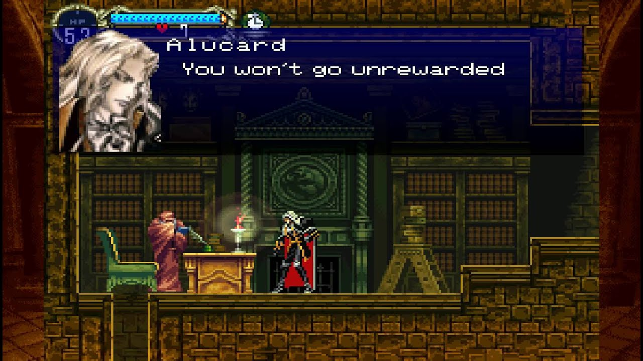 To znaczy, fabularnie w grze nie dzieje się za wiele. Akcja gry przenosi się mocno w przyszłość, a my wcielany się w Alucarda. Syna Draculi, który po tym, jak zamek jego ojca znów pojawił się w świecie ludzi, rusza wyjaśnić jego ponowne zagrożenie dla świata. Dla tych z was, którzy nie znają zupełnie uniwersum Castlevanii, polecam animacje na Netflix, gdzie w pierwszym sezonie wyjaśnione są jego początki i genezę zagrożenia Draculi dla ludzi. Dla nas grających w Symphony of the Night właściwie liczy się to, co napisałem o Alucardzie i tyle. O ile zabieg z rozpoczęciem gry od pseudo walki z bossem, był dziwny, tak później gra robi dużo ciekawych rzeczy czy trafionych pomysłów. Do zamku Draculi wchodzimy jako Alucard, a więc przepotężna istota zrodzona z miłości pomiędzy wielkim wampirem Drakulą oraz ludzką matką. Gra nie posiada specjalnych zwrotów akcji czy wyszukanych wątków fabularnych, ale posiada wiele możliwości zakończenia gry. Jednak to, jakie zakończenie zostanie nam ukazane, nie zależy od wyborów moralnych, a tym jak bardzo wnikliwie przeczeszemy mury, komnaty, poddasza, lochy, piwnice i podziemia zamku.