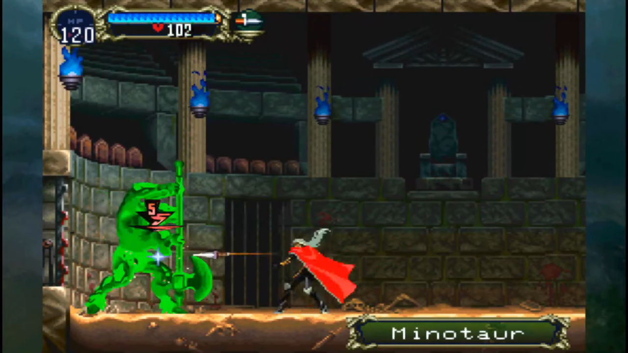 W pierwszych minutach gry praktycznie przez kolejne pomieszczenia przelatujemy, zabijając wszystko, co stanie na naszej drodze od jednego cięcia mieczem. To jednak szybko się kończy, albowiem Śmierć, będący mieszkańcem zamku, odbiera nam wszystkie moce, przedmioty użytkowe i ekwipunek. Następnie gra każde nam wrócić się tym samym korytarzem, ale to my tym razem jesteśmy na strzał dla wrogów. Gra w tym momencie staje się kilkukrotnie trudniejsza. Przeciwnicy, których wcześniej nie zauważaliśmy, stają się śmiertelnie trudni. A jak się okazuje później, gra mniej lub bardziej kontynuuje ten schemat dawania i odbierania w bardziej subtelny, ale jednak podobny sposób. Z tego też powodu początkowo się odbiłem od produkcji, lata temu. Mamy właściwie jeden typ ataku, wykonywany w pozycji stojącej, kucającej lub w trakcie skoku. Alucard ma możliwość wykonania uniku w tył oraz używania magii, którą zbiera się jako przedmioty użytkowe na poziomach. Mamy bardzo mało życia, niewiele punktów many. Chwila, w której zostajemy nadzy, jest trudna i stanowi pewien test dla tego, czy na pewno chcemy brnąć dalej — grając zdecydowanie powinniście.