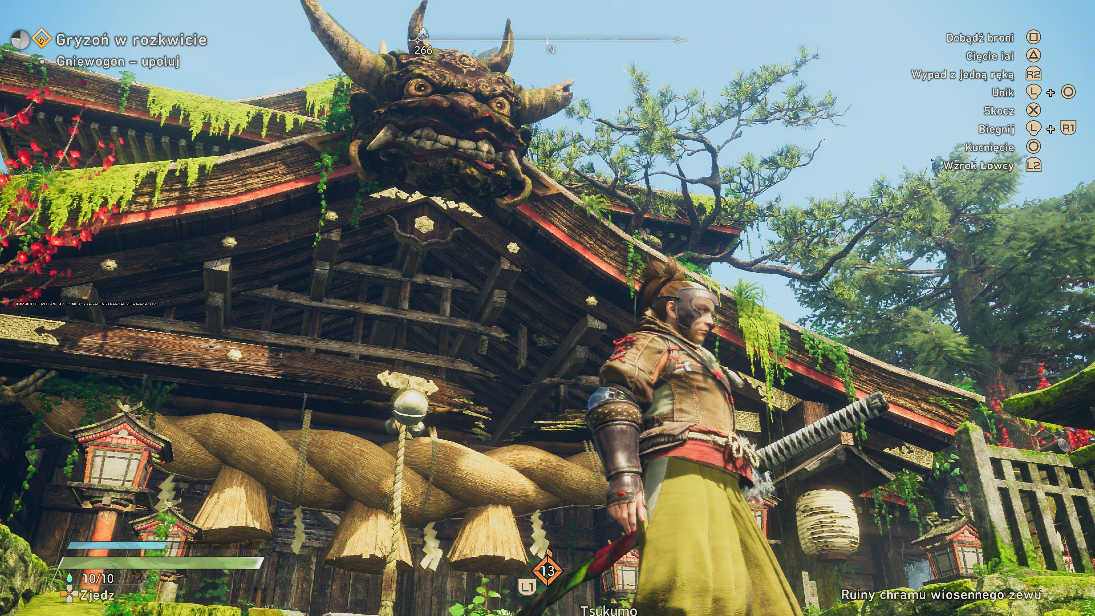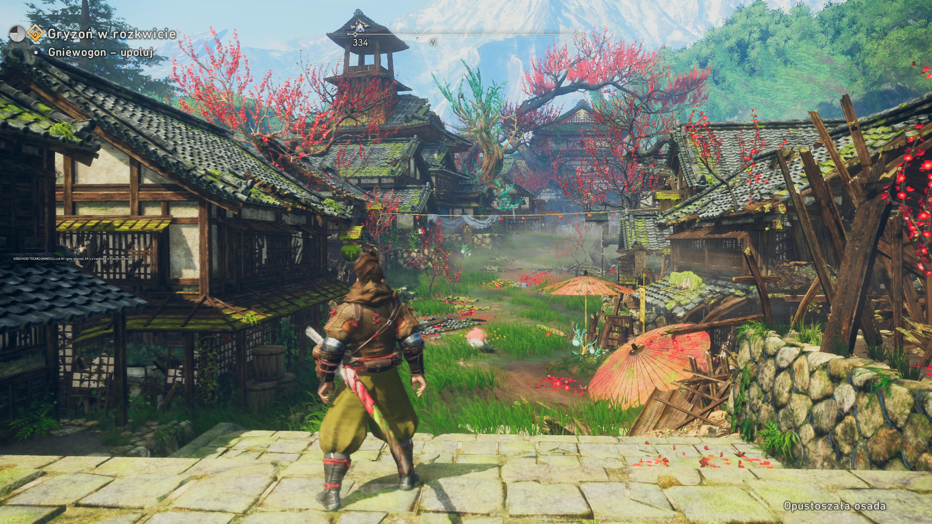 Podobną huśtawkę emocji odczuwam wobec oprawy wizualnej gry. Z jednej strony, albowiem, jak mocno przymrużymy oczy, albo przy krótkowzroczności zagramy bez okularów, to Wild Hearts prezentuje się bardzo okazale. Koncepcyjnie mocny klimat feudalnej japonii, połączony z klimatem plemiennym w postaci strojów inspirowanych zabijaną zwierzyną, może się podobać. Całkiem nieźle prezentują się twarzy postaci, modele oraz kemono. Poziomy robią wrażenie gęstością traw, krzewów oraz innych elementów środowiskowych. Zniszczone zamki z czasów samurajów oraz świątynie z tego samego okresu, zagrabione przez naturę – jest ładnie. Natomiast wystarczy założyć te okulary albo wytężyć wzrok, aby dostrzec, że same assety, z których lokacje są wykonane, sięgają generacji wstecz. Jak nie więcej. Sytuacji na pewno nie polepszyła możliwość wchodzenia w każdy zakamarek terenów polowania. Wild Hearts przez to sprawia wrażenie tytułu, który Koei Tecmo miało w szufladzie od dekady i gdy pojawił się amerykański pan z torbą pieniążków, udało się odkurzyć projekt i wypuścić go na rynek. Dzięki mocy nowych sprzętów, albowiem gra jest tytułem bez rozkroku generacyjnego, rozgrywka działa niezwykle płynnie, nawet jeśli na telewizorze dzieje się totalny rollercoaster. Z drugiej strony, czasy ładowania się lokacji to kpina, jeśli chodzi o tytuł stricte current-gen. Cieszy natomiast japoński dubbing i spolszczeniem w formie napisów. Mimo wszystko nie potrafię powiedzieć, że gra jest brzydka, tylko odsuńcie się trochę od TV i będzie dobrze. Można sobie za to zwiększyć głośność sprzętu grającego, bo muzyka utrzymana w klimacie Japonii feudalnej, ładnie komponuje się z częścią wizualną.