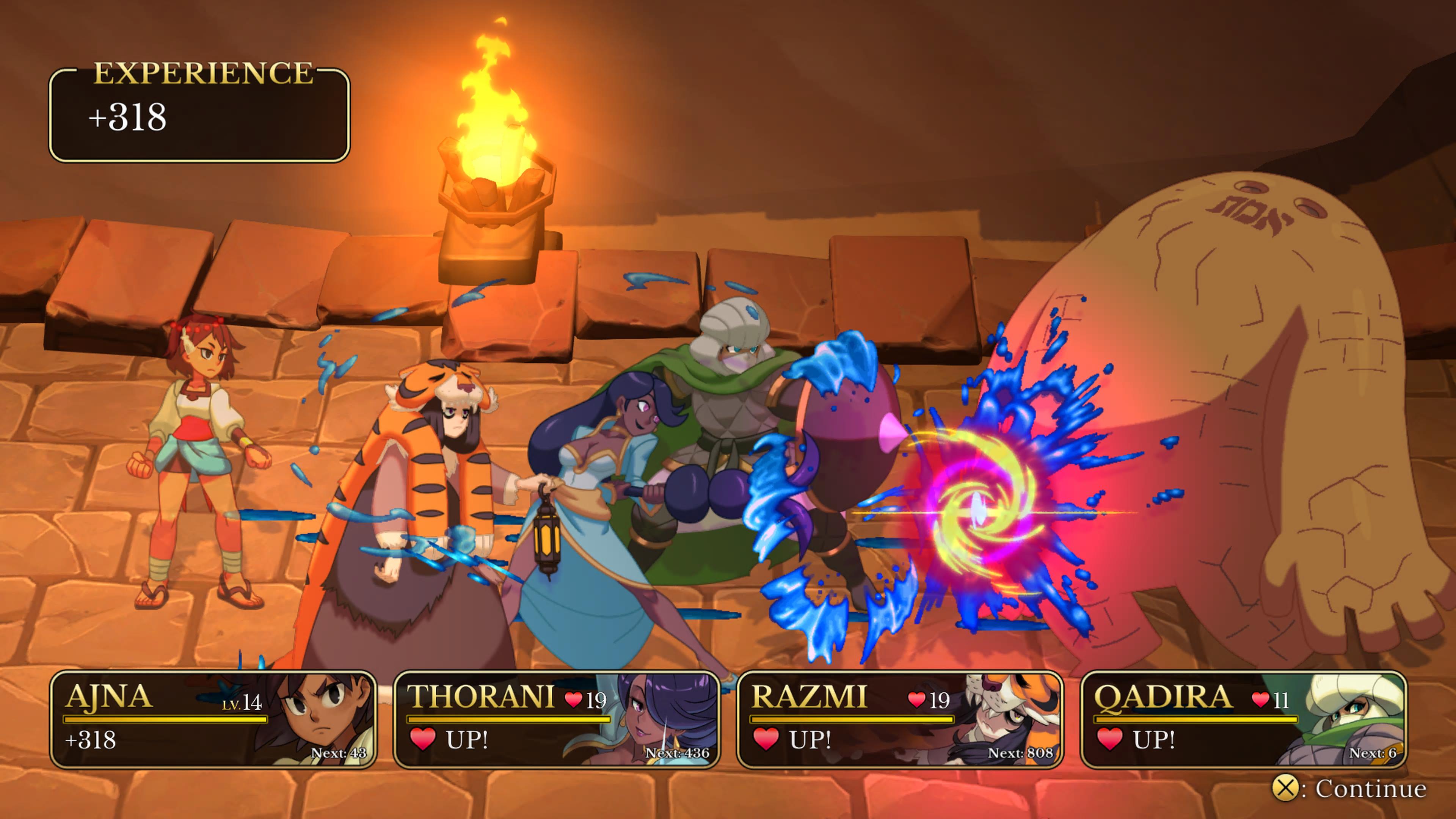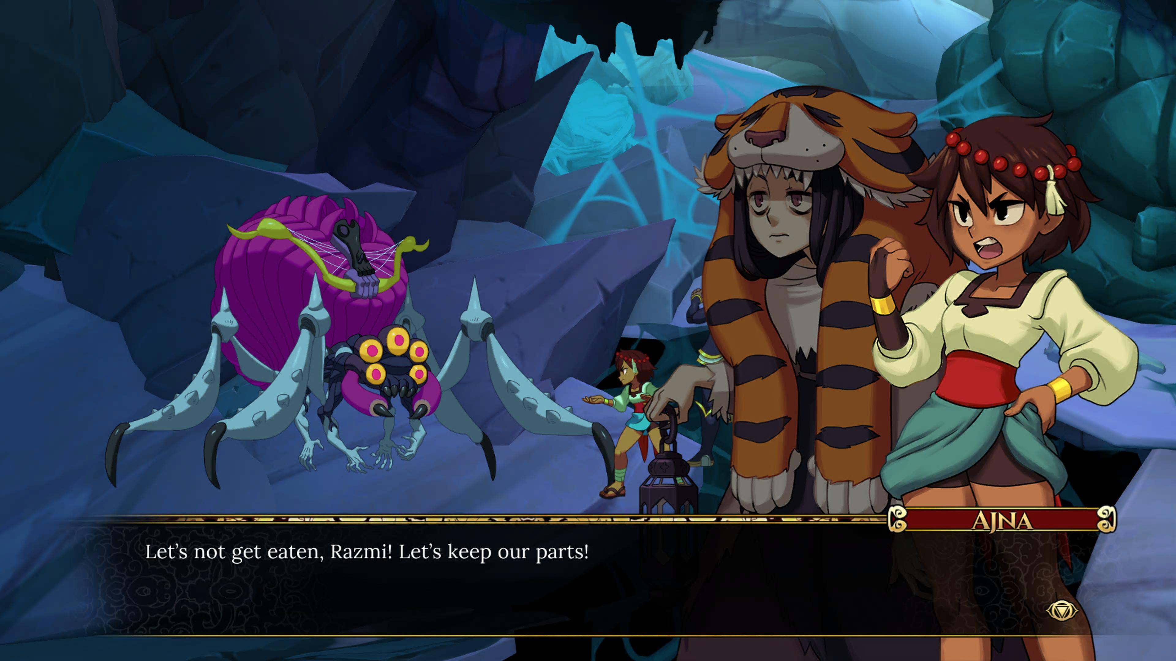 Bez wątpienia to Anja jest w centrum wydarzeń gry. Tylko nią sterujemy w trakcie podróży. Całość powieści obserwujemy z jej perspektywy. Od tragicznych wydarzeń, po podróż ku zemście i przemianie, jaką przechodzi. Na przestrzeni gry miałem mieszane uczucia, co do jej oceny. Z początku jej naiwność i bardzo, ale to bardzo prostoliniowe myślenie, były zabawne, ale po czasie zaczynało to denerwować. Jednak pod koniec znów mnie sobą kupiła, a to, w jaki sposób gra się zakończyła, sprawiło, że naprawdę ją polubiłem. W momentach, w których jej zachowanie mnie drażniło, przypominała mi mocno Monkey D. Luffy, którego też raz się kocha, a raz nienawidzi. Przez jej personę poznajemy wiele osób, które zdecydowały podążać z nią – w jej głowie. Mimo tego, że cel mają ten sam, to ich motywacje i przeszłość piszą inne karty. Czy to wojownik ze zniszczonego kraju, czy botanik pragnący poznać świat, wojownik o sprawiedliwość, czy wiedźma z mokradeł – każdy z nich jest absolutnie wyjątkowy. Od osobowości, aż po sposób walki. Natomiast wszystkich coś ciągnie do bohaterki. Co znów łączy mi się z One Piece i tym, jak budowała się załoga Słomkowych. Słuchając ich rozmówek i przekomarzania, można się szczerze uśmiechnąć. Ajna pukając do Tower of Wisdom, zapytała, czy zastała Wisdoma, czym mnie totalnie zniszczyła. Podobnie zresztą za każdym razem, gdy w dialogach pojawiała się szamanka Razmi – moja faworytka. Już to działa silnie na korzyść Indivisible, a w grze występuje całkiem udany zwrot akcji, którego naturalnie nie zdradzę, ale robi robotę.