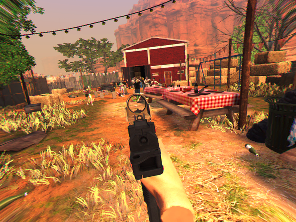 Pierwszą rzeczą, która bardzo szybko rzuca się w oczy – ta gra nie będzie polegała na straszeniu was. Menu początkowe gry to przyczepa kempingowa naszego bohatera. Poza możliwością rzucania i otwierania różnych przedmiotów, dla zabawy, jest w pomieszczeniu konsola, z wyglądu przypominająca łudząco poczciwego Pegasusa. Tryby gry to kartridże, które po umieszczony w konsoli, dają możliwość wyboru pomiędzy kooperacją i zabawą solo, pojawia się menu kampanii z wyborem trybu trudności, oraz stylu – broni jednoręcznej i dwuręcznej. Mimo gry na Aim Controllerze kampanię ukończyłem w trybie z pistoletami, a drugi tylko sprawdziłem na pierwszym poziomie. Dużej różnicy nie ma, to raczej kosmetyka i lepsza immersja dla posiadaczy kontrolera. Zatem już czuć od samego menu, że klimat będzie raczej luźny, co natychmiastowo kontynuowane jest po rozpoczęciu gry.