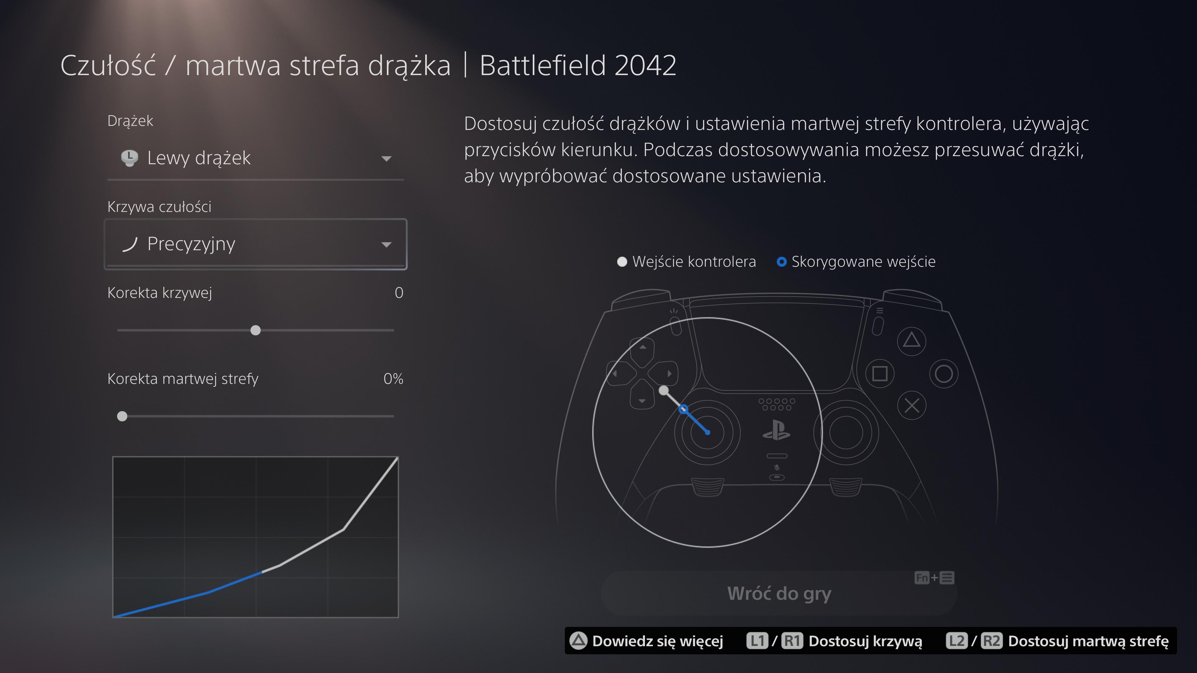 Profil pada to również charakterystyka działania analogów. Aby wytłumaczyć wam, o co chodzi, podam przykład ustawienia „Precyzyjny”. To ustawienie powoduje, że wrażliwość przy minimalnym wychyleniu celownik będzie poruszał się niezwykle powoli, natomiast jeśli wychylimy analog maksymalnie, to np. nasza postać obróci się natychmiastowo w pożądanym kierunku. Chodzi o to, że dzięki tym ustawieniom możemy ustawić wrażliwość analogów dla różnych stopni wychylenia gałki analogowej, co jest bardziej zaawansowane niż ustawienie wrażliwości analogów w ustawieniach gry. Przy czym należy pamiętać, że ustawienia gry i ustawienia w padzie się nie niwelują, a uzupełniają. Tutaj również jest możliwość ustawienia odmiennej charakterystyki dla każdego analoga.