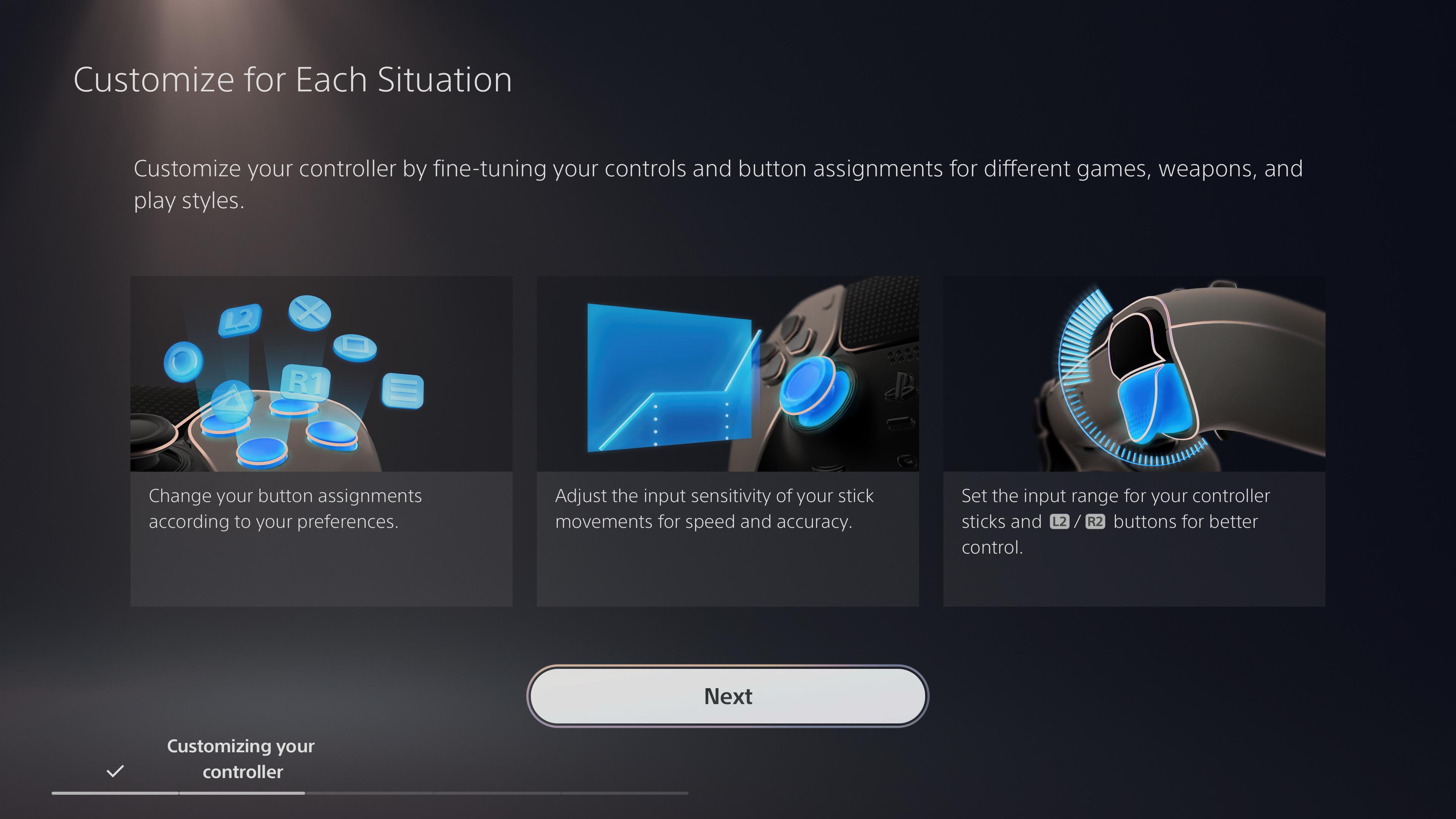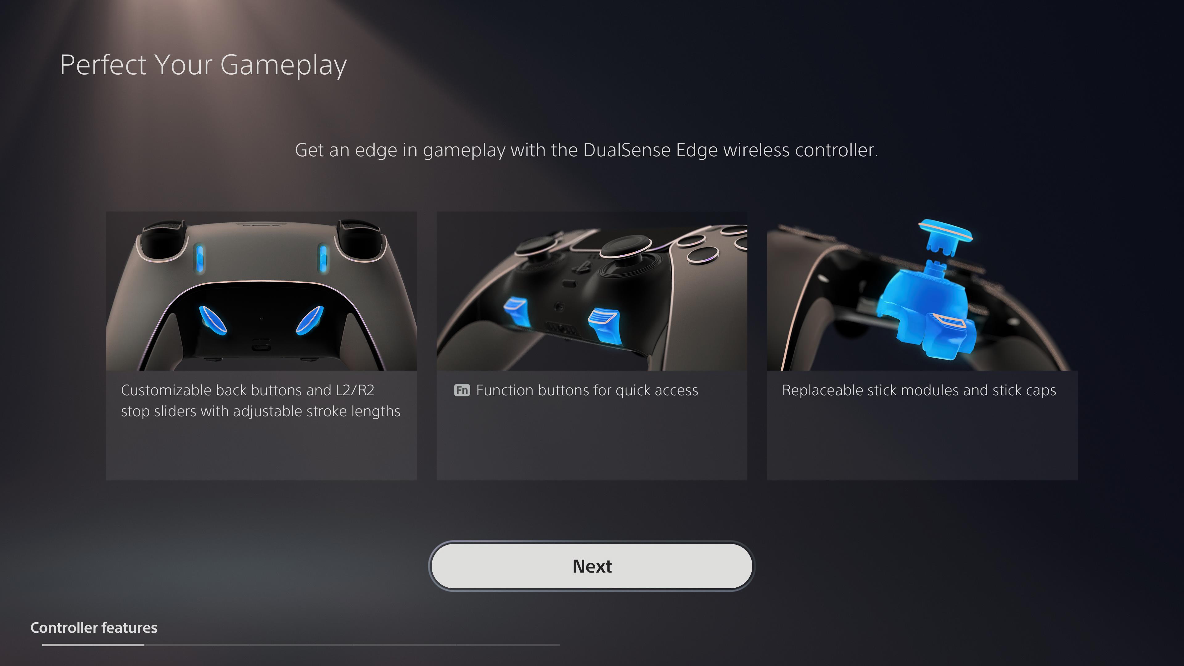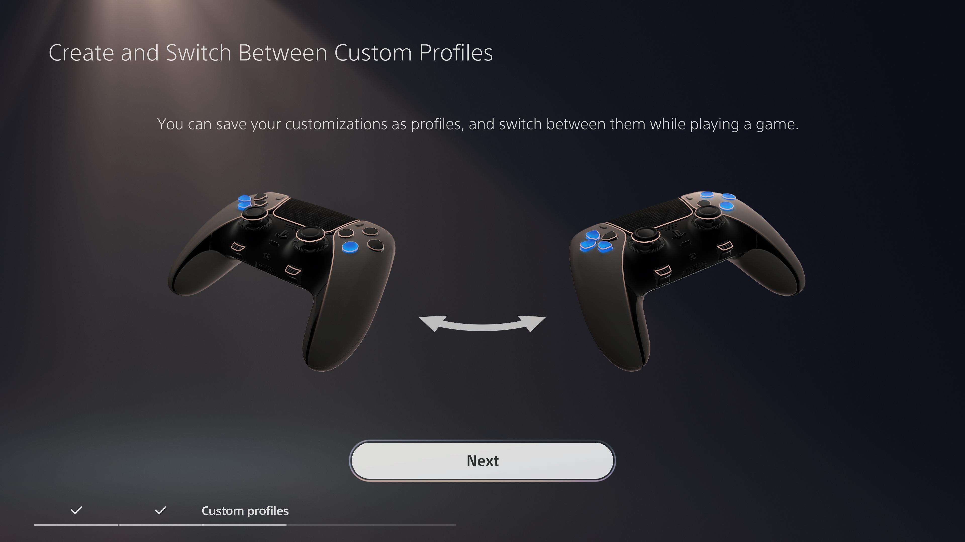 Natomiast pad i jego cechy to tylko połowa dobrobytu, jaki przynosi z sobą DualSense Edge. Pozostałe atuty sprzętu ukazująca się nam we wprowadzeniu, jaki zobaczymy na ekranie telewizora po podłączeniu pada do konsoli. Najważniejszym punktem jest możliwość budowania maksymalnie czterech profili na konsoli, które możemy bardzo szybko zmieniać dzięki klawiszom pod gałkami analogowymi (tak, ten wystający plastik to działający przyciski zmieniający profile).