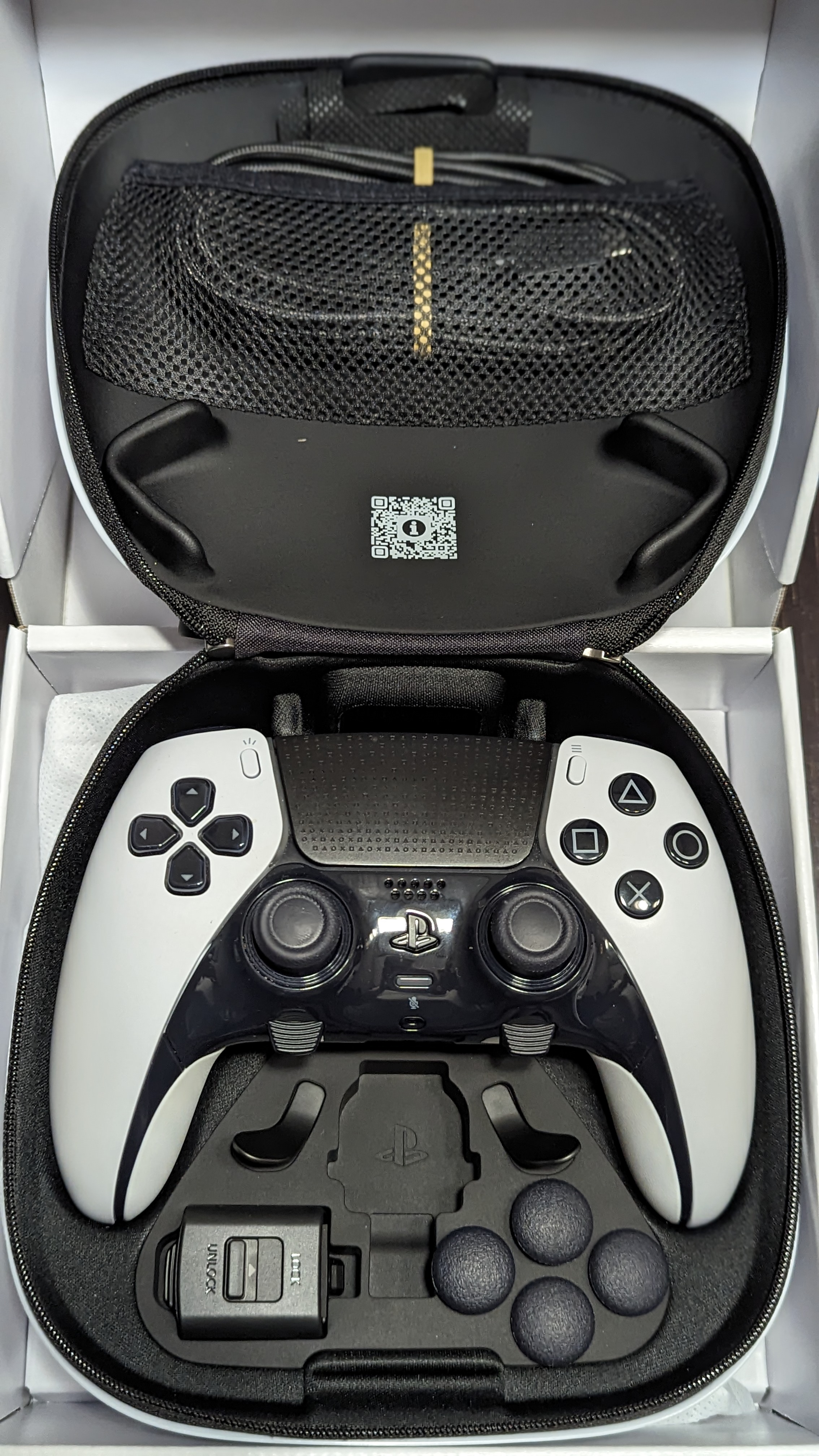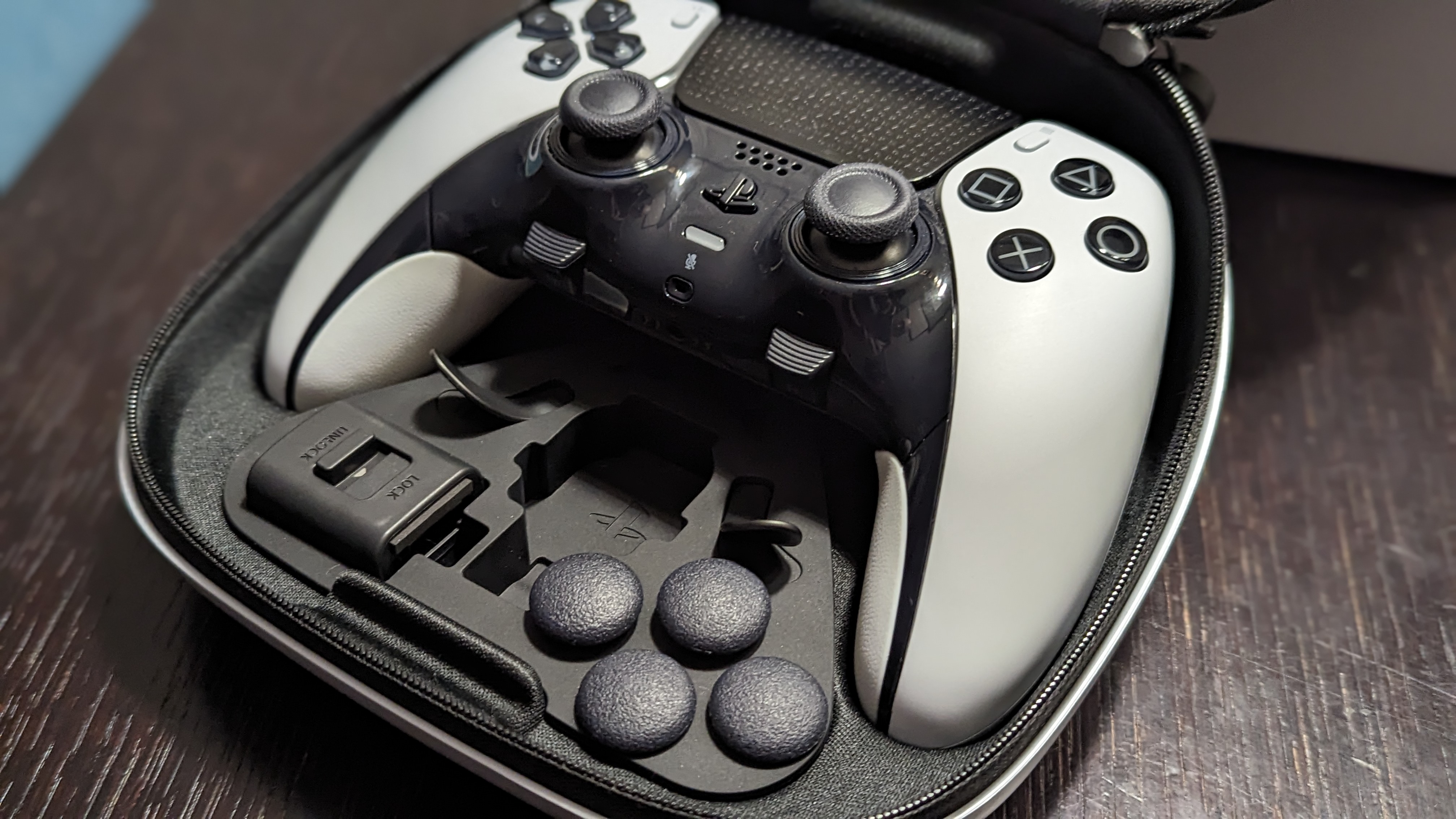 Tradycyjnie zacznijmy od rozpakowania kolejnej zabawki z logiem PlayStation w domu. „Na tym etapie serio zaczynam mieć problem z ukrywaniem fanbojstwa” – powiedziałem, zakładając czapkę zimową z logiem PS. O ile przeważnie o opakowaniu nie ma za wiele do powiedzenia, to przecież tutaj mamy do czynienia ze sprzętem klasy premium, więc w zestawie nie mogło zabraknąć futerału. Ten prezentuje się bardzo trwale. Plastik jest sztywny i powinien wytrzymać rzucanie bagażem przez ekipę lotniska, gdybyście wpadli na pomysł zabrania DualSense Edge na wakacje – jak to, nie robicie tak? Tak czy siak. Opakowanie skrywa pada, kabel USB-C z dodatkową blokadą, dwa zestawy tylnych przycisków (płaskich i wypukłych) oraz dwa zestawy grzybków analogów o różnych wysokościach. Futerał turystyczny może służyć również jako „stacja ładująca”, ponieważ w tylnej części znajduje się klapka, zamykana na rzep, przez którą można przeciągnąć przewód ładujący do pada. Wszystko siedzi na swoich miejscach bardzo sztywno, więc nie ma mowy o tym, aby poszczególne części zaczęły latać po futerale w razie towarzyszenia wam podczas przejażdżki kolejką górską. Jednak nie przyszliście tutaj, aby przeczytać moje opinie o opakowaniu, a padzie kosztującym grubo ponad dwukrotność ceny regularnego pada PS5. Argumentację ceny zacznę od samego pada, a następnie wspomnianych dodatków, w kolejności ich wymieniania wyżej.