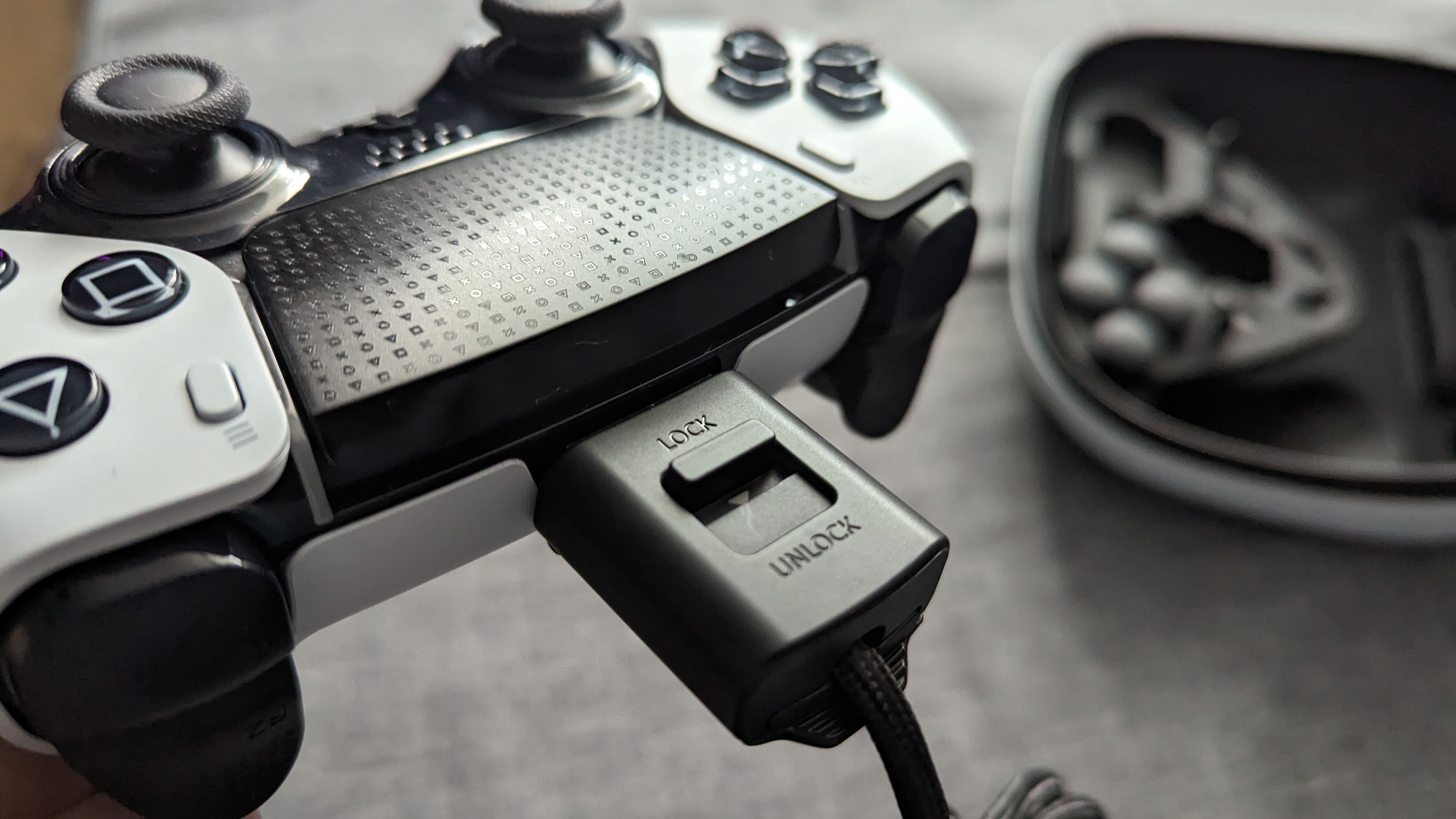 Wspomniałem, że w opakowaniu z padem był przewód USB-C, służący do ładowania pada oraz blokada. Z początku nie wiedziałem, o co chodzi z tą blokadą, ale dotarło do mnie, że to coś dla absolutnych świrów, dla których liczy się każda milisekunda responsywności pada. Wiadome jest, że kabel to kabel i o ile większość z nas pewnie nie wyobraża sobie granie z padem na kablu przez cały czas, jednak znajdą się osoby, dla których każda klatka animacji i jakakolwiek niwelacja input-lagu, ma ogromne znaczenie. Pada można po prostu podłączyć do konsoli „po kablu”, a następnie dzięki blokadzie, przewód z Edge połączyć na stałe. Nie ciągnąłem za niego zbyt gwałtownie, ale próbowałem użyć siły i trzyma się dzięki tej blokadzie przewód mocno pada. Nie będę korzystał z tego raczej nigdy, ale nie jestem też targetem.