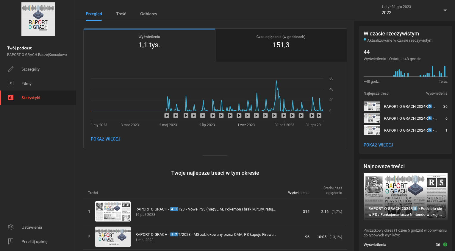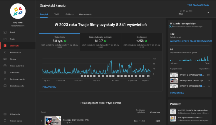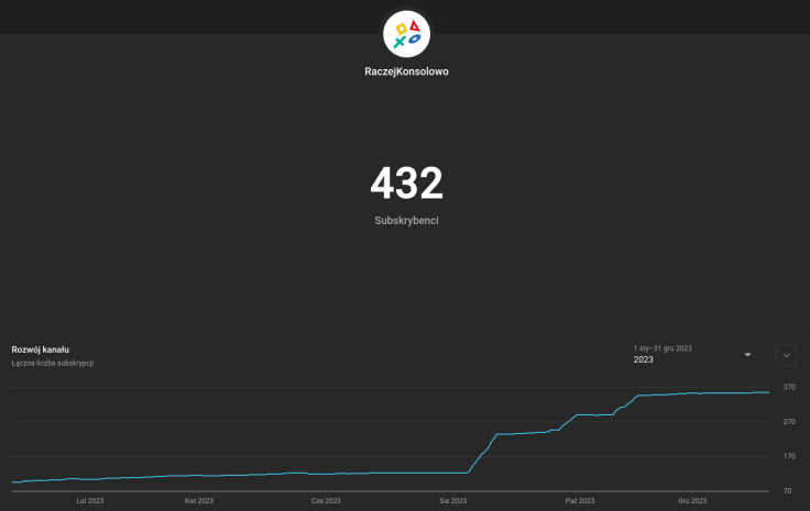 Odchodząc od materiału o Gran Turismo 7, to jestem zadowolony z kanału. Nie uderzam w trendy, a jednak regularnie grupa obserwujących sobie rośnie. 2023 był o tyle dziwnym, a nawet trudnym rokiem, albowiem kilka jego miesięcy spędziłem „na wygnaniu”, ponieważ remontowałem kuchnię (o czym już pisałem) i nie miałem dostępu do mojego „biura” – czyli monitora położonego na naszym stole jadalnym w salonie. Dużo materiałów z tego powodu mi się przesunęło. Liczę, że 2024 będzie spokojniejszy. Kanał również został wzbogacony o podcasty w formie wideo. Przeważnie są to grafiki z wizualizacją audio, aczkolwiek spoilercasty udało nam się nagrać przed kamerkami, więc możecie zobaczyć format docelowy, do którego dążymy, aczkolwiek nie na złamanie karku czy po trupach. Chciałbym, żeby zakładka Społeczność działała tam lepiej, ponieważ teraz to trochę taki zapomniany obszar kanału, a – moim zdaniem – o nieokiełznanym jeszcze potencjale. Wrzucam tam informacje o materiałach, robię nieco kros-platformowego marketingu pomiędzy blogiem, podcastem, a YouTube. To również miejsce, gdzie pojawiają się linki do zajawek agendy RAPORTU O GRACH.