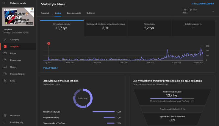 Trzynastego stycznia 2023 na kanał wrzuciłem recenzję Gran Turismo 7. I choć wiedziałem, że wyszedł mi całkiem solidny materiał, to nie przewidziałem, że stanie się on tak ważny dla kanału. Obecnie jego wyświetlenie to jakieś 2.7k, czym deklasuje wszystko, co znajduje się na kanale. Recenzja ta jest nieustannie w najczęściej oglądanych materiałach z ostatnich czterdziestu ośmiu godzin. Praktycznie wypada z tego rankingu. Spoglądając na dane subskrypcji użytkowników, możecie pewnie zauważyć, że w sierpniu coś się podziało i mocno dało kopa statystyką kanału – odpaliłem wtedy promocję wewnątrz YouTube, którą Google ledwie otworzyło na nasz (tak to rozumiem) rynek. Płacimy kwotę, wybieramy, ile dni ma trwać promocja, a Google Ads proponuje materiał ludziom, z częstotliwością zależącą od kwoty wpłaconej i okresu kampanii. Od tego eksperymentu, jeszcze trzy razy odpalałem podobne kampanie na różnych rodzajach materiałów, jednak żaden z nich nie załapał takiego wiatru w żagle, jak recenzja gry Polyphony Digital. Cieszę się nie tylko z powodu wyników, ale też z samego zadowolenia z materiału, ponieważ jeśli wierzyć komentarzom – podobał się!