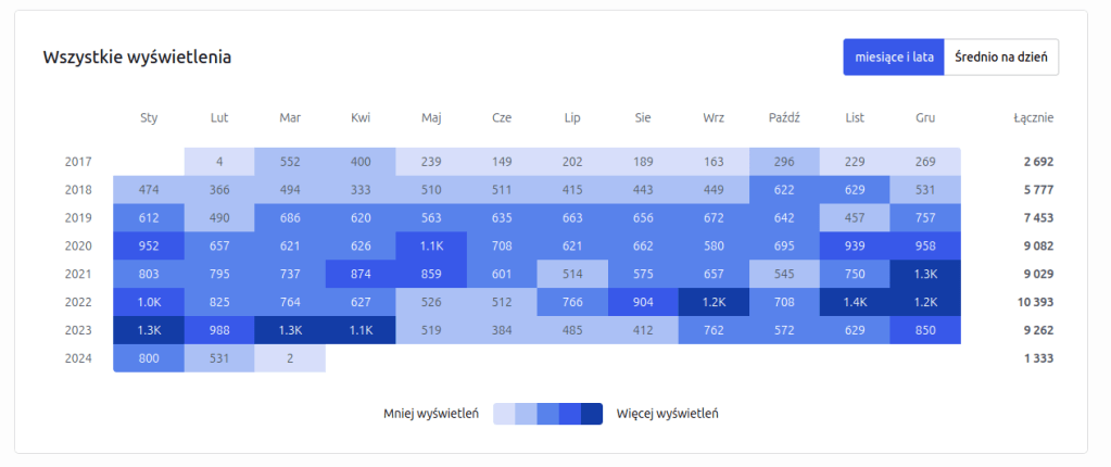 Chciałem napisać, że 2023 był pierwszym rokiem, w którym strona RaczejKonsolowo zaliczyła spadek odwiedzin, jednak podobna rzecz miała miejsce przy przejściu z 2020 na 2021, aczkolwiek spadek nie był tak znaczący, jak miało to miejsce w minionym roku. Rzucając okiem na liczbę opublikowanych wpisów, czy nawet zerkając głębiej do średniej liczby słów na wpis, to wyniki są bardzo zbliżone do tego, co miało miejsce w 2022. Zatem to nie wina mniejszej aktywności, która okazała się lepsza aniżeli moja percepcja czasu, jaki spędziłem nad wpisami na blog. Jak oceniam te liczby? Na pewno nie jest to budujące, a biorąc pod uwagę, że pierwszej miesiące 2024 nie wróżą poprawienia wyników bloga – nie jest różowo.